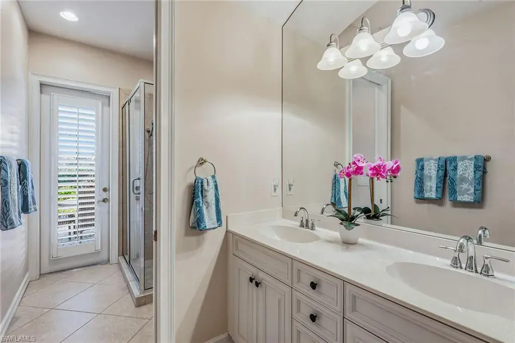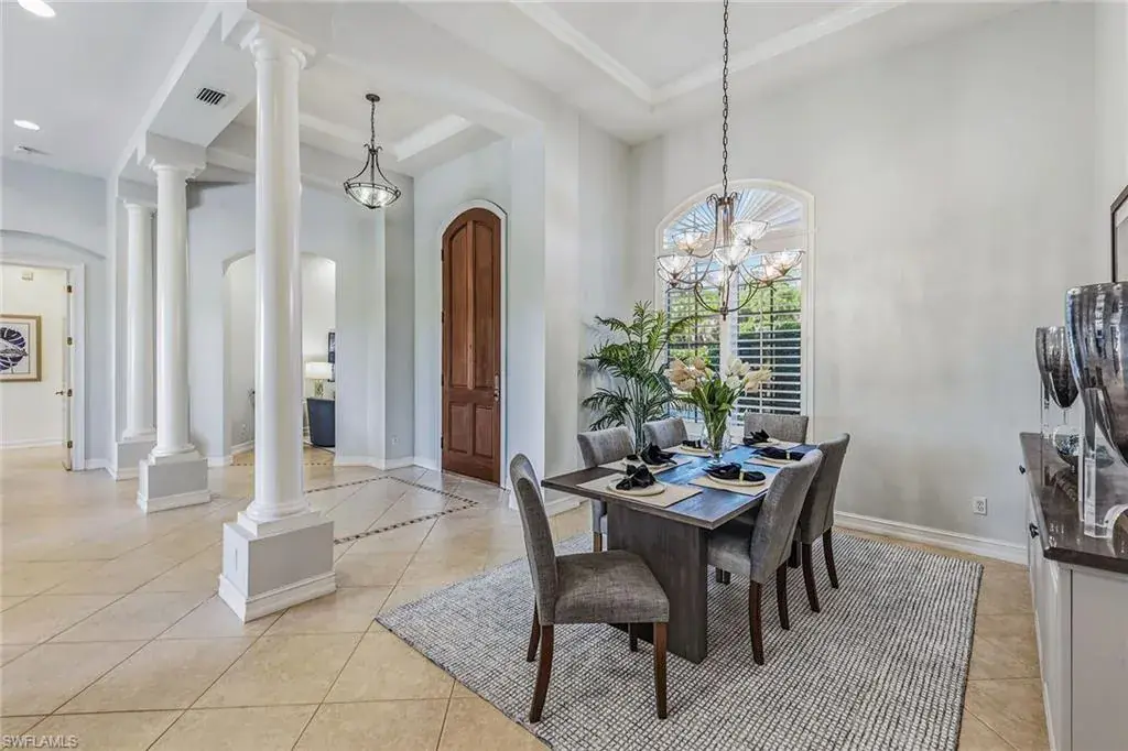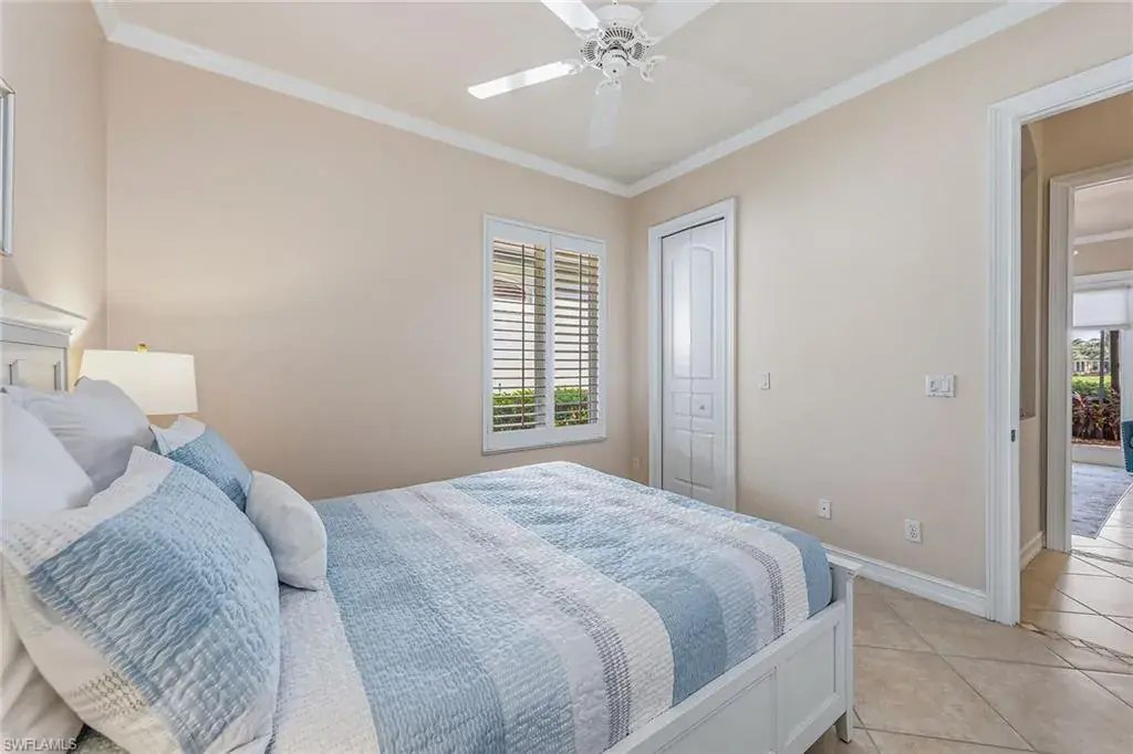Rarely available, this Mulberry Row residence offers breathtaking views of the 15th fairway of the Rookery golf course and water, capturing peaceful eastern sunrises over the manicured golf course and lake. Thoughtfully designed for comfort and elegance, this three-bedroom plus den, two-full-bath home with a two-car garage features low HOA fees, a 2018 roof, a CDD bond paid in full, and outstanding upgrades, including a Generac whole-house generator, gas tankless water heater, a security system, and two HVAC systems, with the main air conditioner replaced in 2024. The screened lanai is a serene outdoor retreat, showcasing covered outdoor living, a gas-heated spa, recessed lighting, all overlooking the sweeping golf course and lake views. With storm shutters and timeless curb appeal, this home is ideal for those seeking beauty and practicality, with the added flexibility to add a pool if desired. Inside, refined architectural details include diagonal 19-by-19-inch porcelain tile flooring, volume and tray ceilings, crown molding, arched walkways, recessed lighting and white plantation shutters throughout. The open kitchen is designed for functionality and style, featuring white cabinetry, white quartz counters, a pass-through window to the lanai, under-cabinet and above-cabinet lighting, and stainless appliances, including a newer refrigerator with icemaker, wall oven, microwave, dishwasher, and an elite four-burner induction cooktop with a newer hood. Additional kitchen upgrades include a Blanco Solon in-counter compost system, enhancing convenience and sustainability. Adjacent to the kitchen, the formal dining area features a built-in wall cabinet with a granite top and an arched transom window. The bright breakfast nook overlooks the lanai and opens through French doors to the covered outdoor living space. The inviting living room offers a tray ceiling, built-in entertainment center with wine shelving and a wine cooler and sliding glass doors that seamlessly extend the living space outdoors. The owner’s suite is a peaceful sanctuary with French doors to the lanai, tray ceiling and dual walk-in closets, including built-in wood shelving and custom built-in drawers in one closet. The luxurious bath offers a dual-sink vanity, jetted soaking tub, and a walk-in shower tiled floor-to-ceiling with a privacy window. Two guest bedrooms share a full bath with dual sinks and a walk-in shower with glass enclosure. One of the guest rooms also features Hunter Douglas blinds and direct lanai access. The den, ideal for an office or media room, is enhanced with in-ceiling speakers. A laundry room with a newer Whirlpool washer and dryer, utility sink, and overhead cabinetry completes the interior. The garage features a painted floor, fluorescent lighting, a storage closet and space for two cars. Enjoy the fantastic extensive Fiddler’s Creek amenities and lush landscaping, and the option to build your new pool. Seller has transferable flood insurance!
