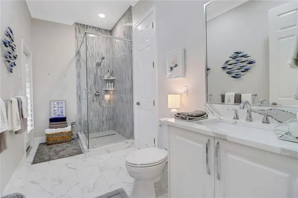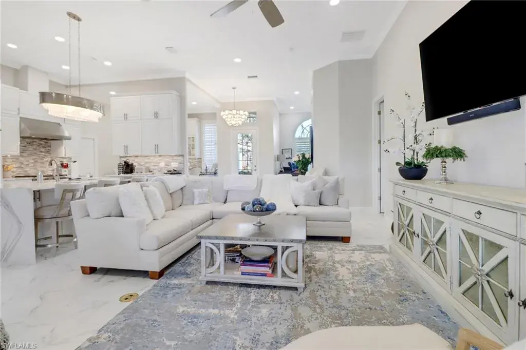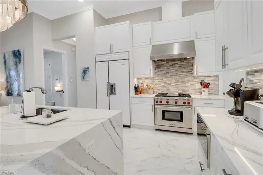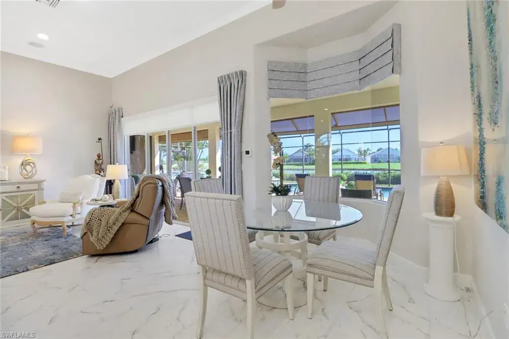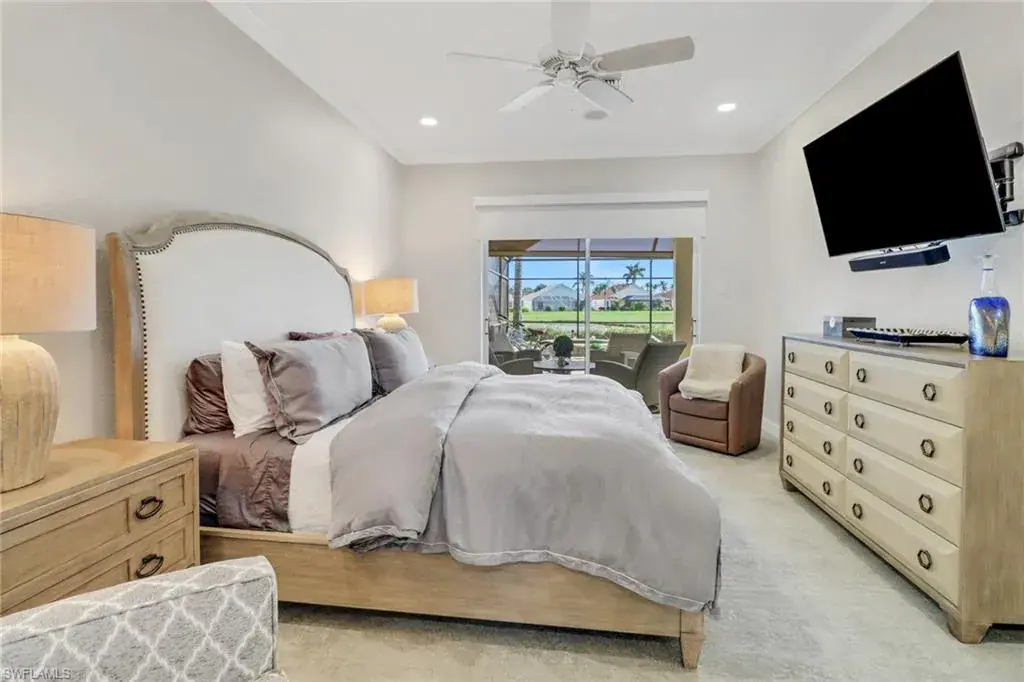 Welcome to this exquisitely remodeled ranch-style home with a brand-new roof in the highly sought-after Mustang Island neighborhood of Lely Resort, Naples, FL. Situated on a serene lakefront lot with breathtaking views of the Mustang Island Golf Course, this furnished 3-bedroom, 2-bathroom residence offers luxurious Florida living at its finest. Inside you’ll find soaring ceilings, custom cabinetry, fitted blinds, and elegant mirrors enhance the home’s sophisticated charm. The open-concept design seamlessly connects the living and dining areas to the gourmet kitchen, a chef’s dream with a gas range, spacious island, and cozy breakfast nook. The master suite provides two walk-in closets, dual sinks, and a spa-like walk-in shower. The home is complemented with a versatile den, stylish dry bar, and plush carpeted bedrooms. Outside, the expansive screened patio is perfect for entertaining or unwinding, featuring a fully equipped summer kitchen, cooling fans, wine cooler, and heated pool with hot tub, all overlooking the lake and holes 10 and 11 of Mustang Island’s golf course. For added peace of mind, the home includes custom storm-safe shutters and a whole-house gas generator, a rare find in this community. Don’t miss this incredible opportunity for a ready-to-move-in home, your own piece of paradise in Lely Resort!