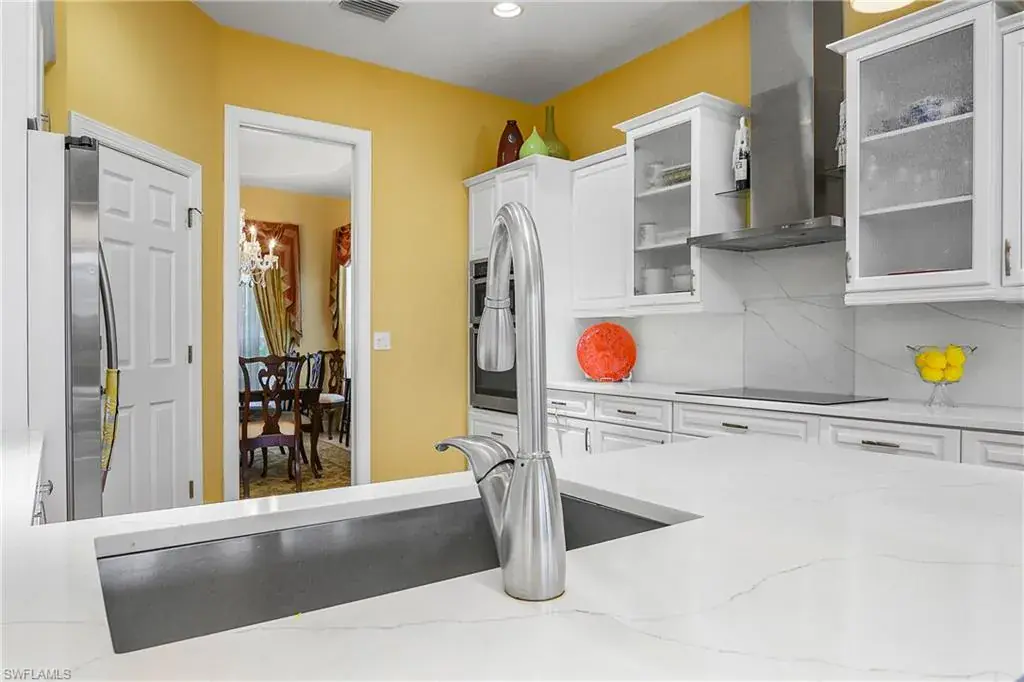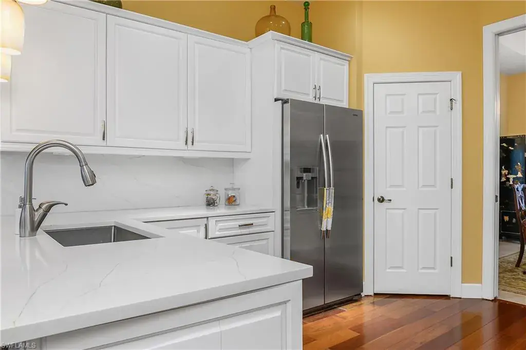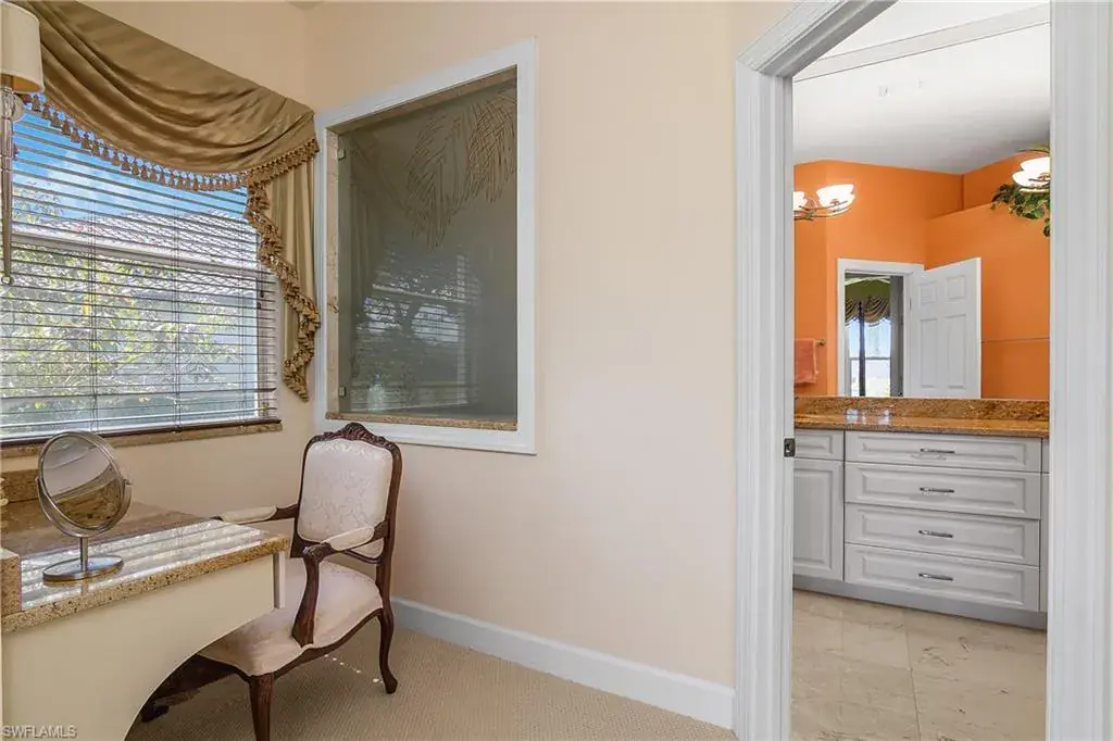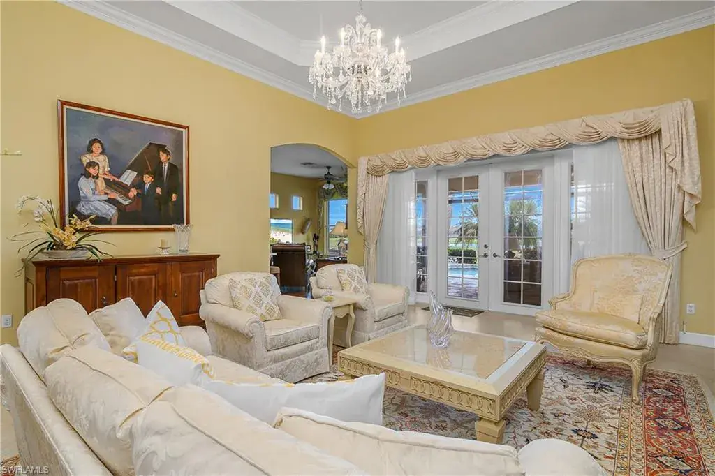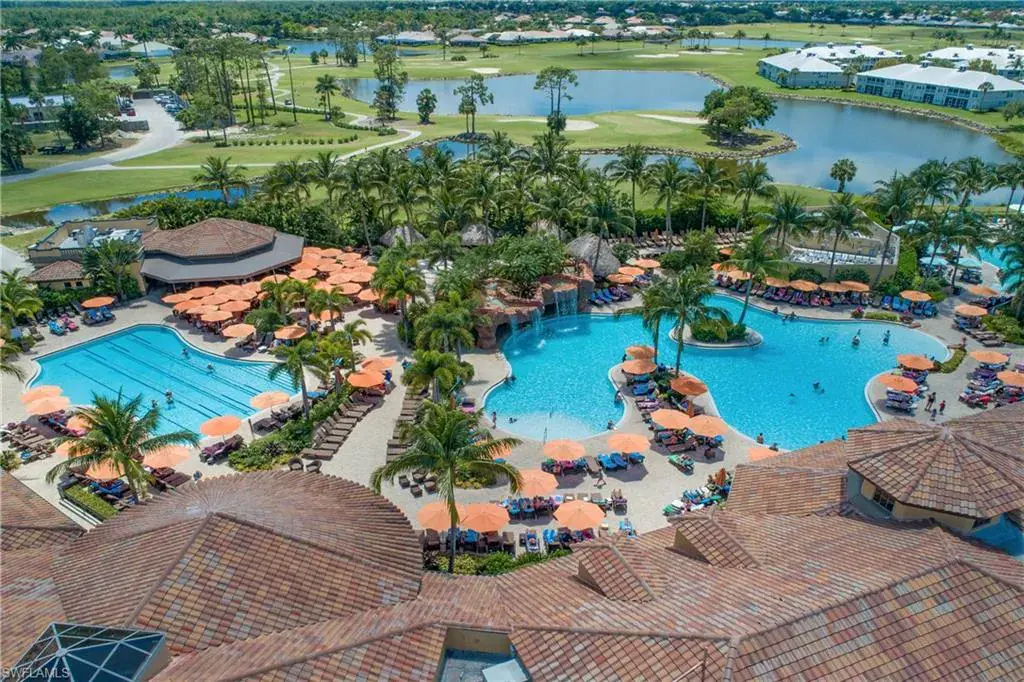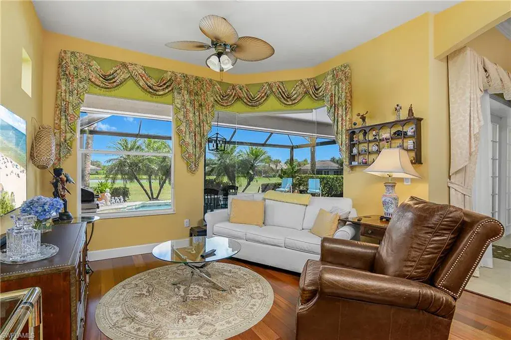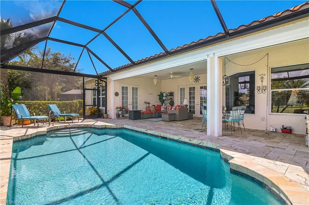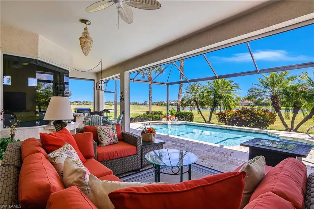 Outstanding lake view from this home located at the end of a cul-de-sac. Fabulous privacy with this 2 bedroom plus a den home. Foyer leads to large living room (great room) with marble framed fireplace and elegant dining room. Kitchen has stainless appliances, highly upgraded cabinets and quartz counters. Elegant master bedroom with walk-in closet and a custom designed ladies make-up area. Master bath has updated shower and dual sinks. Both master bedroom and bath have new hurricane windows installed in 2024. Split bedrooms allow for privacy in the guest bedroom and bath. Lovely pool has panoramic screen done in 2022. Lanai has hurricane screens put in by Storm Smart 2023. Pool is heated by solar and electric. High end AC replaced in 2025. New roof 2022. Two car garage with new spring board. Mustang Island is a gated community for homeowner security. The Players Club and Spa resort style amenities are included with this home. The Club offers three pools, tennis, pickleball, bocce, spa, a complete fitness center, and a full social calendar. Lely Resort offers the perfect balance of leisure and recreation.