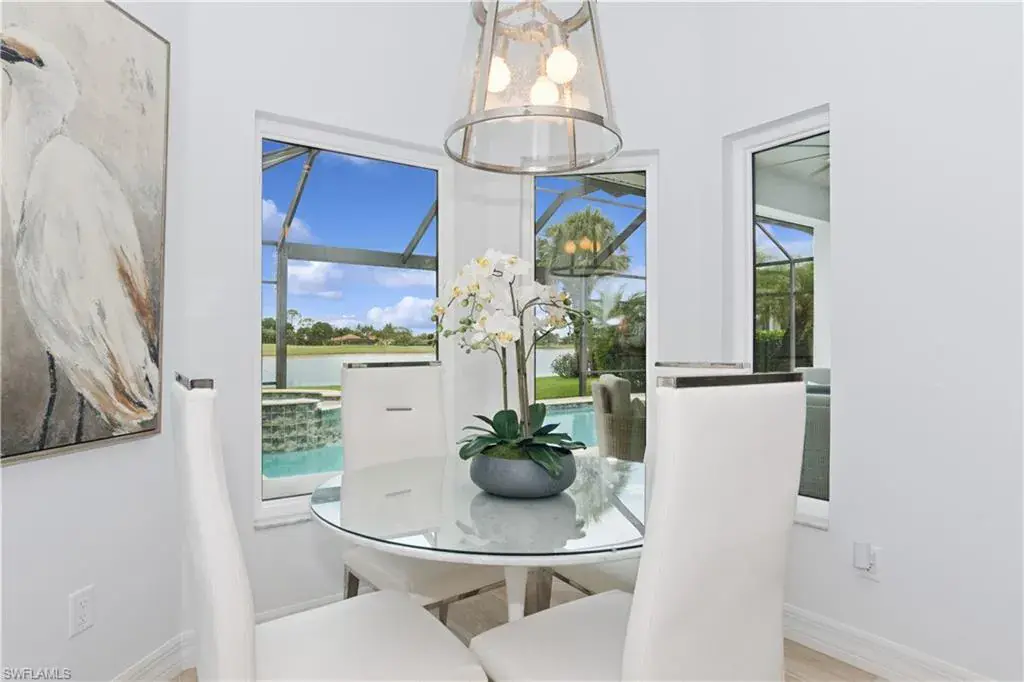 Outside, the expansive screened lanai showcases a heated in ground pool and spa overlooking the water and golf course—an ideal setting for peaceful mornings or effortless entertaining.