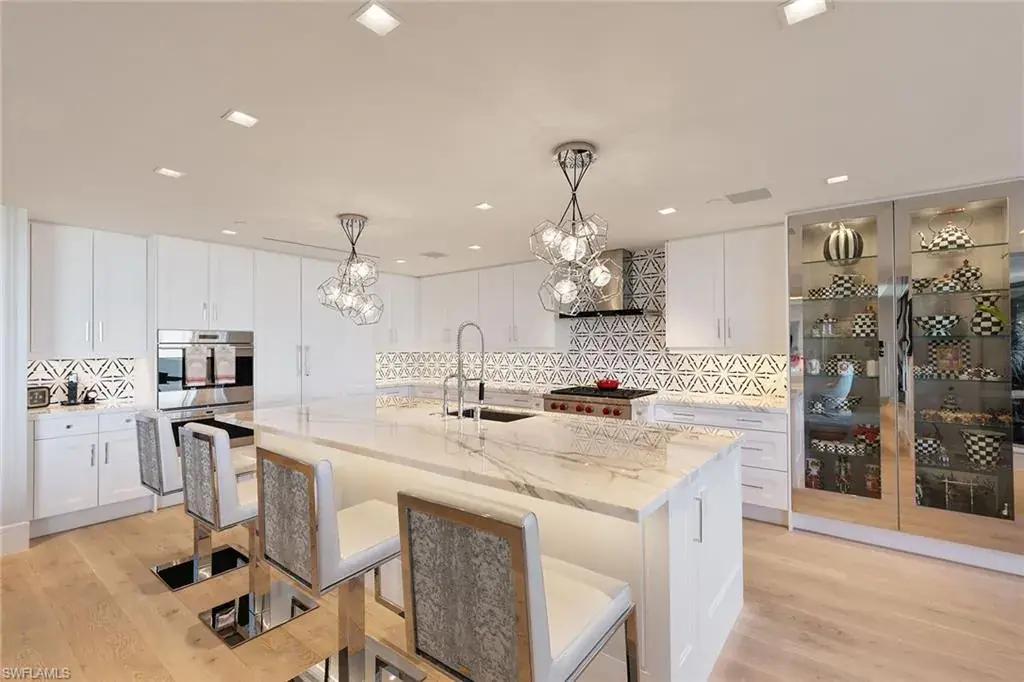 Coastal luxury at Mystique in Pelican Bay. Perched on the 12th floor of Pelican Bay’s newest and exclusive high-rise, Mystique, this extraordinary residence offers sweeping views of the Gulf and unforgettable sunsets framed by expansive floor-to-ceiling windows. Every detail of this home exudes sophistication and timeless elegance. A renowned interior designer has curated a stunning palette highlighted by exquisite wall and ceiling coverings, custom lighting and Legno Bastone Italian wood flooring. The pristine white kitchen is a showpiece of modern refinement, featuring Carrara marble countertops and a striking black-and-white tile backsplash. The den/piano lounge features a dramatic backlit Crystallo bar with Crystal sink and marble fireplace. Pocketing doors open at the touch of a button in this smart home with custom Lutron system. No expense has been spared in creating this extraordinary coastal sanctuary. Residents of Mystique enjoy the ultimate in five-star living with 24-hour concierge service, and an array of world-class amenities. Within the private Pelican Bay community, indulge in exclusive beach access with two beachfront restaurants and bars, chair and umbrella service, tennis and pickleball courts, a state-of-the-art fitness and wellness center, and miles of scenic recreational and biking trails. Just moments from Artis-Naples and Waterside Shops, Mystique offers a lifestyle of unmatched convenience, culture and sophistication. This is more than a residence, it’s an elevated way of life on the Gulf.
