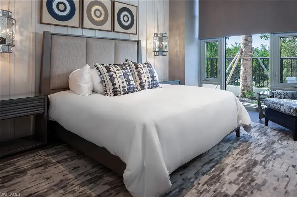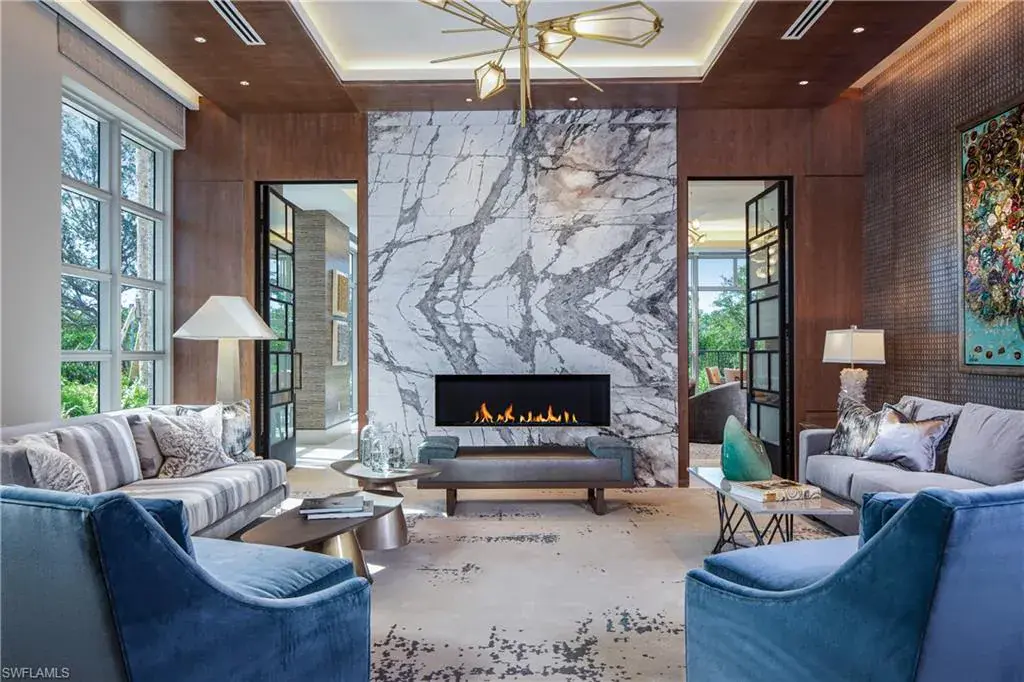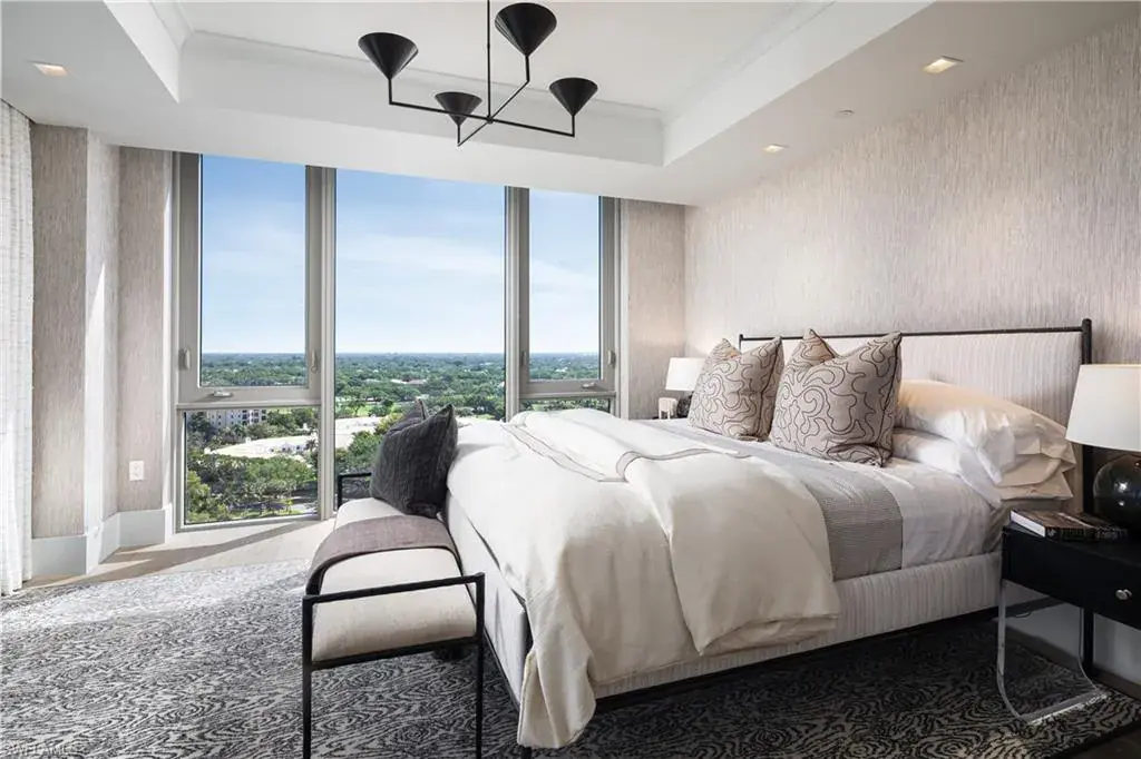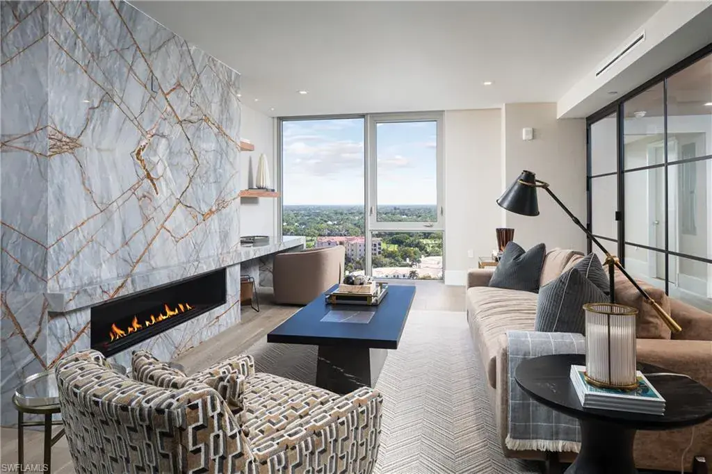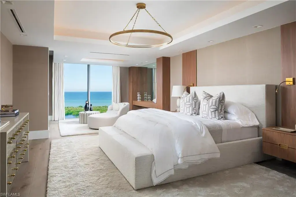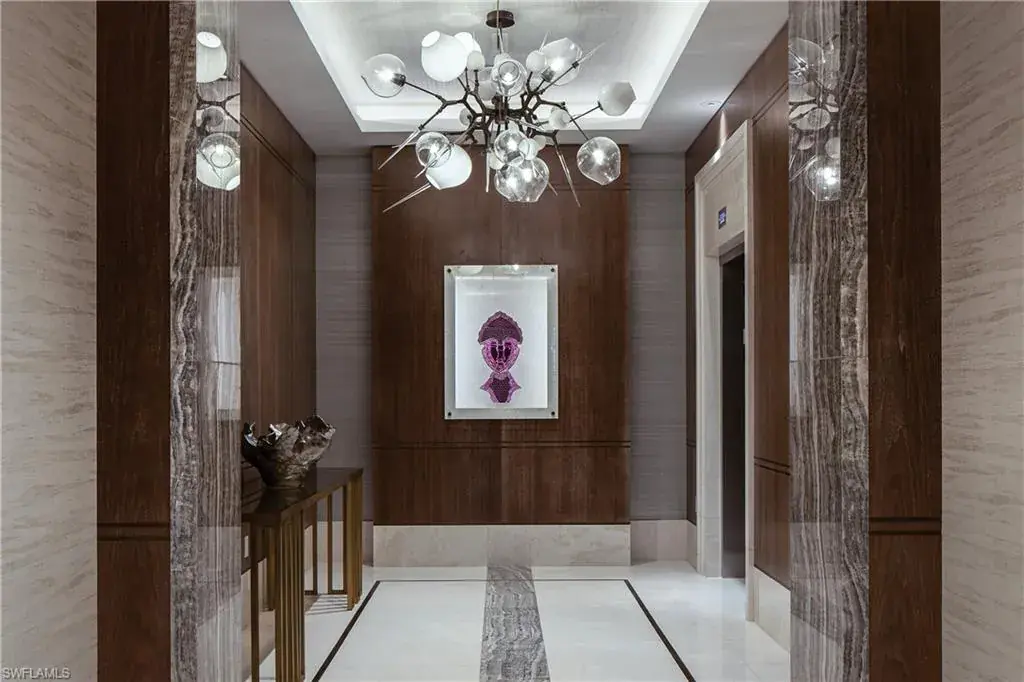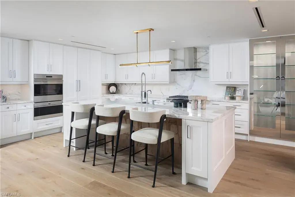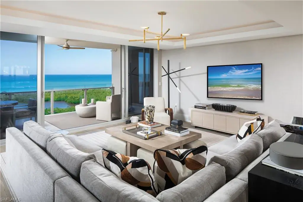 Double doors from the private elevator lobby lead into the light-filled residence highlighted by floor-to-ceiling glass, spacious 9’ ceilings, and a West-facing terrace for taking in the famous sunsets. High-end appointments and custom finishes abound, from designer wall coverings, lighting and furnishings to Dornbracht plumbing fixtures, to Legno Bastone European oak and natural stone/marble flooring throughout. The chef’s kitchen features a Wolf/Sub-Zero appliance suite, full-height wine cooler and display cabinetry with custom stainless steel & glass doors, and Calacatta marble counters with full-height backsplash. The primary suite boasts an attached seating area with front row Gulf views that opens to the terrace, as well as a luxurious spa-like bath with separate tub and marble-clad shower and his/hers vanities, spacious walk-in closets and water closets with frosted glass doors. Enjoy direct access to the private beach club, with beachfront dining and sunset bar as part of the incomparable Pelican Bay lifestyle.