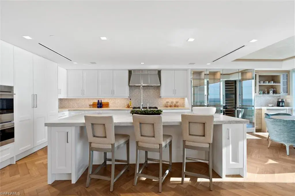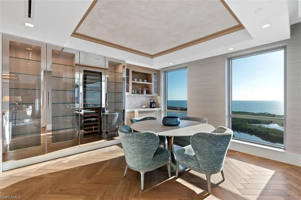 Welcome to ultimate living in Pelican Bay, Mystique, ultra-living high rise, Pelican Bays newest high rise. With custom designer finishes throughout this condo is sure to impress. This condo has floor to ceiling windows running East/West catching the beautiful views of the Gulf of Mexico. Award winning design by CR Smith Construction not one detail was left untouched. Featuring Legno Bastone herringbone floors and solid white oak doors and ceiling treatments, and shelving. The kitchen is a chefs dream finished out with a custom La Cornue range as well as a Wolf wall oven and SubZero refrigerator/freezer. Concierge and 24-hour staff on site, with first-class amenities on main level. Pelican Bay has two beach restaurants along with private beach that includes chair service.