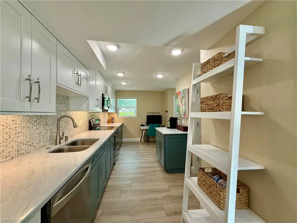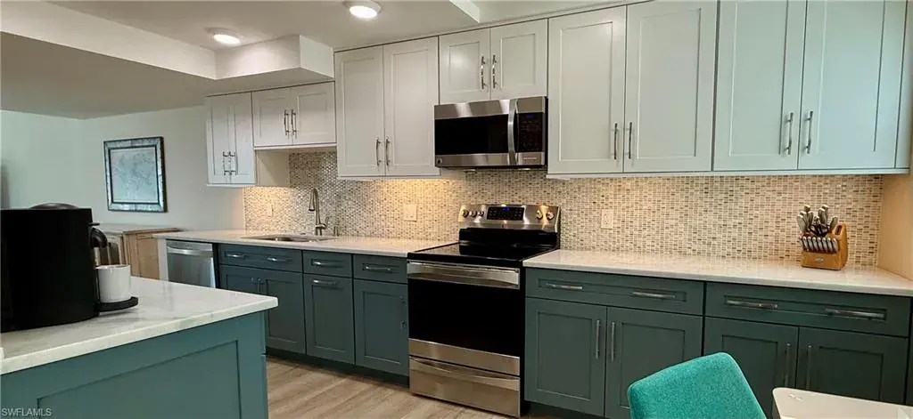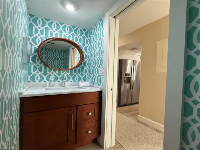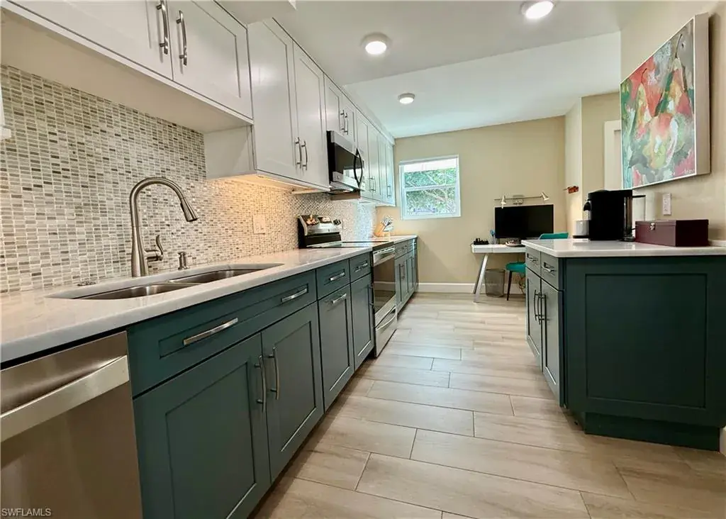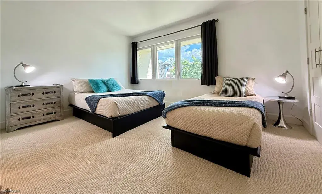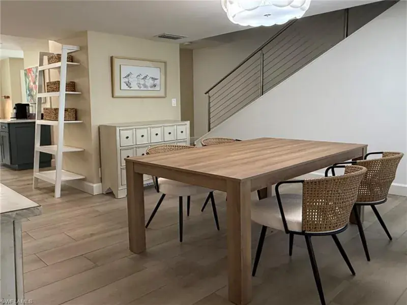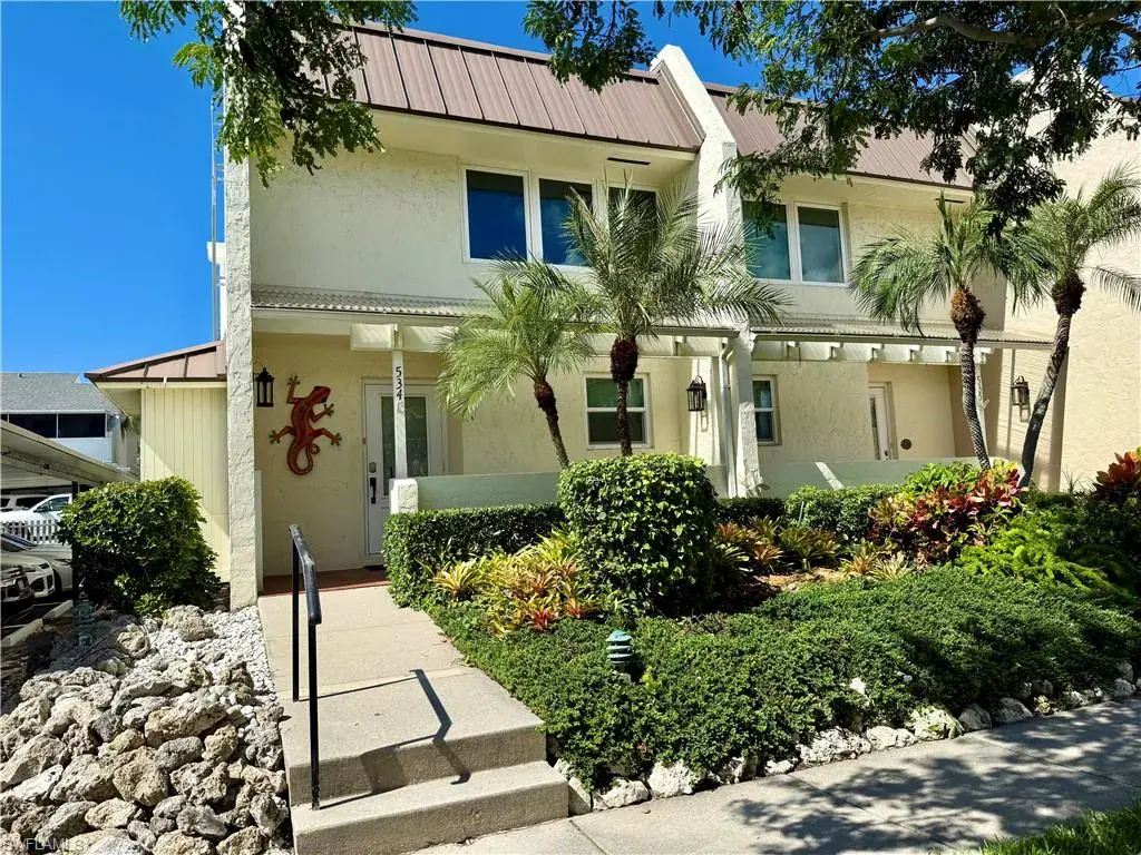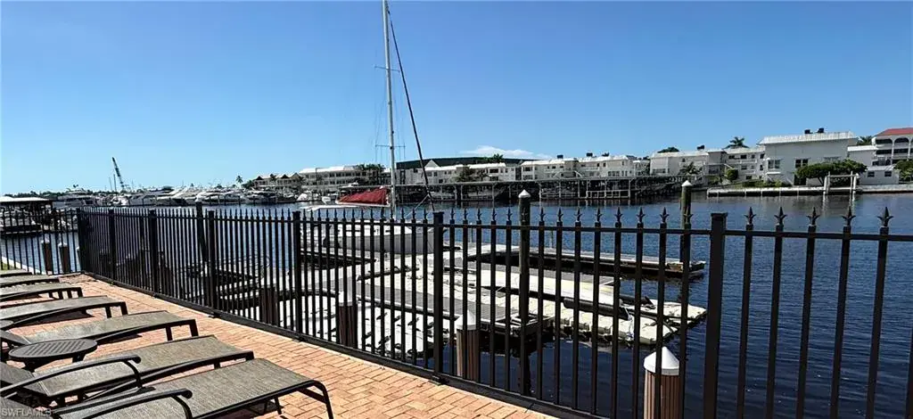 Nestled on Naples Bay, end-unit townhouse condo bathed in light. 1700 ft.² of smart, easy living: two en-suites upstairs and a guest bath on the main level. The updated kitchen has custom solid wood cabinets, a coffee station and space for a home office work area. The sleek steel-wire staircase gives it that wow. The lanai for lazy mornings, and the master balcony affords peeks of Naples Bay. Covered parking mere steps from your front door is a major convenience. The comfortable community pool with kitchen area literally overlooks Naples Bay.…sunset’s best seat in town. Comes with recently updated boat slip, able to accommodate up to a 32ft boat and no bridges! Located steps away from Naples Yacht and Sailing Club and walking distance to dining and shops on 5th Ave. South, life‘s easy here. Fully furnished, tastefully done. Coastal charm meets modern ease.