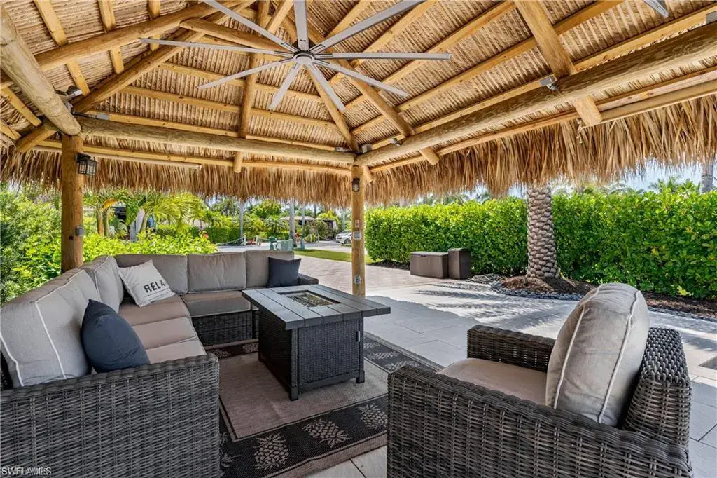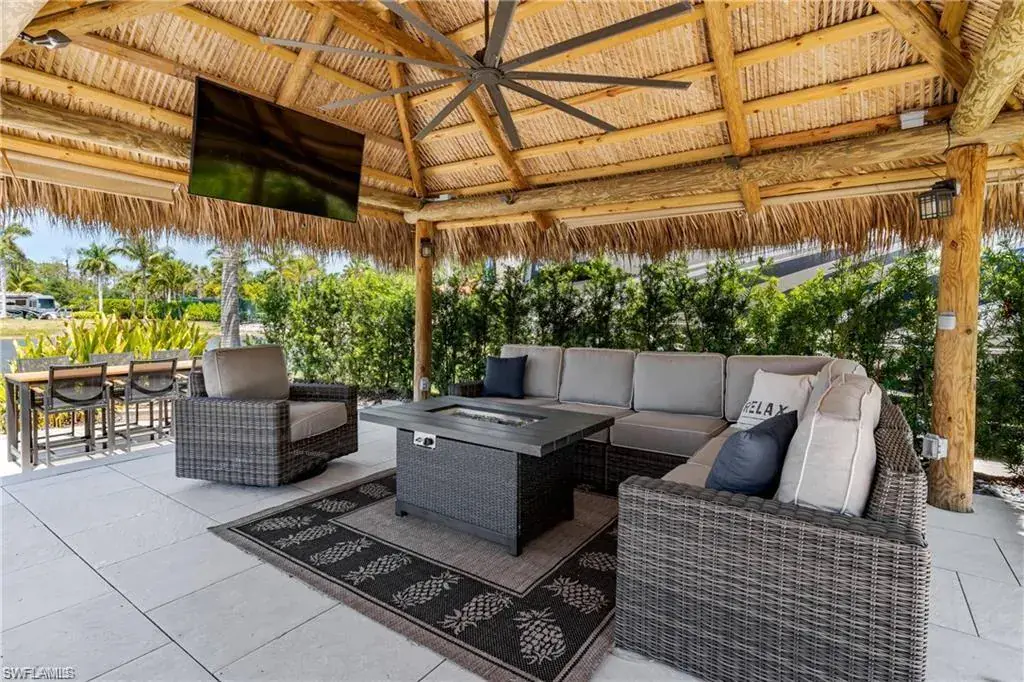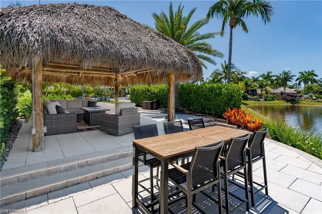 Picture yourself unwinding beneath the spacious tiki hut, taking in full fountain views while listening to the tranquil sounds of water gently cascading into the lake. The meticulous paver design guides you along lush tropical landscaping, leading to multiple tiered seating areas—each ideal for conversation, dining, or simply soaking up the serene surroundings.