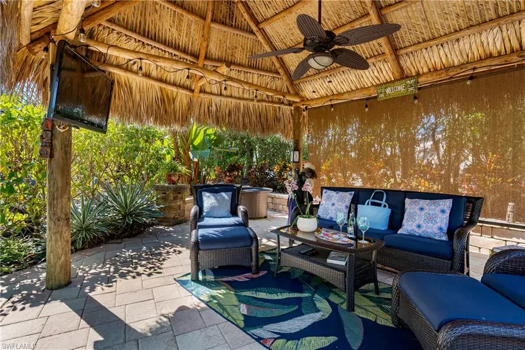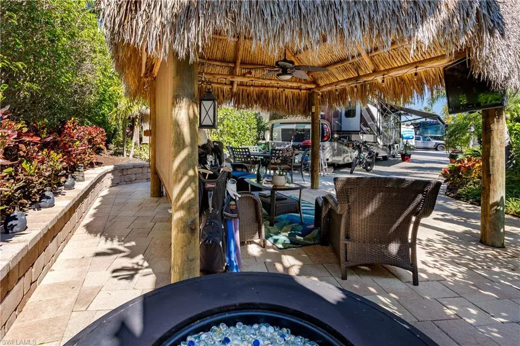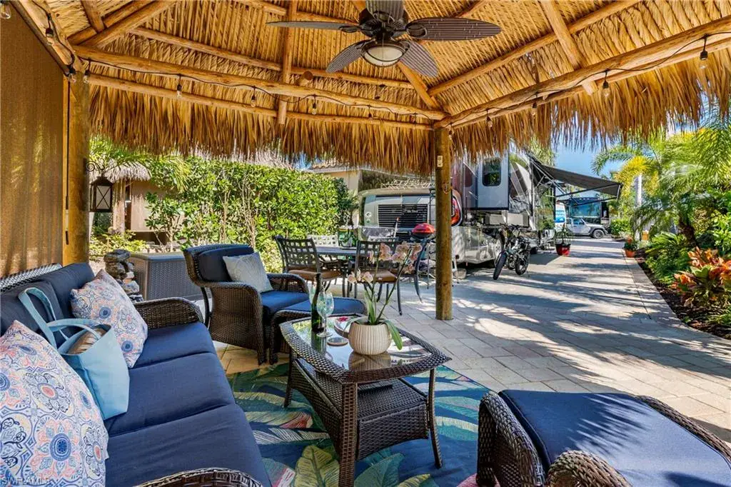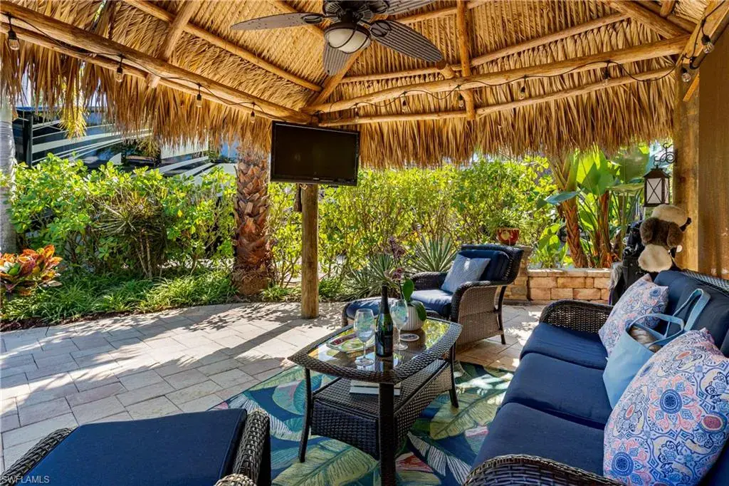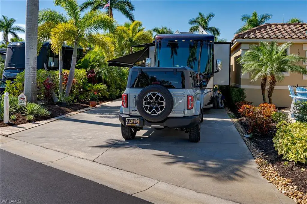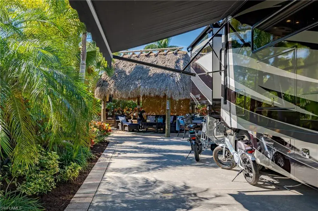 Lot 80 – Welcome to Paradise! You park your coach and the first thing you do is look out your passenger side windows to see all of the beautiful tropical landscaping. You then head out of the coach and walk to your very private tiki all ready for you as the tiki furniture and the tv are included! Your tiki is surrounded by more tropical plants. You sit back and relax enjoying the company of friends or just in silence and listen to the birds. There is also an area for a fire pit, perfect for an evening cocktail.
