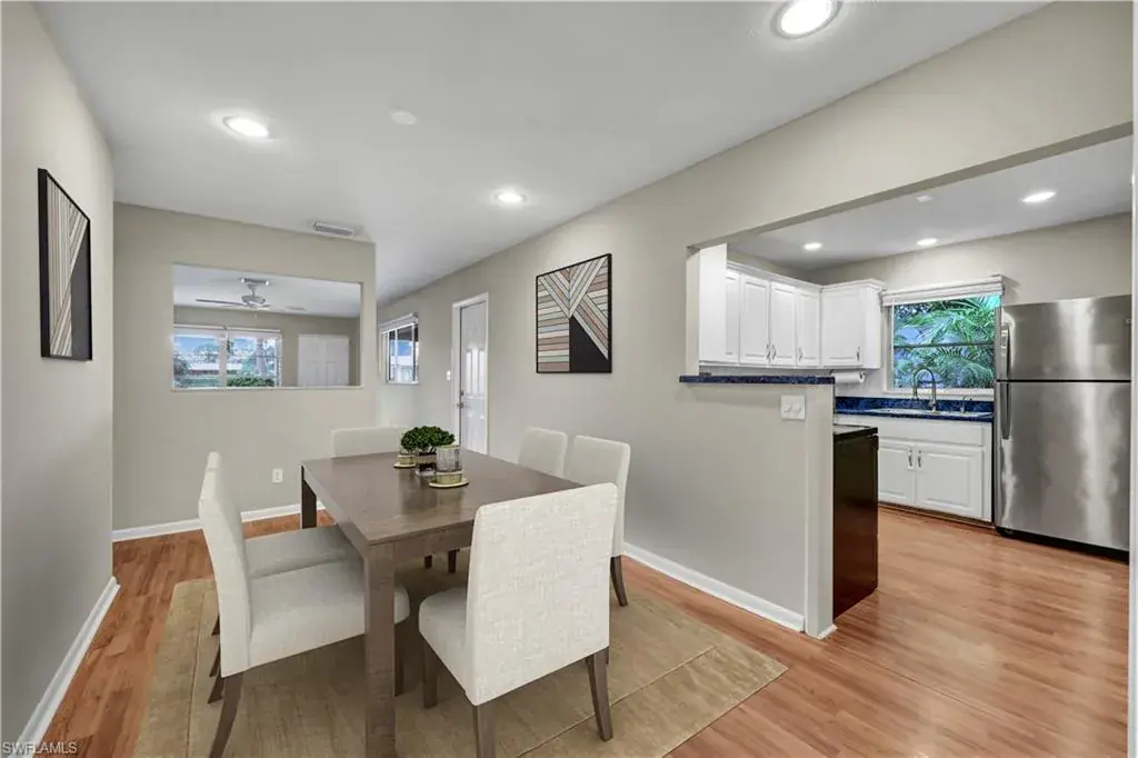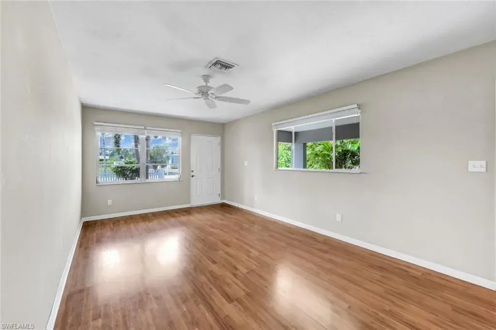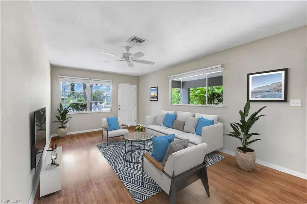 Welcome to this quaint coastal cottage, with a white picket fence, located in the desirable Naples Park 500 Block, west of 41 in Naples, FL, just minutes from the beach, a state park, fine dining, world-class shopping, Whole Foods, and Mercato. This 2 bedroom plus den, plus separate work from home office, 2 bath single-family home, with the option of a third bedroom, offers numerous indoor and outdoor areas for entertaining and relaxation. No flooding has occurred in this home. Recent upgrades include a 2019 roof, HVAC and storm shutters, 2023 hot water heater, 2024 Stovetop/ range and toilets, 2023 and 2025 carpet. Laminate floors are in the main living areas with neutral carpet in two of the bedrooms and den / sitting room. Professionally landscaped, with large palms and lush landscaping for peaceful sitting areas along with auto irrigation with a well which provides peaceful and cost-effective irrigation system. A convenient large storage area is located just north of the covered parking area. This interior of the home was recently painted in 2025 and is ready to live year-round or part time or use for vacation or year-round rental income. Close to top-rated schools, parks, medical, shopping and Naples pristine beaches.