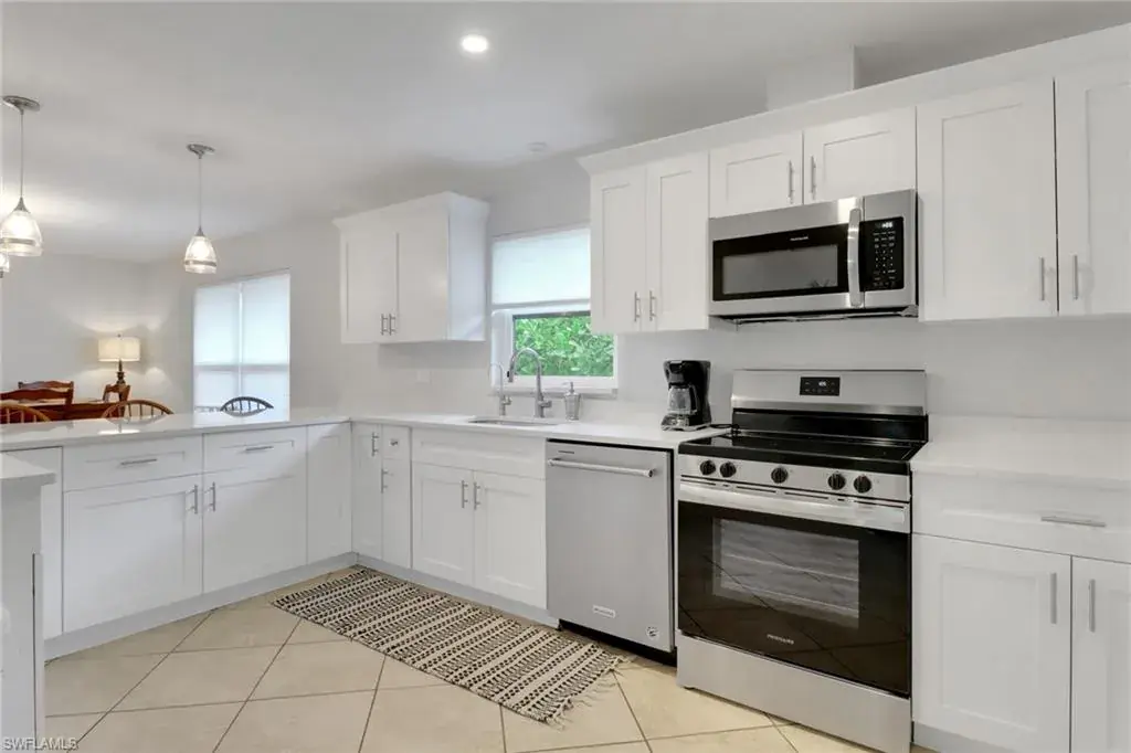 Step inside to discover a gorgeous open-concept kitchen featuring white shaker cabinets and stainless steel appliances—perfect for the chef at heart. The home has impact glass windows for added peace of mind, offering storm protection with no damage from previous storms. Tile flooring flows seamlessly throughout the home, giving it a clean, modern look.