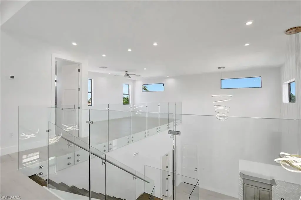 with a sun shelf, an outdoor grill, and a dedicated pool bathroom, perfect for entertaining and relaxation. Inside, the home is bathed in natural light and features amotion-sensored lighted staircase with a gorgeous glass railing leading to two additional bedrooms, two full baths and an upstairs bonus room. This architectural