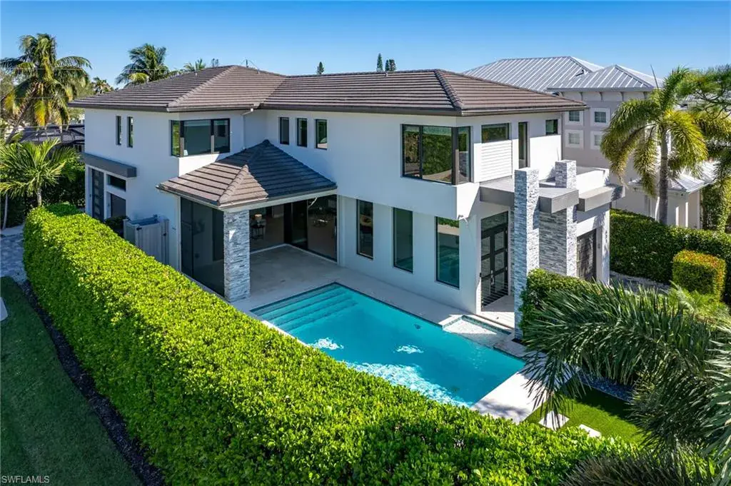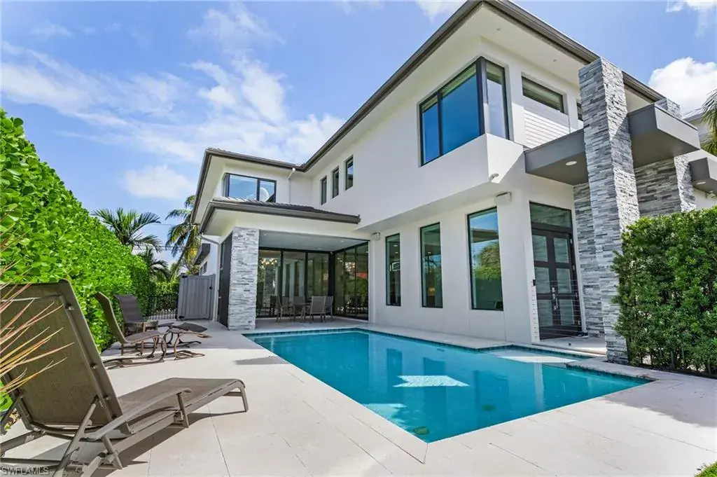 This Modern Beauty is just steps from the beach, located on the desirable 91st Ave! This custom pool home offers 5 bdrms & 4 ba, office, and panoramic 2nd story views of sunset. Open floor plan with custom tile, modern faucets and light fixtures, and 11′ coffered ceilings. Gorgeous kitchen with waterfall island, stainless steel appliances, RO water purification, and walls of sliders that open onto the lanai and pool. The master suite offers 2 walk-in closets, and oversized rain shower with custom tile work. Fifth bedroom can serve as an upstairs den/media room. The heated pool offers water features, a sun shelf, outdoor enclosed shower and motorized screens. Mature fruit trees, lush landscaping and southern exposure will enhance your enjoyment of the lanai and pool area. The home also features impact glass on all windows and doors, motorized blinds, high efficiency AC system with UV lights and electronic air cleaners, extra storage closets, air-conditioned 3-car garage with 11′ door height for boat, RV or car lift, plus an additional front garage. All of this and only a half mile walk to the beautiful beaches of the Gulf, and a short walk to the shops and restaurants of Mercato.