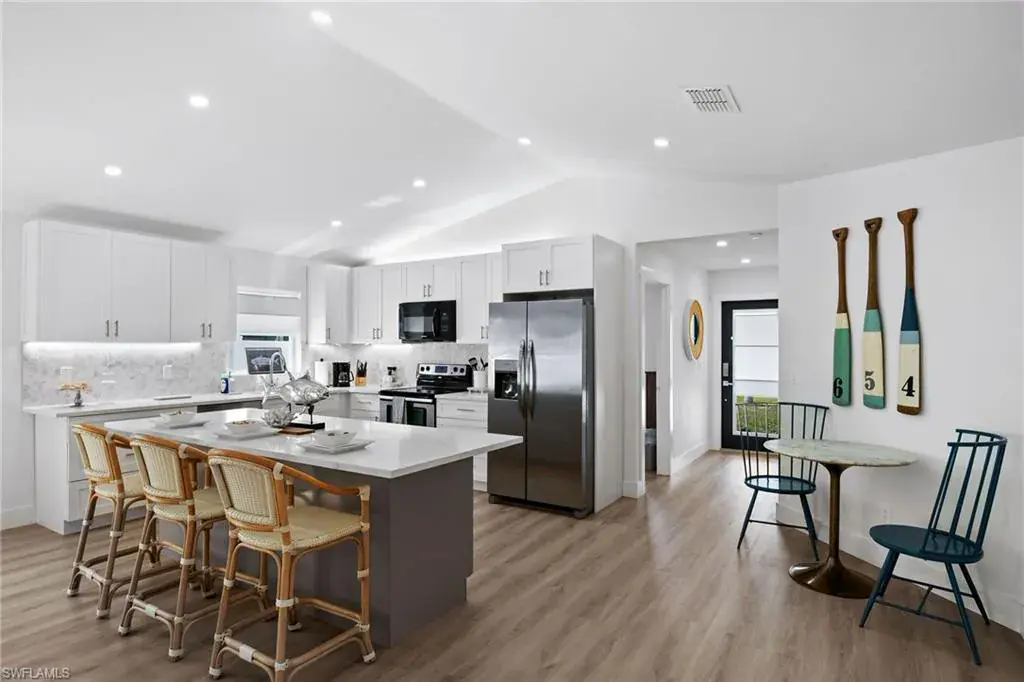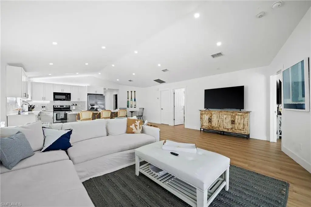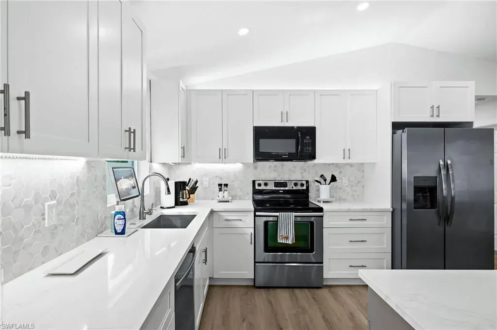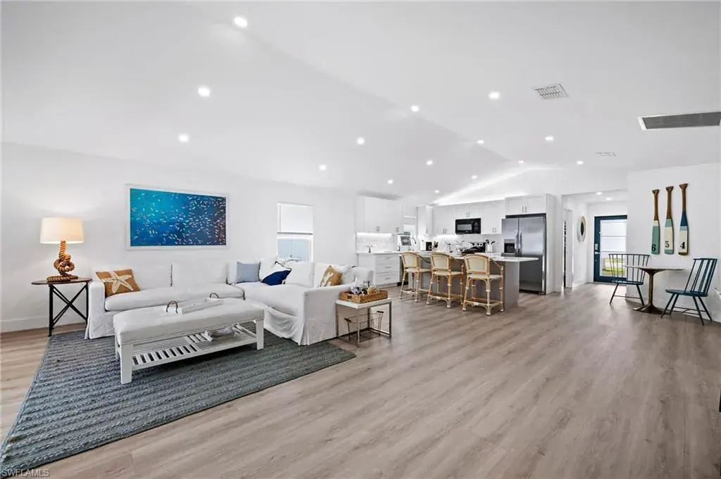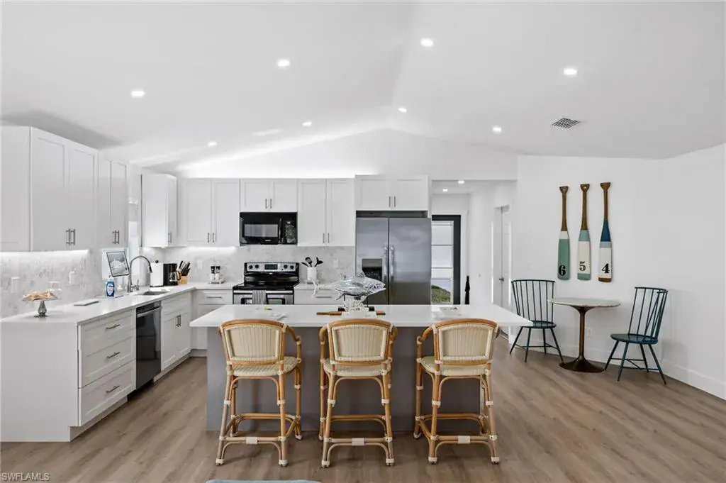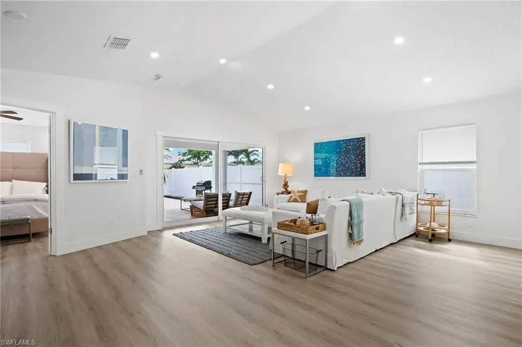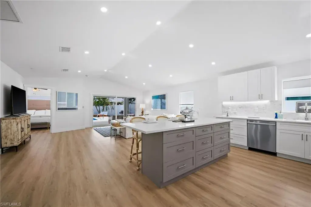 The quintessential 3-bed, 2-bath home in Naples Park. Recently updated throughout and offered completely turnkey the home features an open concept floor plan with vaulted ceilings, split-bedrooms, and luxury vinyl floors. The chef inspired kitchen has quartz countertops, stainless steel appliances and a large island with breakfast bar seating. The backyard area is perfect for entertaining featuring an oversized pool with Southern exposure and plenty of green space and mature palms. The two-car garage has also been upgraded with epoxy floors, brand new washer/dryer and plenty of room for extra storage. Naples Park is centrally located with walkability or just a short bike ride to the best of Naples including, Vanderbilt Beach, Delnor Wiggins State Park, and the many boutique shopping and dining options of Mercato and the Pavilion. 10 minute drive to Waterside, 15 minute drive to 5th Avenue and the Naples Pier.