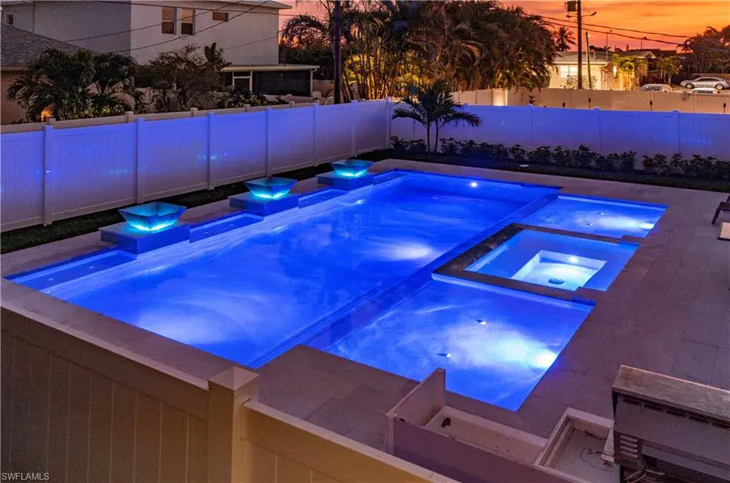 Step outside to enjoy your private backyard retreat featuring a smart saltwater pool with bubblers, water bowls, two sun shelves, a sunken spa, LED lighting, and a fully installed outdoor kitchen with built-in grill and prep space, all set on a new marble entertainment deck.