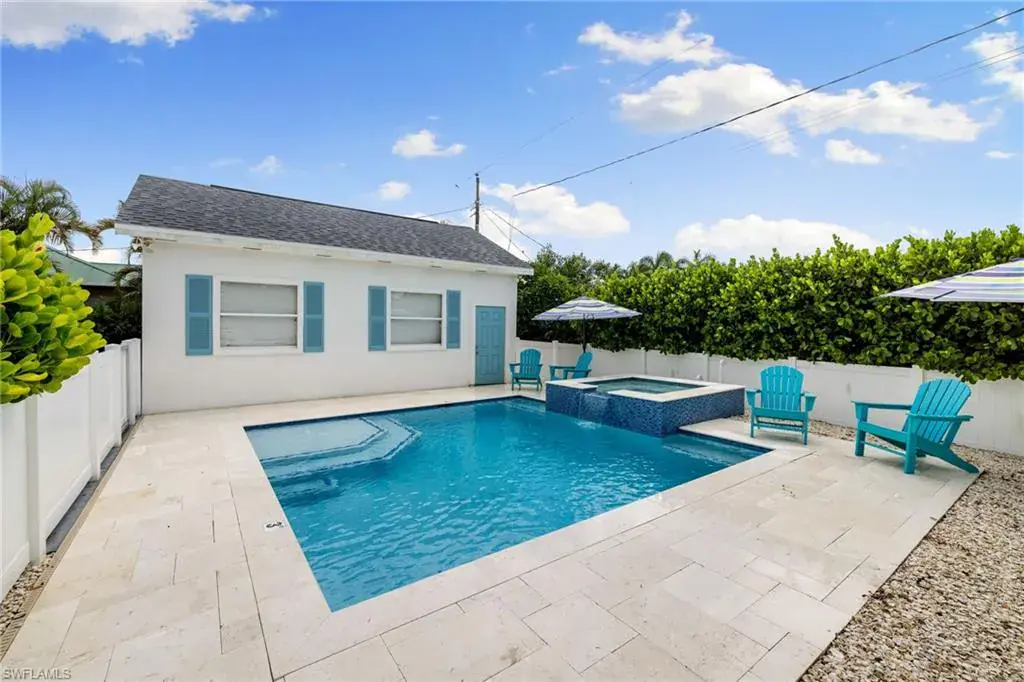 The backyard is a private oasis featuring a brand-new heated pool and spa, framed by white vinyl privacy fencing and lush tropical hedges for a resort-style setting year-round. The expansive lot allows plenty of room for outdoor dining, lounging, and hosting gatherings.