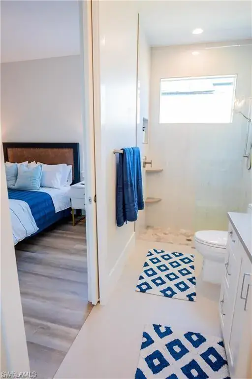 enclosure, white painted shaker cabinets with quartz tops, upgraded wall tile, linen closet, huge walk-in closet. Spacious open floor living room features 14′ pocket sliding glass