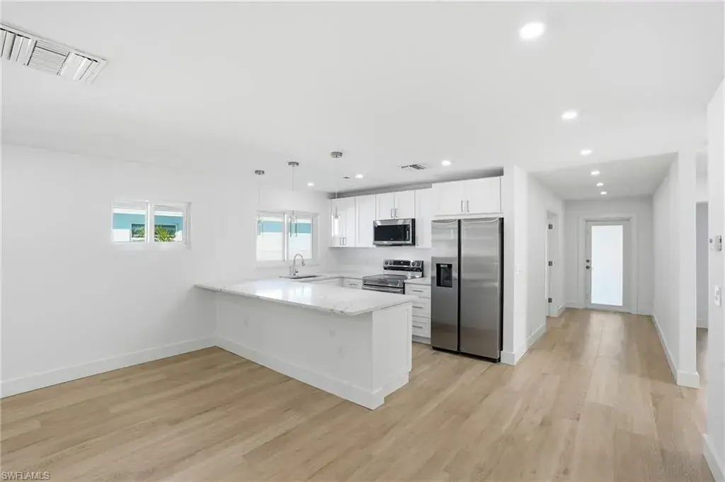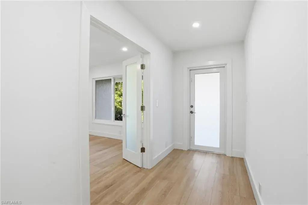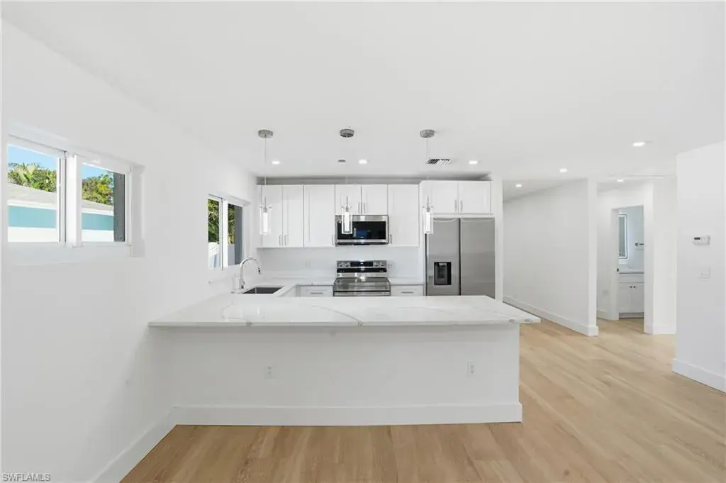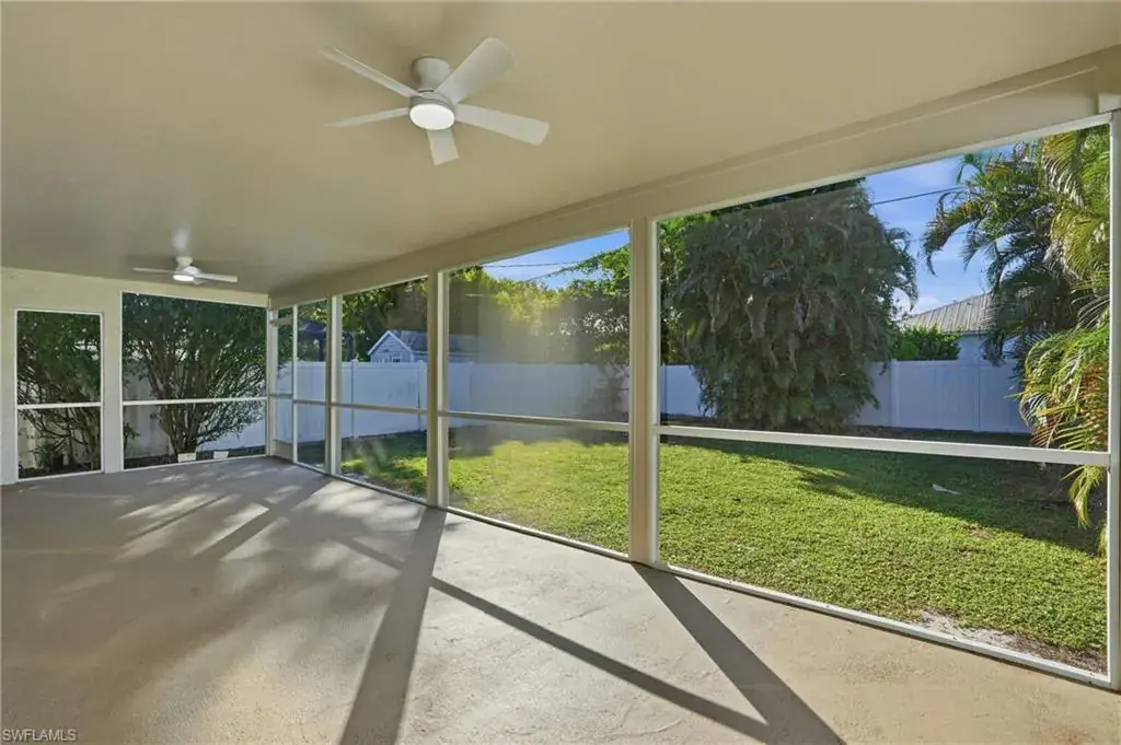 Nestled in the highly sought after neighborhood of Naples Park, this home pairs a prime location with effortless everyday living. With no HOA, enjoy lower monthly costs and greater flexibility for landscaping, parking, and excellent rental income potential. This home offers strong curb appeal, blending new and mature landscaping, while offering complete privacy from your neighbors. Step inside the beautifully remodeled 1,500 sq ft open concept home where thoughtful upgrades meet effortless style. All new electrical wiring and panel complement new plumbing in the bathrooms and kitchen, and light modern 10″ x 70″ tile visually expands the living spaces. The kitchen is a chef’s daydream with quartz countertops, stainless steel appliances, dovetailed drawers, and a special nook of built in cabinets that keep pantry clutter out of sight. Solid core interior doors, impact windows and doors, and a privacy glass front door as well as side door all deliver lasting quality and peace of mind. Relax in the serene primary bedroom that boasts an elegant ensuite with dual sinks, quartz countertop, and tempered 3/8″ glass shower doors, then step through French doors of this bedroom onto a generous screened lanai — or slip outside from the great room French doors for easy indoor outdoor living. Practical touches elevate daily life: a laundry room with its own private exterior entrance as well as interior, wafer adjustable lighting and modern ceiling fans in every bedroom and the great room. The backyard is fully fenced with dual side gates and sits on a generous lot with ample space to add a pool, making this home a perfect blend of modern convenience, thoughtful design, and relaxed Florida living. With a brand-new roof installed in 2025 as well as a new water heater, this home offers true peace of mind and is just a two-mile bike ride or walk to the beach, with shopping, dining, and the Mercato all within five minutes from this exceptional property.