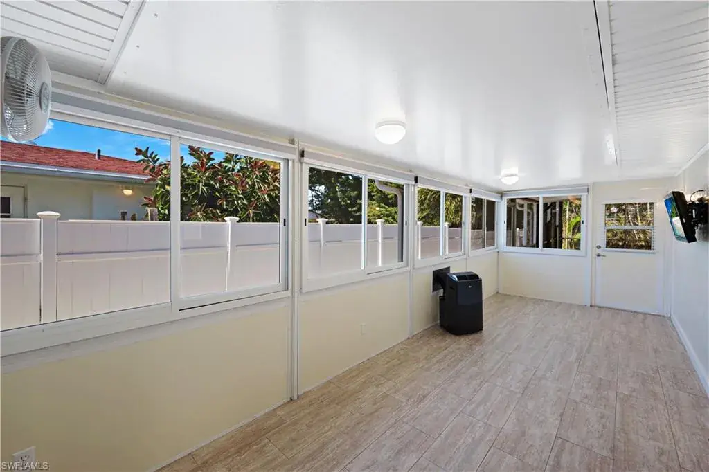 Additional living spaces include a west-side enclosed porch with slider windows (2019), portable AC, and custom shades, plus a welcoming front porch (2019) with insulated roof and French doors. Outdoors, enjoy the newer saltwater pool (2020), covered lanai (2020), storm-smart screens, outdoor shower, tall palms, crushed coquina, and full privacy from fencing and mature hedges.
