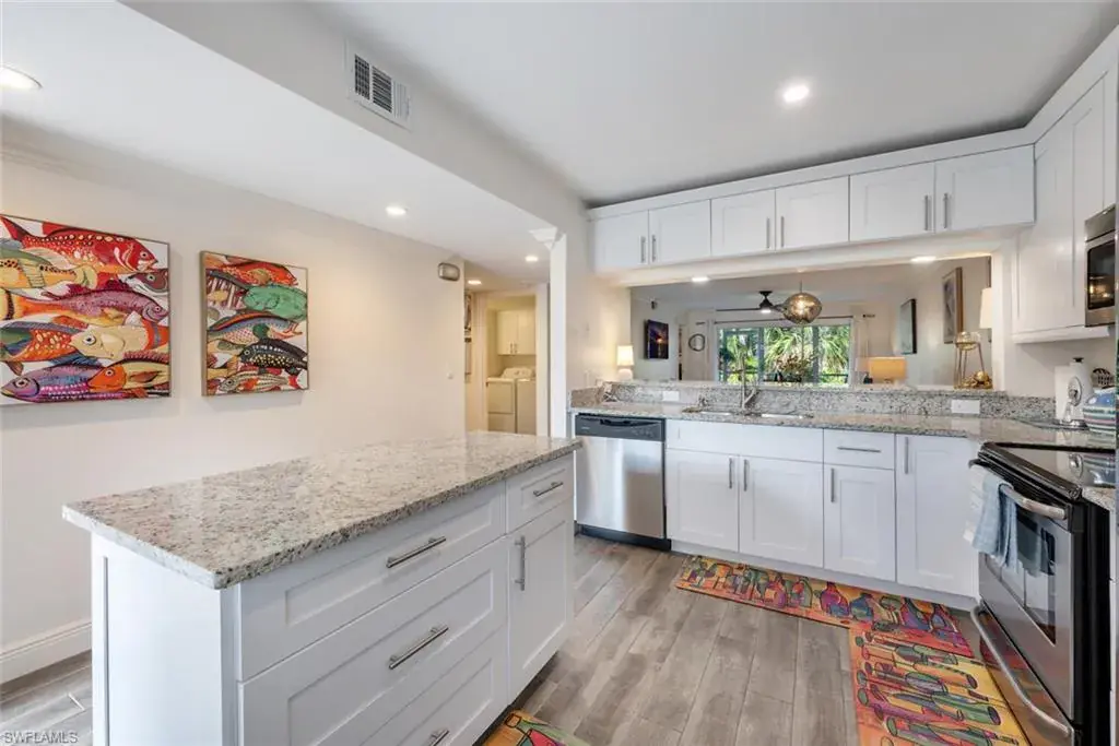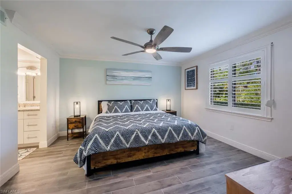 Inside, the elegantly updated kitchen boasts stylish cabinetry, stainless steel appliances, and an open layout perfect for entertaining. Durable and sophisticated wood-tile flooring flows seamlessly throughout the entire home, complemented by fresh paint and newly installed ceiling fans and toilets. The primary bedroom offers an exceptionally spacious closet, while additional storage in the laundry room ensures practicality meets luxury. The home is offered turnkey furnished, you only need to bring your personal items.