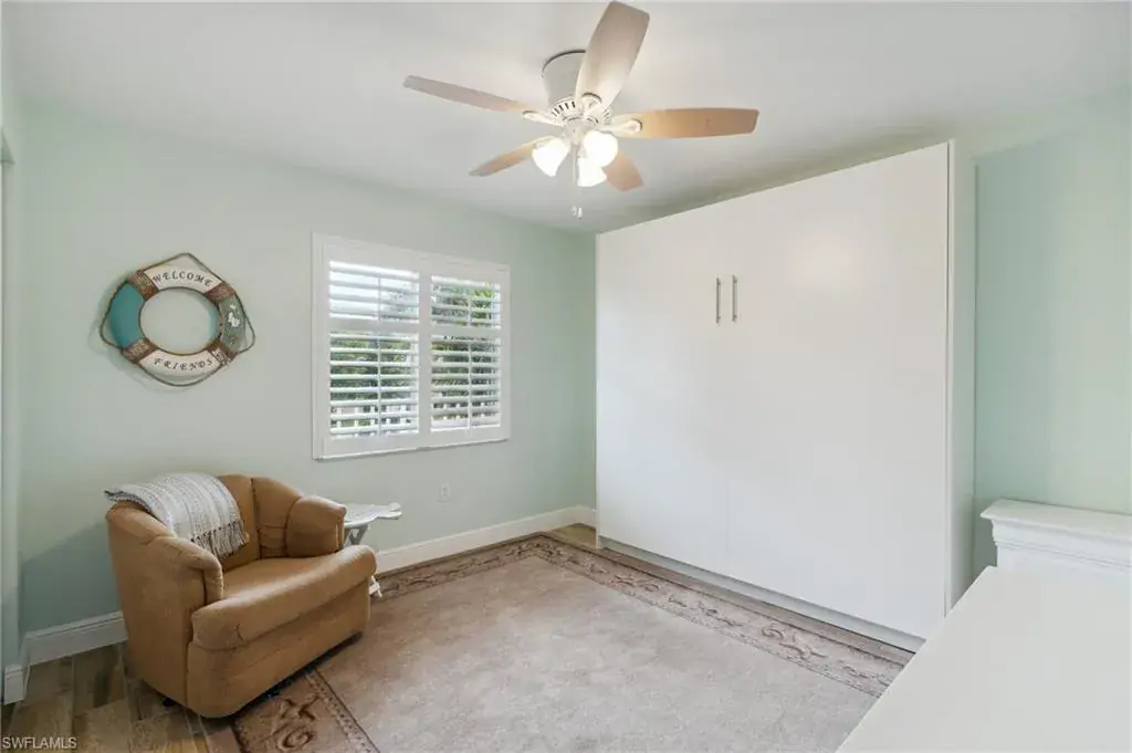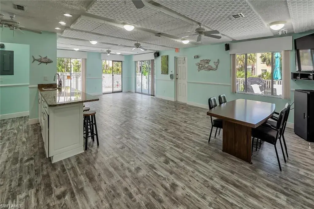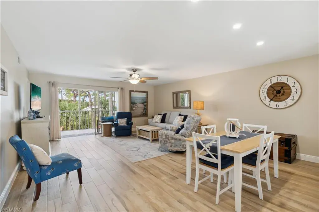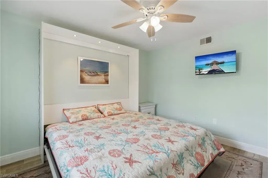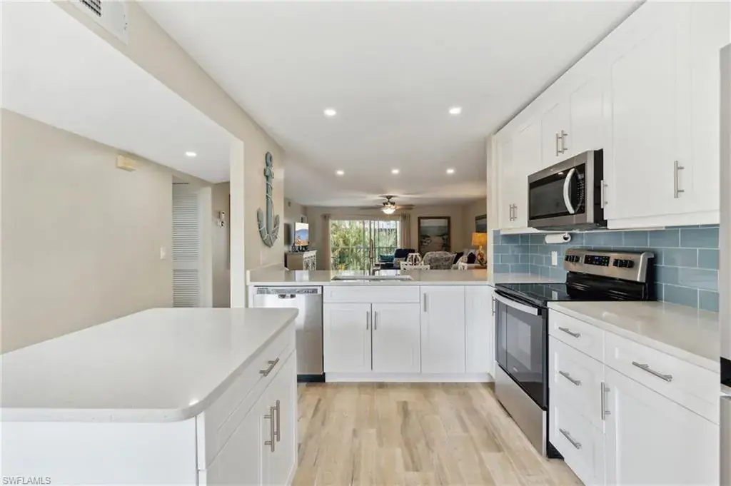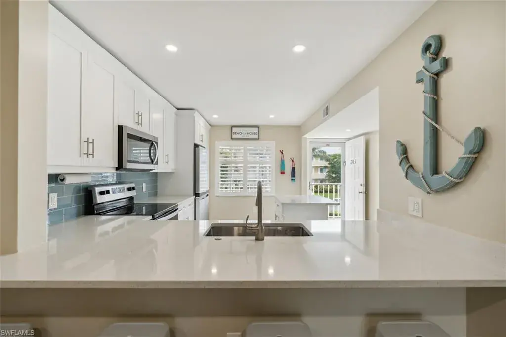 FULLY RENOVATED, move-in ready condo with open concept. Furnished (negotiable). Kitchen features quartz counter-top, breakfast bar (seating for 4) plus an island. NEW driftwood tile floors throughout (including the lanai) installed with 5 inch baseboards. All the popcorn ceilings are gone, and the entire unit has been painted, including ALL trim, baseboards and 6 panel doors. ALL NEW recessed lighting, complete electric update, 2021 A/C and Water Heater. The Guest bedroom boasts a new King size Murphy bed allowing this space to double as Guest Bedroom or Home Office/Den. NEW closet doors, screen door, ceiling fans, appliances, and priceless lanai sunsets. This charming condo is conveniently located next to the quiet elevator, which adds 4 feet and makes the living room and the lanai 4 feet wider than other units. 2 pools with restrooms and recently expanded deck areas, a clubhouse available for private functions with full-time on-site manager, multiple outdoor grill and BBQ areas and dock purchase and lease opportunities. The community was freshly painted and re-paved in spring 2025, with no assessments. This location, just 1.4 miles from 5th Ave, Naples Pier, and sandy beaches, makes Sandpiper Bay Club a “hidden gem”.