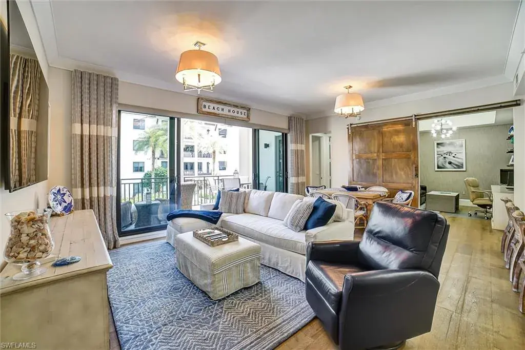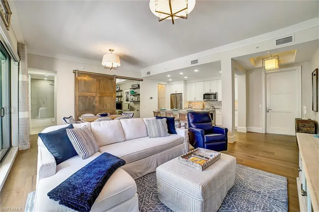 PRICE JUST REFRESHED BY $100,000. This breath-taking offering in one of the downtown areas most desirable locations, amenity rich Naples Square. You’ll be sure to want to visit this extraordinary property with the highly sought after east facing courtyard view, complete with 2 bedrooms, 2 bath and den (with new exquisite barn door for added privacy). The owners have spared no expense with, custom designer finishes, hardwood floors throughout (ceramic tile in bathrooms), upgraded granite kitchen counters and backsplash, California closets in bedrooms, electric blinds in main living areas, custom shelving throughout, one of only two units with its own outlet for EV CHARGING at private parking space, PLUS AN INCLUDED 6 PASSENGER CUSTOMIZED GOLF CART for easy access to Naples’ sugar sand beaches and all that world renown Fifth Avenue and Third Street have to offer Of course Naples Square is still an easy walk as well!)! Naples Square offers a private pool and spa, fitness center, fire pit and club room (complete with catering kitchen and billiards table) for gatherings of all types. This luxurious unit is being offered turnkey with a few exclusions.
