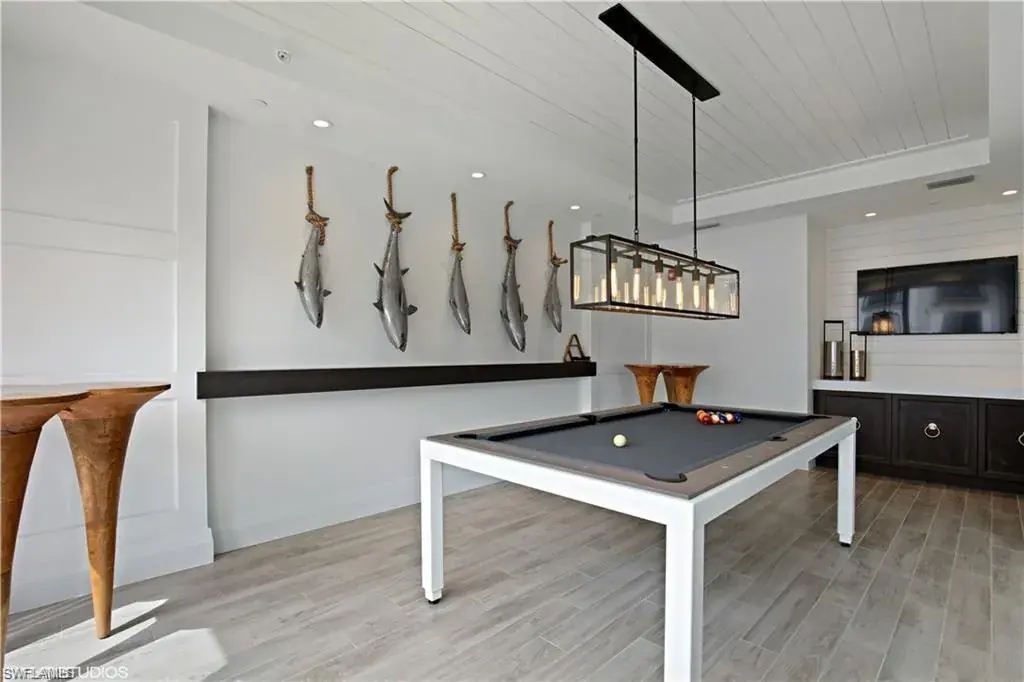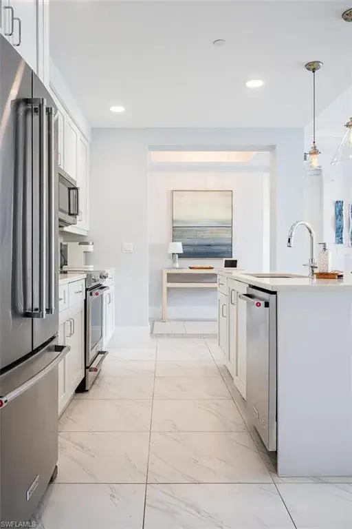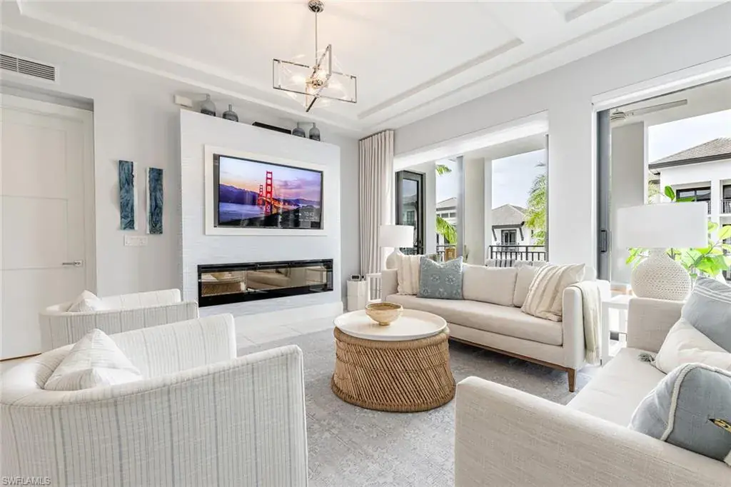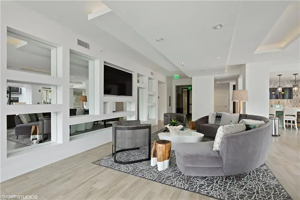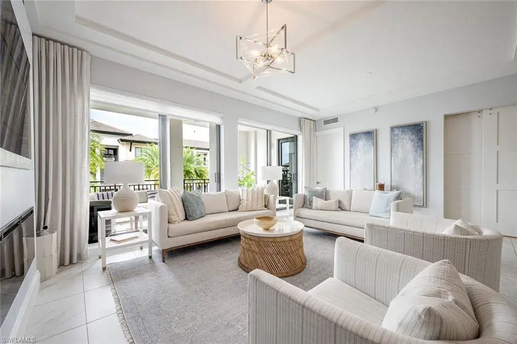 Once a model home, this residence shines with exceptional designer finishes and abundant natural light. Wood flooring in the bedrooms adds warmth and continuity to the open layout, complemented by shiplap-accented walls and custom barn doors that bring a touch of coastal elegance. Every detail reflects refined craftsmanship—from the hand-painted fireplace surround to the custom bath finishes with hand-rolled crystal paint and the den enhanced by sophisticated built-ins. The contemporary kitchen features sleek cabinetry, premium appliances, and modern fixtures—perfect for both entertaining and everyday living. Step out to the spacious lanai and enjoy tranquil courtyard views with lush landscaping, a sparkling pool, spa, and inviting greenspace. Thanks to its desirable western exposure, you can unwind each evening while taking in Naples’ famous sunsets right from your balcony. An attached storage area of approximately 90 square feet adds convenience and functionality to this exceptional offering. With effortless access to Naples’ best attractions—including Bayfront, Tin City, and Baker Park—this residence offers the ideal blend of style, sophistication, and an unbeatable downtown location.