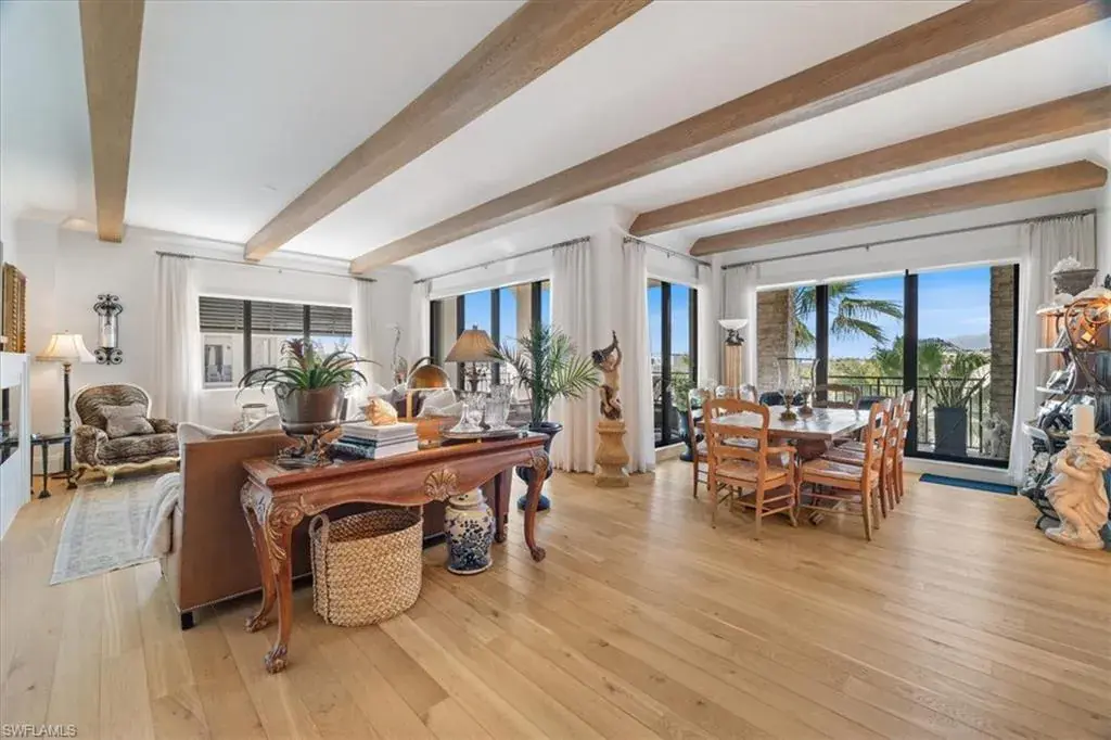 Welcome to an exquisite corner unit in the prestigious Naples Square III, where luxury meets convenience in the heart of Naples, FL. This remarkable residence boasts a spacious 2,404 square feet of elegant living space, featuring three beautifully appointed bedrooms, an additional den/office, and three full bathrooms. As you step inside, you’re greeted by an open floor plan that seamlessly blends modern sophistication with comfort. The living area is adorned with bright light, wood beams and detailed crown mouldings, creating an ambiance of timeless elegance. The chef’s kitchen is a culinary masterpiece, equipped with a high-end gas cooktop, wall oven, and a striking island perfect for entertaining. Custom cabinets with a matching vent hood, a stylish backsplash, and luxurious quartz countertops complete this dream kitchen. Retreat to the master suite, where you’ll find a private balcony offering serene sunset views. The en-suite bathroom is a haven of relaxation, featuring dual vanities, a soaking tub, and a separate shower, providing a spa-like experience at home. This home is designed with convenience in mind, offering top-of-the-line amenities such as a dishwasher, dryer, freezer, high-speed internet, pantry, range, recessed lighting, refrigerator, tile floors, and washer. Residents of Naples Square III enjoy exclusive access to a state-of-the-art gym, an expansive outdoor terrace with a pool, and a club room, perfect for hosting gatherings. The unparalleled location offers walkable access to downtown Naples’ vibrant entertainment scene, a variety of dining options, and the stunning beaches. Discover a lifestyle of elegance and ease in this unmatched residence. Your luxurious Naples retreat awaits!