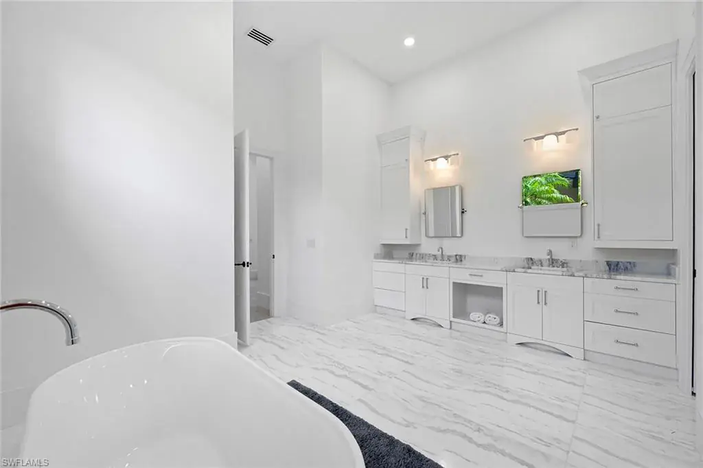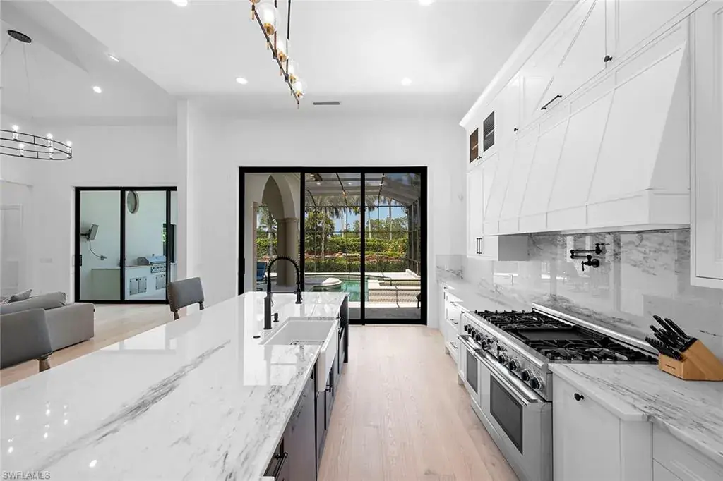In the prestigious Tiburon community, this five-bedroom, 4.5-bath estate has been completely renovated for open-concept living, blending modern elegance with timeless sophistication. Thoughtfully curated finishes and designer details elevate every space, creating an inviting yet luxurious atmosphere. New White Oak hardwood floors flow seamlessly throughout, enhancing the open and airy feel. The custom-designed kitchen is a chef’s dream, featuring Décor cabinetry, luxury appliances and quartzite countertops, ideal for everyday living and entertaining. New Marvin impact windows and sliders not only enhance the home’s beauty but also provide superior insulation, allowing for a peaceful and quiet indoor retreat. Enter into spa-like serenity in the fully renovated primary bath, where a frameless glass walk-in shower with floor-to-ceiling natural stone, a sculptural free-standing tub, and a custom double vanity with high-end cabinetry create a tranquil retreat. Every detail is designed for beauty, function and relaxation. The outdoor living space is equally impressive, featuring a private heated pool and spa, a newly finished pool surround, and a fully equipped outdoor kitchen with a new grill, ideal for entertaining. A generous backyard retreat offers serene fountain views, providing a peaceful setting for morning coffee or evening gatherings. A private guest cabana ensures a comfortable, stylish space for family and friends. In one of Naples sought-after enclaves, this home offers access to world-class golf, resort-style amenities and the unparalleled service of The Ritz-Carlton. This is a rare opportunity to own a fully reimagined luxury home in the heart of Tiburon.