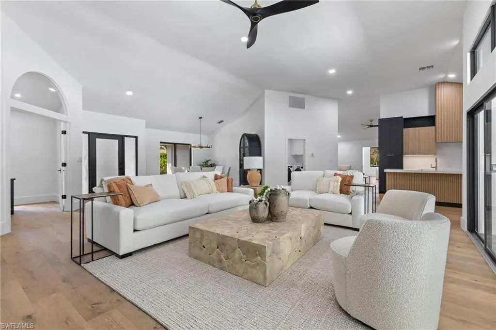 Tastefully renovated residence in the Oakmont community of Pelican Bay offered furnished for immediate move in. The spacious 3200 sqft under air, 4+den/ 3 bath offers exclusivity in one of Naples’ premier locations. Meticulously finished, this elegant estate boasts an open floor plan w/voluminous ceilings and a Northeast exposure, filling rooms with vibrant natural light. As you enter the home a Chef’s kitchen commands attention w/sharp modern lines, acacia wood paneling accents, Fisher Paykel appliances w/ quartz counters. The master corridor includes a walk in closet w/center island, master bath w/dual-vanity and soaker tub, and floor to ceiling slider doors for the perfect view of your pool. Stepping outdoors, the covered patio includes a TV and a fireplace, space to entertain, all housed by a tasteful sloped shiplap ceiling. Pelican Bay offers exclusive amenities such as 2 private beach pavilions, a full-service fitness center, professionally staffed tennis facilities and much more! Conveniently located just minutes from Mercato and the Waterside shops, and a short distance from 3rd Street South’s and 5th Avenue South’s fine dining, world-class shopping and white sand beaches.