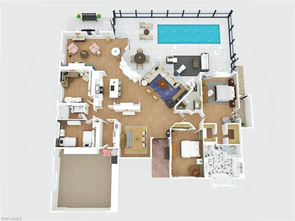 Additional upgrades include all new hurricane-impact resistant windows and doors, wood flooring throughout, 2022 roof, 2022 & 2023 air conditioners, 2023 garage door, 2023 pool heater, all new plumbing installed in 2022, a whole-house generator with a designated 500-gallon propane tank, a climate-controlled garage with EV charger and a dedicated dog run for your four-legged family members.