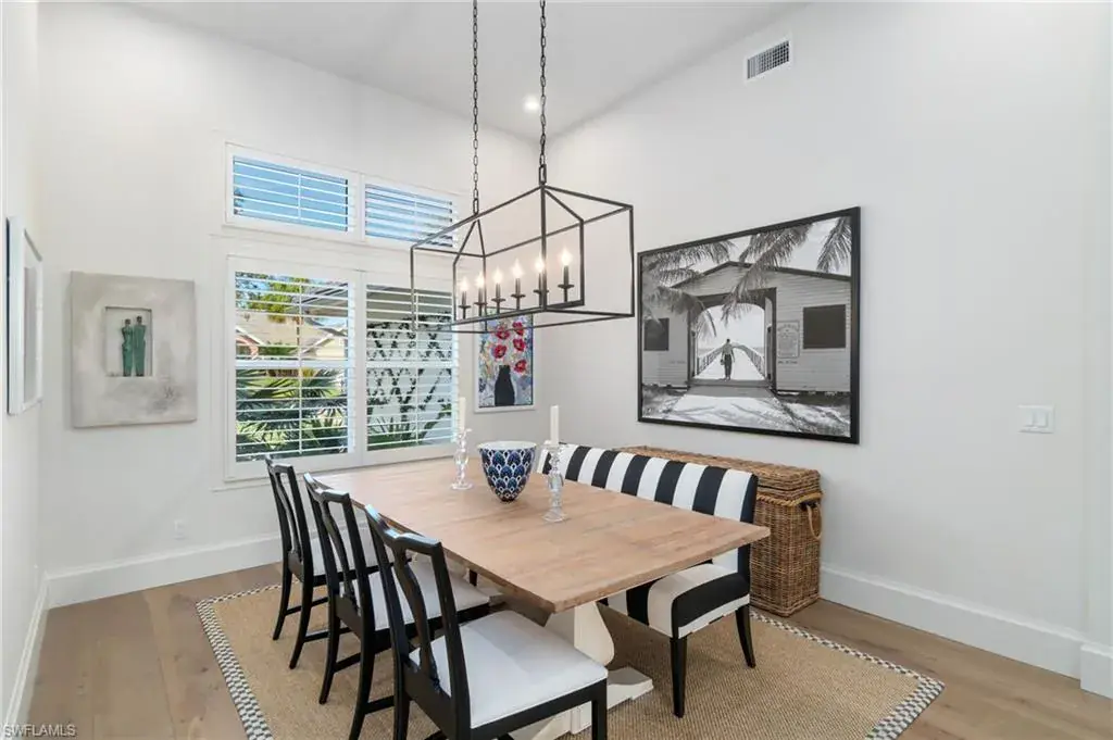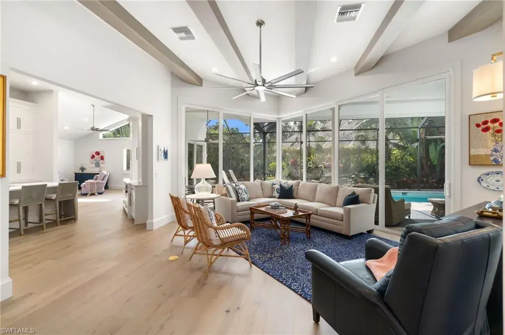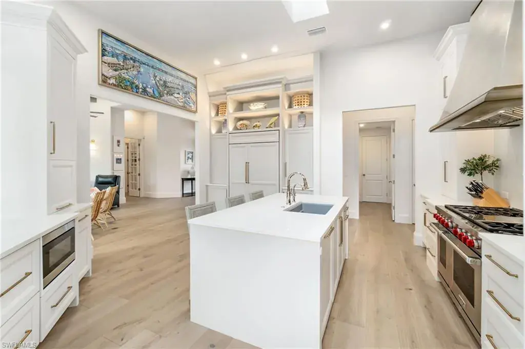 The chef’s kitchen features a custom pewter hood, quartz countertops, solid wood cabinetry, two refrigerator drawers and top-of-the-line appliances, including a Sub-Zero refrigerator and Wolf gas range. Flowing seamlessly into both the family and living rooms, the home opens to a generous screened lanai with a large pool, covered dining and lounging areas, and plenty of space for sunbathing.