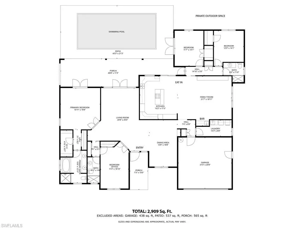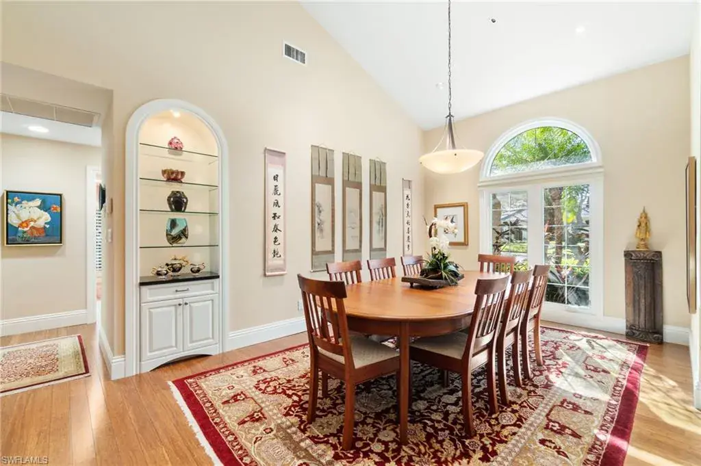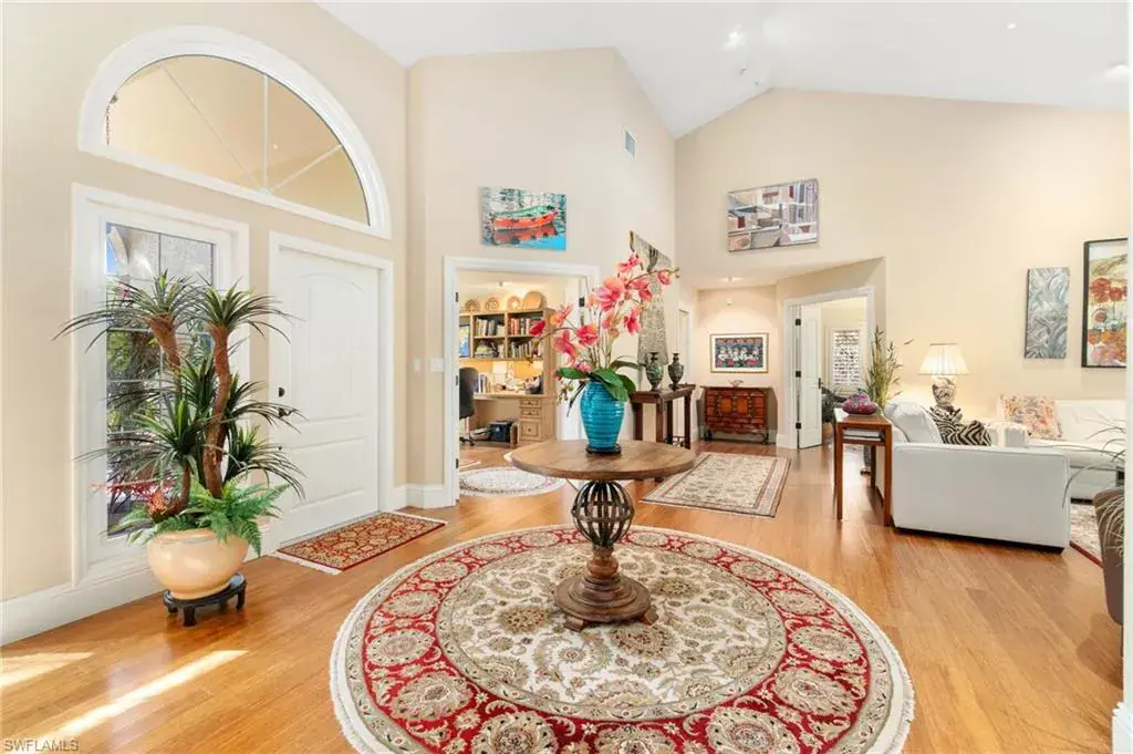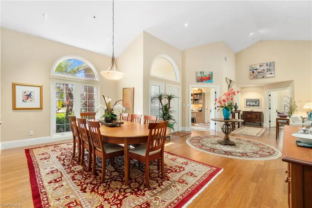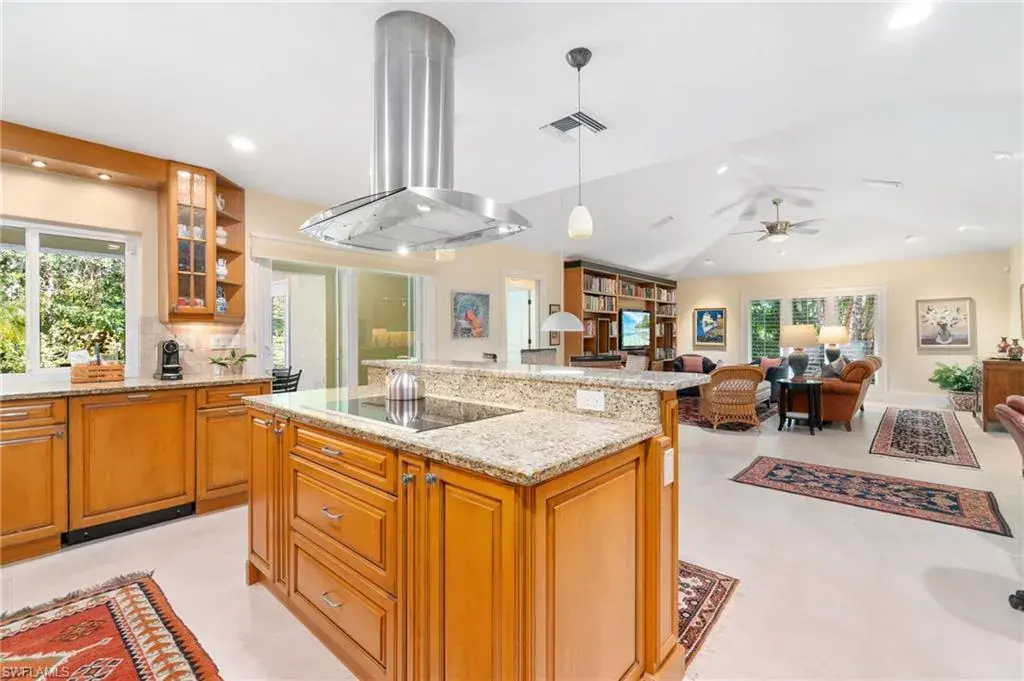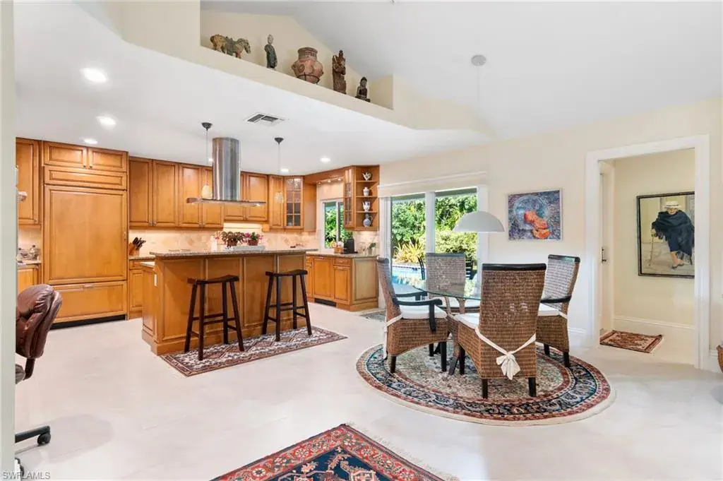 Step inside and you’re greeted by soaring cathedral ceilings and an open concept living and dining area, creating an inviting space perfect for both relaxing and entertaining. The chef’s kitchen is a standout, complete with an island, in-kitchen dining, and top-of-the-line Subzero appliances. The seamless flow into the family room features a built-in wet bar making this home ideal for hosting guests. The split floor plan offers privacy and functionality. On one wing, the spacious primary suite opens directly to the pool and outdoor spaces, while two additional bedrooms are tucked away in their own separate wing. A large laundry room adds convenience, and the fourth bedroom can serve as an office or a guest room, with easy access to a full guest bath.