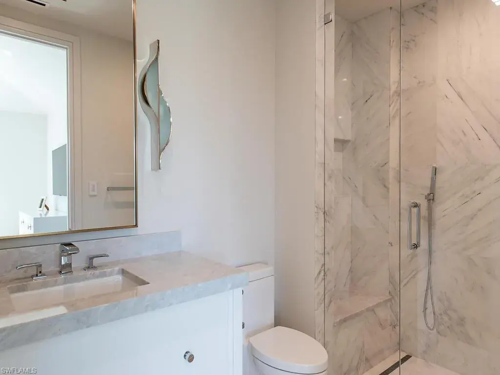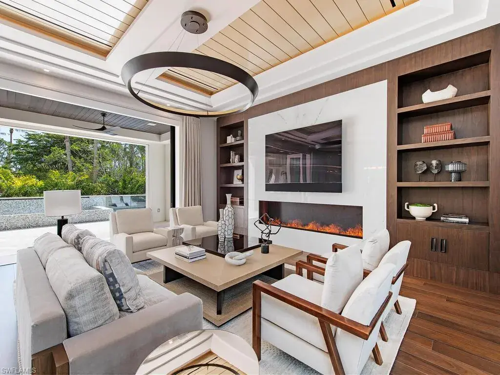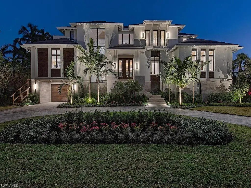 Located in a unique, gated beachfront enclave consisting of a mere nine homes, this newly completed residence penned by Stofft Cooney, built by Equinox Construction, and brought to life by Carrie Brigham Design, is striking and unmatched in the caliber of construction and finishes. A cantilevered walnut staircase flanked by glass balustrades offers intrigue to those who enter the great-room style floor plan hosting 5 bedrooms + club room, 7 full and 2 half bathrooms, a wine room coated in old world antique mirror Argenta tile, walnut flooring throughout, private elevator, and a rarely found 7-car garage. A luxurious kitchen hosts a marble mosaic backsplash, double islands, as well as top-tier appliances. While the grand master bedroom is located on the first floor, the second level features an additional master option with ensuite his and her bathrooms, as well as a VIP suite offering spectacular Gulf views. One can revel in the Gulf views from the sprawling outdoor environs located off of the main living level that provides covered/uncovered areas for relaxation, an infinity edge spa, sunshelf, fireplace, a state-of-the-art outdoor kitchen, and a zero-edge pool below.