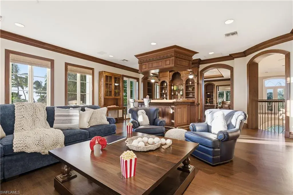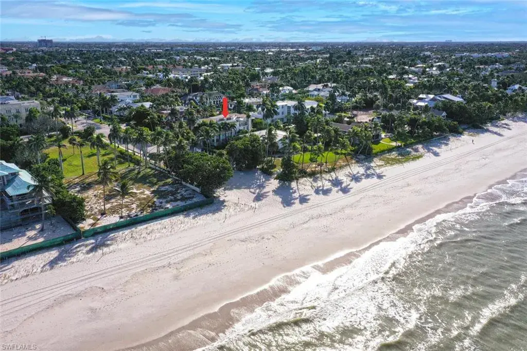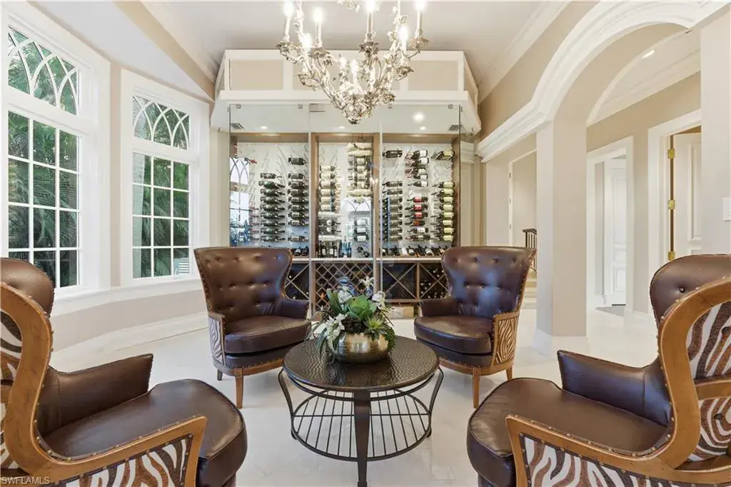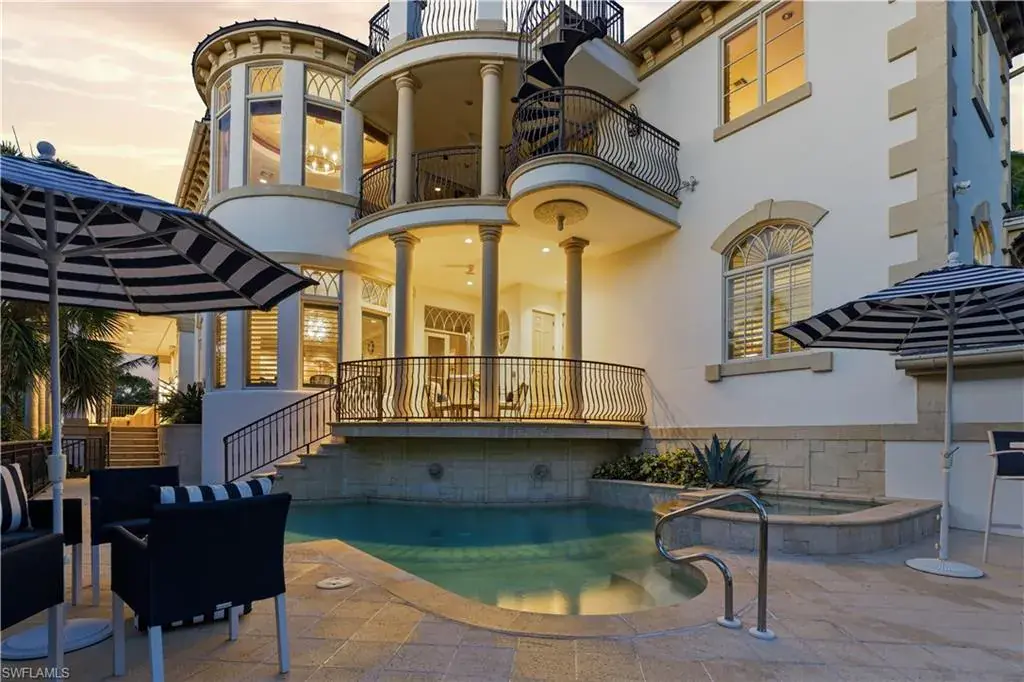 Old Naples timeless architecture with modern comforts. The elevation is high and dry with views of the gulf and multiple expansive terraces and roof top deck. Upon arrival 24’ ceiling height with stunning 6’ John Walker chandelier and curved mahogany stair case. Shows topping curb appeal circular driveway, power gates, paver walkways & lush landscaping boarder the 85’ X 150’ lot. Rear alley access to 3 car garage & elevator that serves to all living levels.The fireplace living room adjacent to the wine room for intimate retreats ultimate venues for family friends gatherings. Family room filled with light and french doors that lead out to spacious open air terrace with views of the Gulf. Ultimate culinary chefs kitchen /Viking gas stove, the center island. Kitchen dining area in the round with rotunda ceiling seats 10 around the custom round table and topped off with designer lighting. First level- luxurious primary suite with stain glass window in bathroom, large walk in closet. Laundry room with porthole window and spacious counters and storage. Second level the Parlor is like stepping into a Hollywood movie set. The detailed millwork, the custom built wood bar, entertainment area that flows with ease to adjacent office/ library. French doors open to magnificent open terrace with view of the Gulf of Mexico. Four large guest bedrooms each with private bathrooms. An outside spiral staircase to the roof top decks with built in seating to enjoy sunset. Tucked on south side is the pool, spa and private bath. This home was designed to entertain and is the perfect venue for philanthropy events and family celebrations! Its an active fun lifestyle living downtown Naples.