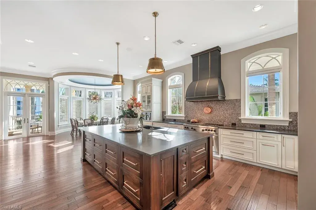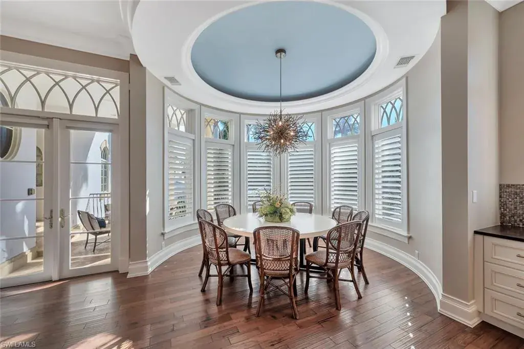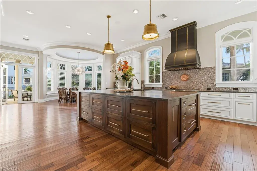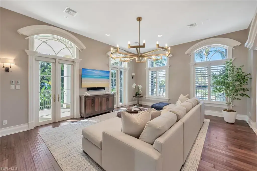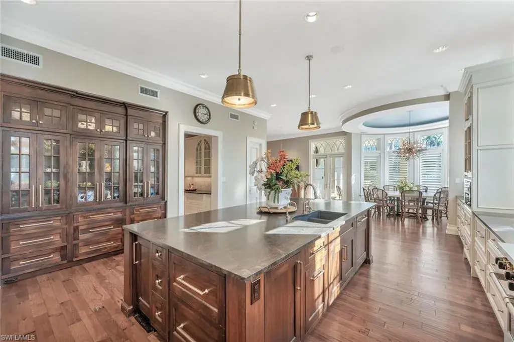 Old Naples timeless architecture with modern comforts. The elevation is high and dry with views of the gulf and multiple expansive terraces and roof top deck. Upon arrival 24’ ceiling height with stunning 6’ John Walker chandelier and curved mahogany stair case. Shows topping curb appeal circular driveway, power gates, paver walkways & lush landscaping boarder the 85’ X 150’ lot. Rear alley access to 3 car garage & elevator that serves to all living levels.The fireplace living room adjacent to the wine room for intimate retreats ultimate venues for family friends gatherings. Family room filled with light and french doors that lead out to spacious open air terrace with views of the Gulf. Ultimate culinary chefs kitchen /Viking gas stove, the center island. Kitchen dining area in the round with rotunda ceiling seats 10 around the custom round table and topped off with designer lighting. First level- luxurious primary suite with stain glass window in bathroom, large walk in closet. Laundry room with porthole window and spacious counters and storage. Second level the Parlor is like stepping into a Hollywood movie set. The detailed millwork, the custom built wood bar, entertainment area that flows with ease to adjacent office/ library. French doors open to magnificent open terrace with view of the Gulf of Mexico. Four large guest bedrooms each with private bathrooms. An outside spiral staircase to the roof top decks with built in seating to enjoy sunset. Tucked on south side is the pool, spa and private bath. This home was designed to entertain and is the perfect venue for philanthropy events and family celebrations! Its an active fun lifestyle living downtown Naples.