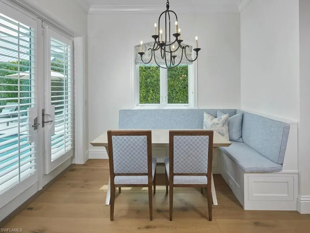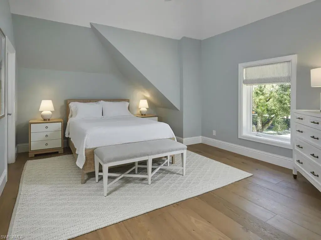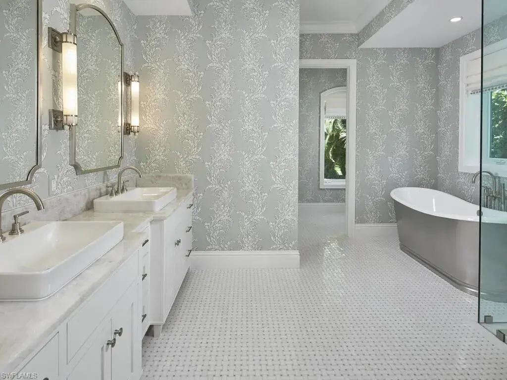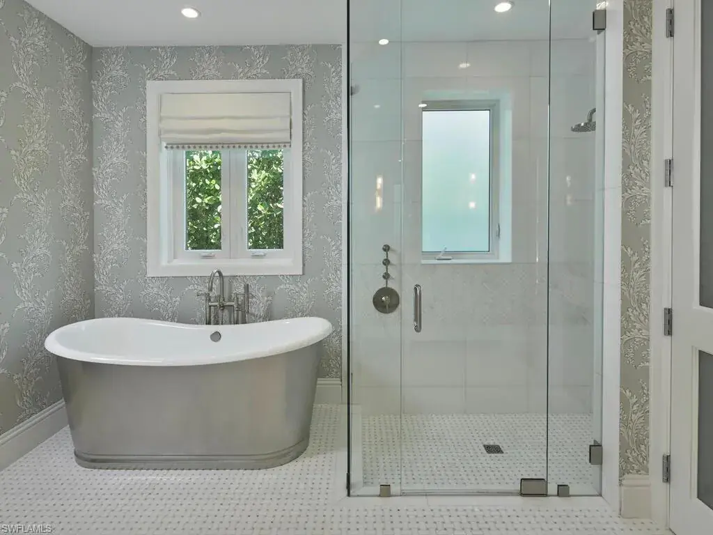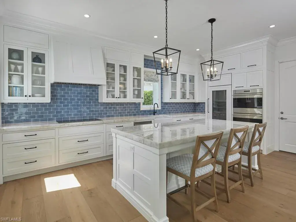 Coastal Home in the Heart of Old Naples. Four blocks from the beach, this 4-bedroom plus den, 3½-bath residence is perfectly positioned on one of the most coveted avenues in Old Naples with southern rear exposure in the desirable X500 flood zone. The home spans 3,772 square feet under air (4,262 total), featuring concrete block construction on both floors and impact-resistant windows and doors for lasting peace of mind. This home captures the essence of the Naples coastal lifestyle – light, bright, and beautifully finished. Completely renovated, the interior showcases custom finishes, designer wallpaper, wide plank wood flooring, plantation shutters and custom window treatments, blending timeless elegance with modern design. The chef’s kitchen features Quartzite countertops, high end Wolf and Sub-Zero appliances, dual wall ovens, beverage and freezer drawers, and a large island ideal for entertaining. The first-floor primary suite includes a spa-inspired bath, freestanding tub, and walk-in shower. Upstairs, two of the three guest bedrooms and a second family room open to private balconies, while both levels feature Maytag laundry appliances.Outdoors, enjoy the saltwater pool equipped with a Pentair automation system, heater and chiller, a brand new 2025 standing-seam aluminum roof and custom shutters, ensuring style and durability for years to come. This home is just minutes from Fifth Avenue South, Third Street South, Naples Pier, and Wynn’s Market.