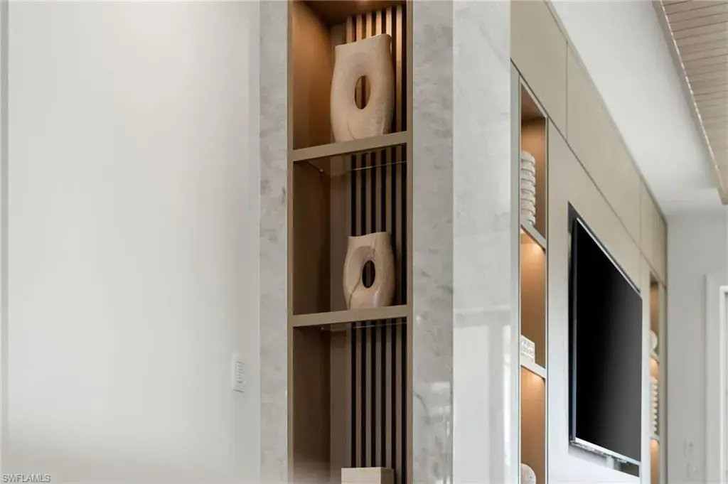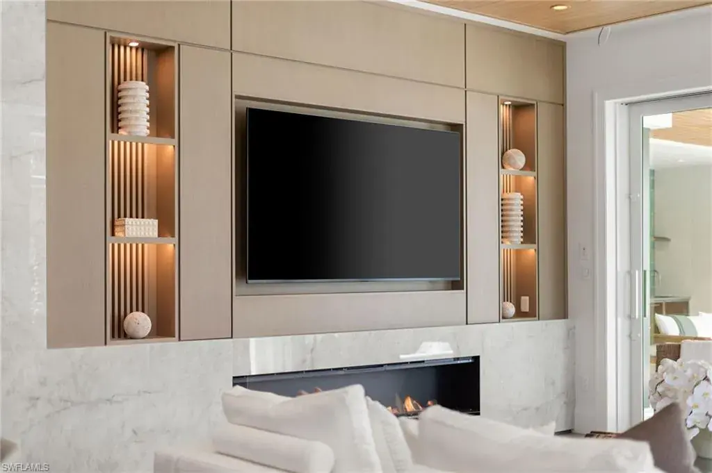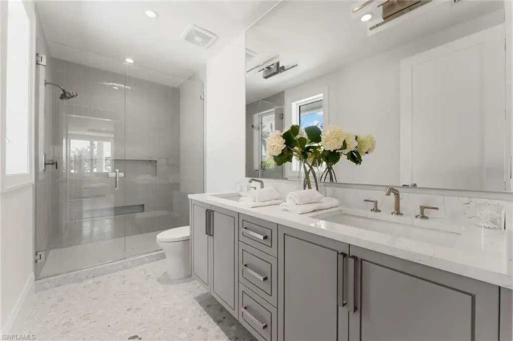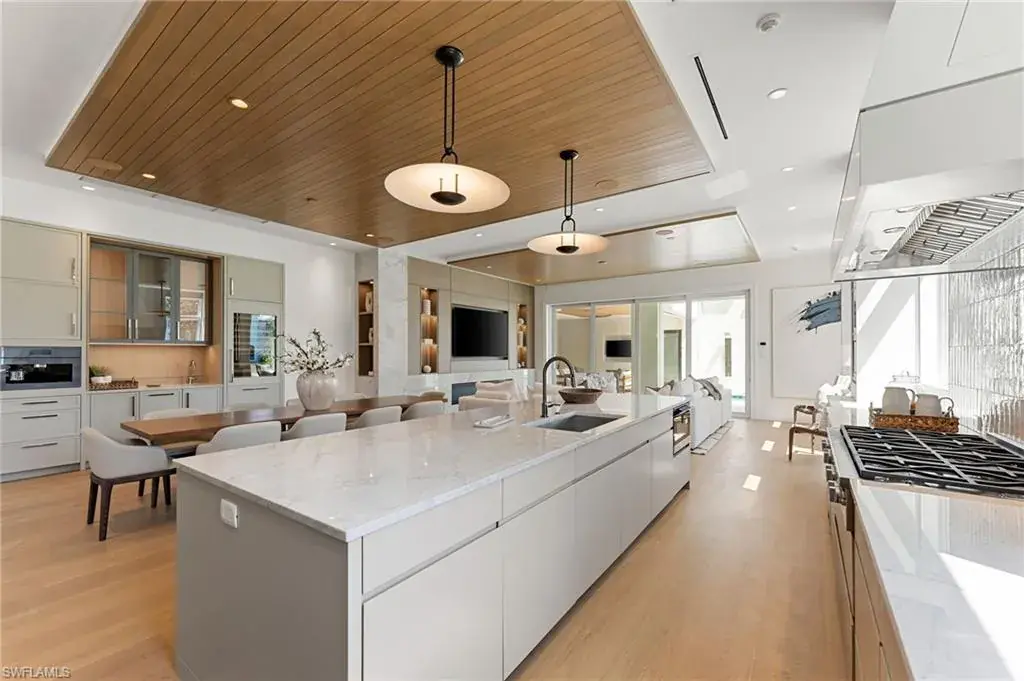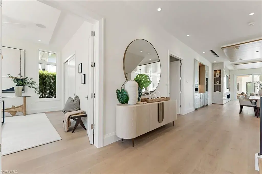 A masterfully crafted collaboration between Jeffrey Fisher Home, renowned architect JMDG, and the highly respected Waterside Builders; this newly completed Olde Naples residence blends elevated design with luxurious livability—just four blocks to the beach and two blocks from the charm of 3rd Street South. Every element of the home reflects attention to detail and timeless sophistication: European white oak floors, custom cabinetry and millwork, floor-to-ceiling glass, and intricate stained oak architectural ceilings. The open-concept floor plan flows through a sunlit study, elegant dining space, and stunning backlit bar into a designer kitchen outfitted with Miele, Wolf, and Sub-Zero appliances, plus a walk in pantry and first-floor laundry. The first-floor primary suite is a true retreat with immediate access to the pool and outdoor living areas. Framed by impact sliders, the living room opens to multiple covered spaces and a plunge / dipping pool and spa. A full summer kitchen and expansive outdoor deck make entertaining effortless. Upstairs offers exceptional flexibility and privacy with three en-suite bedrooms, a large bonus room, a second laundry, and a VIP guest suite. Control4 home automation, generator, natural gas, and electric roll-down screens and shutters provide ultimate comfort, security, and convenience. Positioned in one of the most sought-after pockets of Olde Naples, this bespoke property is a rare opportunity to own a truly exceptional new-construction home—steps from the Gulf, fine dining, and world-class shopping.