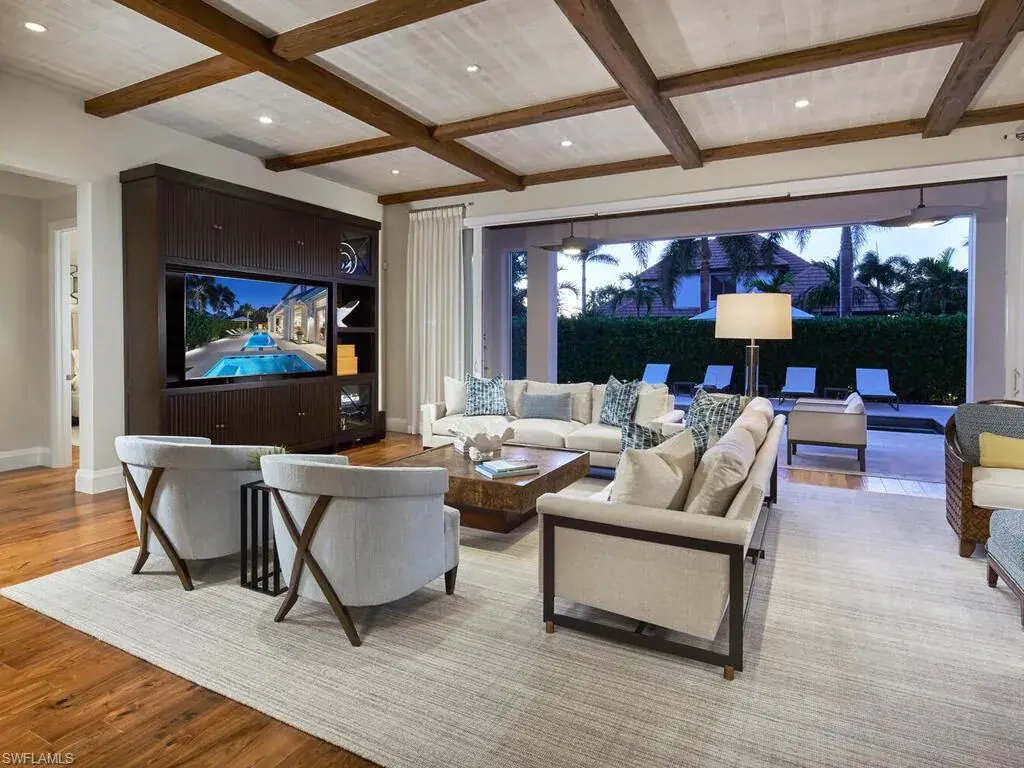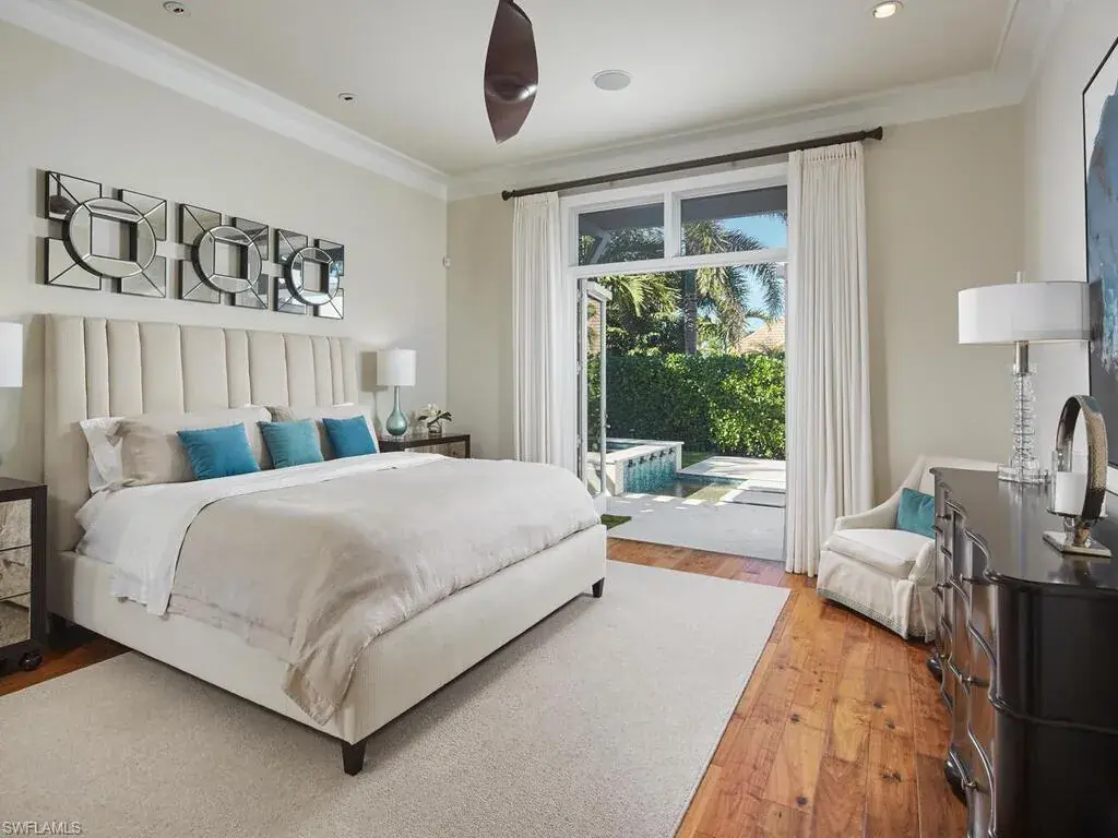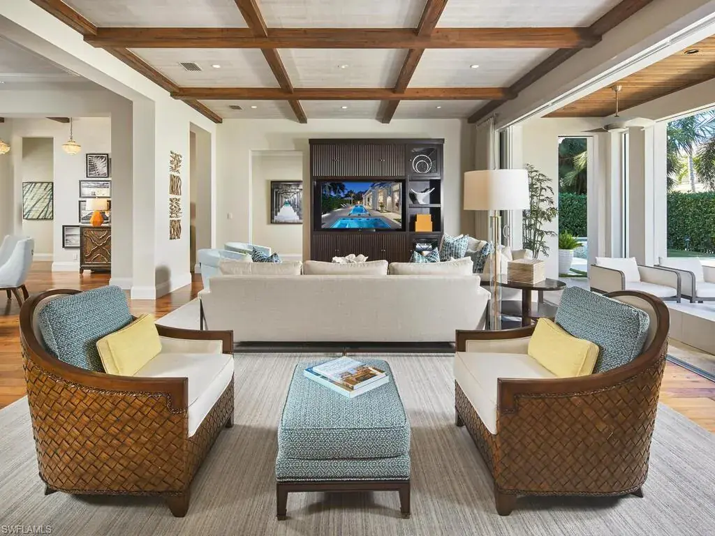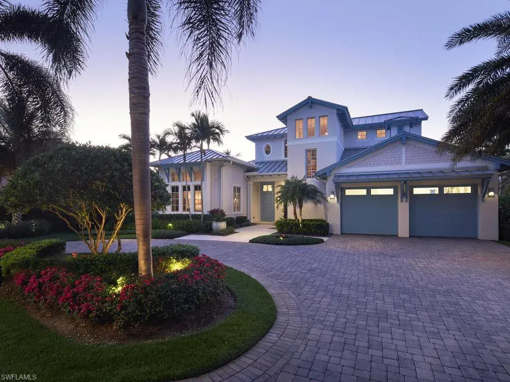Welcome to an extraordinary home that has been impeccably maintained and is conveniently located on a peaceful street in Old Naples. This residence, built in 2016 by London Bay and designed in collaboration with award-winning Romanza Interior Design, showcases a stunning blend of West Indies and Old Florida-inspired architecture, exuding exceptional curb appeal. The open great room plan features warm colors, exquisite finishes and furnishings, and thoughtful details throughout every space. The spacious kitchen includes built-in glass cabinetry, a breakfast nook, walk-in pantry, and a convenient built-in desk area, all complemented by a separate dining room for entertaining. Retreat to the primary suite, which allows for direct access to the beautifully landscaped backyard and boasts two walk-in closets along with a thoughtfully designed, light-filled bathroom leading to a remarkable private outdoor shower. Pocketing sliding glass doors in the main living area allow for an effortless flow to visually stunning and comfortable outdoor spaces including casual seating, dining, lounging area and fire pit. Your guests will be delighted with two spacious guest suites and a cozy loft area on the second floor. Situated in an X500 zone, this property sustained no damage from any storms and feels brand new.