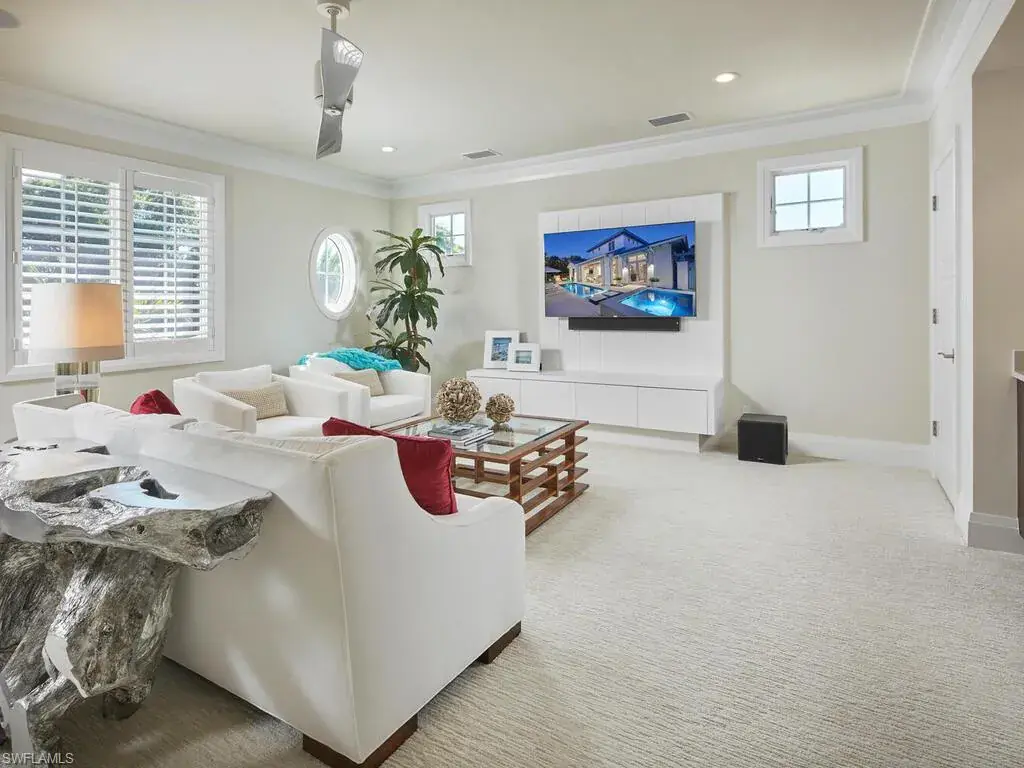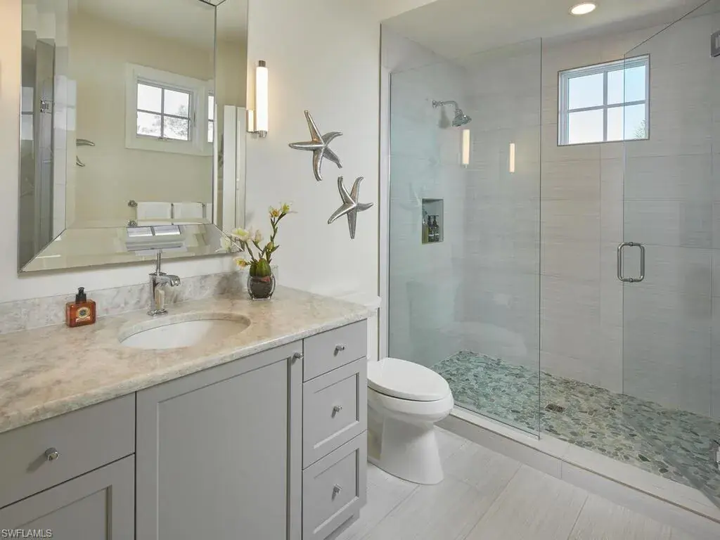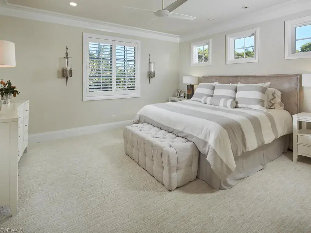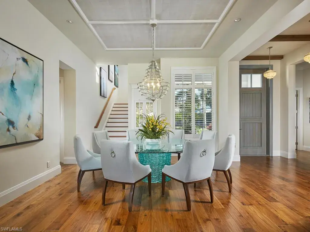 Welcome to an extraordinary home that has been impeccably maintained and is conveniently located on a peaceful street in Old Naples. This residence, built in 2016 by London Bay and designed in collaboration with award-winning Romanza Interior Design, showcases a stunning blend of West Indies and Old Florida-inspired architecture, exuding exceptional curb appeal. The open great room plan features warm colors, exquisite finishes and furnishings, and thoughtful details throughout every space. The spacious kitchen includes built-in glass cabinetry, a breakfast nook, walk-in pantry, and a convenient built-in desk area, all complemented by a separate dining room for entertaining. Retreat to the primary suite, which allows for direct access to the beautifully landscaped backyard and boasts two walk-in closets along with a thoughtfully designed, light-filled bathroom leading to a remarkable private outdoor shower. Pocketing sliding glass doors in the main living area allow for an effortless flow to visually stunning and comfortable outdoor spaces including casual seating, dining, lounging area and fire pit. Your guests will be delighted with two spacious guest suites and a cozy loft area on the second floor. Situated in an X500 zone, this property sustained no damage from any storms and feels brand new.