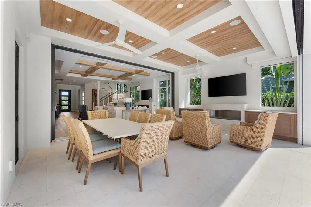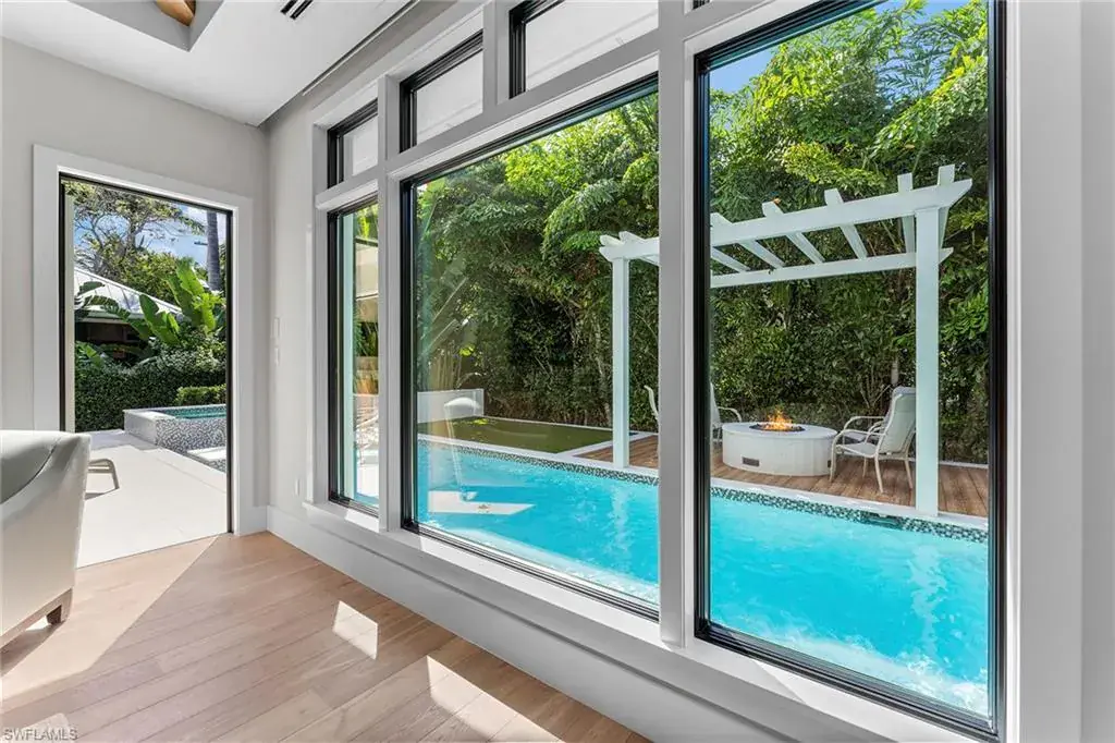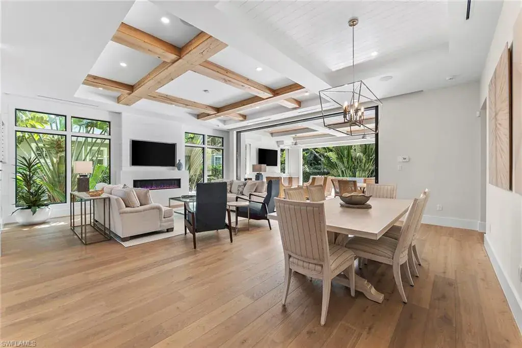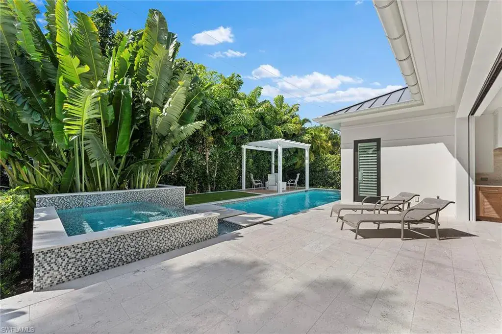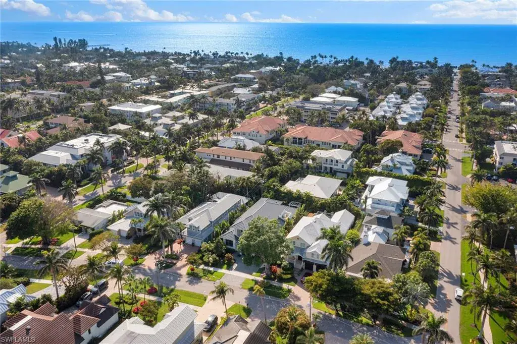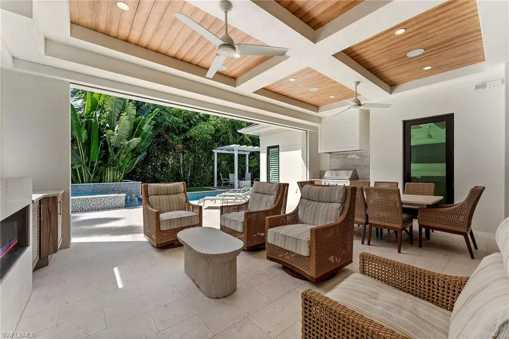 In the vibrant heart of Old Naples, this beautiful residence offers an unparalleled blend of elegance and coastal charm. Just a short distance from shopping and dining on Fifth Avenue and only five blocks from pristine gulf beaches, this exceptional property is the ideal retreat for those who crave luxury and convenience. Go inside to discover an open and airy floor plan, where natural light pours through expansive windows, illuminating stylish living spaces and linear stone fireplaces. The seamless indoor-outdoor flow invites you to relax in the private, lush landscaped backyard, complete with an inviting pool, tranquil fire pit, and multiple areas for lounging and entertaining. The spacious light-filled primary suite is a sanctuary, offering a serene retreat. The spa-like bath includes a soaking tub, a walk-in shower and dual vanities. The home also features four beautifully appointed upstairs guest suites, each designed for comfort and privacy, along with an additional upstairs living area. A generously sized laundry room and an oversized two-car garage complete the space, adding convenience and functionality to this remarkable home.