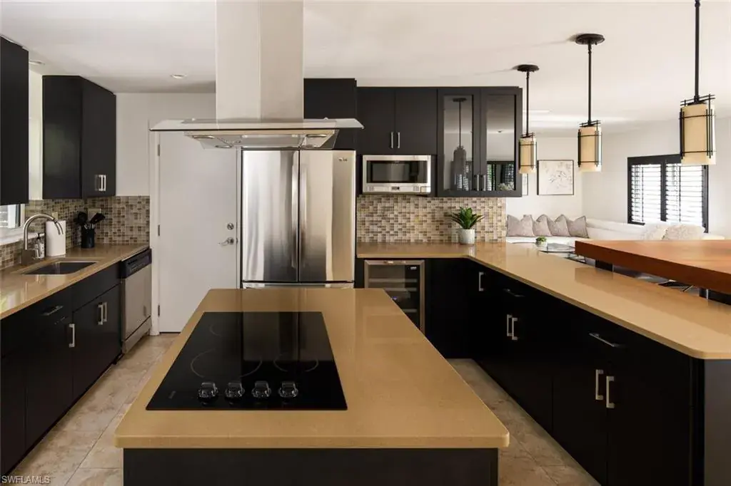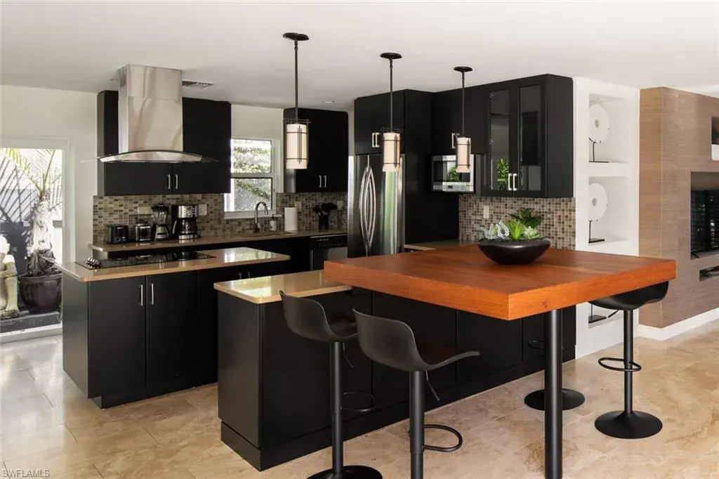 This home features a spacious open kitchen.Natural light floods the interior through PGT hurricane impact windows and doors. The luxurious master bath offers dual sinks, a teak-surrounded soaking tub, and a high-quality steam shower.