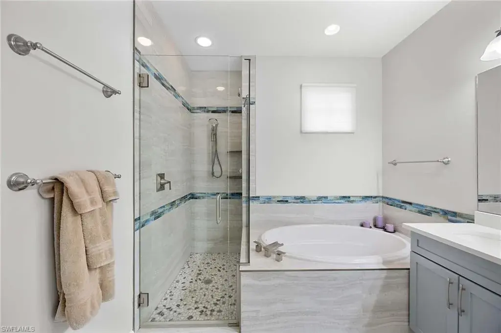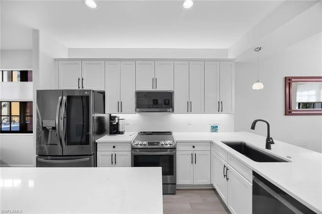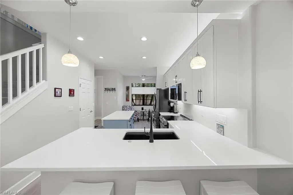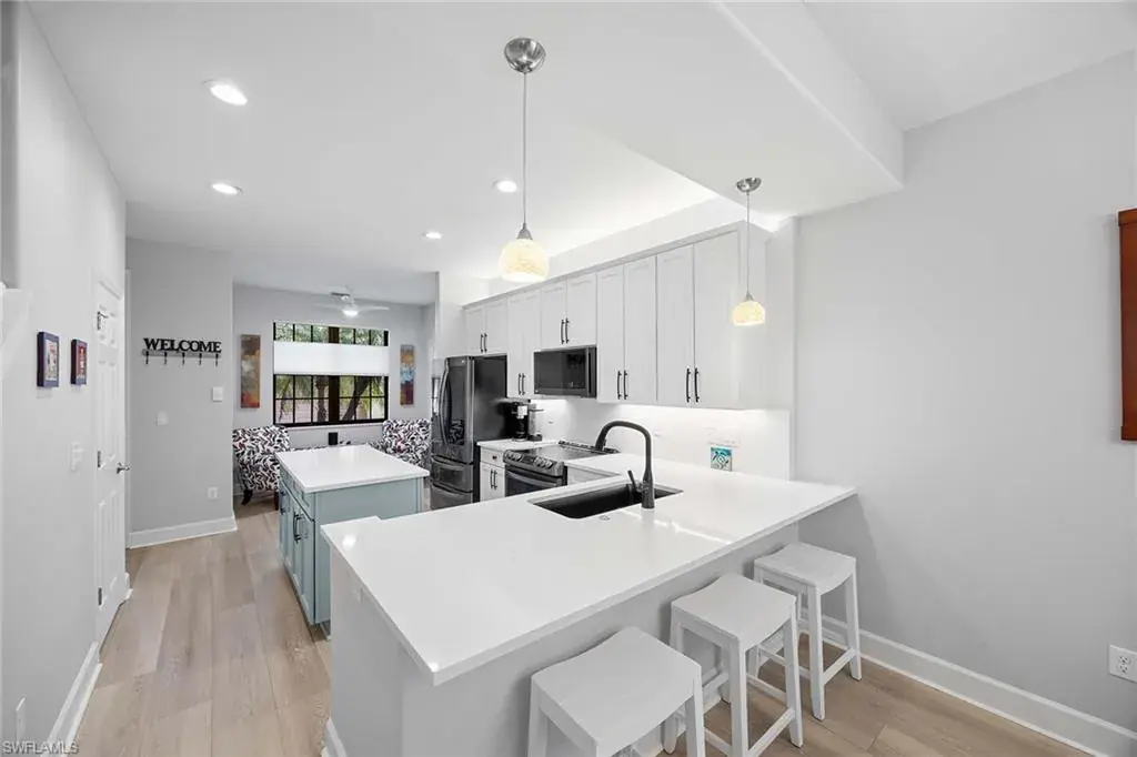 Experience the comfort of a meticulously renovated single-family Capistrano Casita, in the well-appointed community of Ole at Lely Resort. The Capistrano Casita is a popular single-family model with one of the largest floor plans. The open den/loft, used as a flexible space for exercise equipment, office, and extra sleeping area, can be easily converted into an enclosed 11-by-15-foot third bedroom by adding a wall and door. It features a walk-in closet and access to the second bath. A renovation was completed in November 2023, featuring stainless steel kitchen appliances with an induction range, quartz countertops in the kitchen and baths, custom-painted cabinets, and designer tile in both full baths. The primary bath includes matching tub and shower tile. The center island kitchen is a chef’s delight, and the formerly tiered counter was lowered to matching height. Separate but adjacent living and dining rooms provide the openness most appreciate. The HVAC system was upgraded to a higher SEER energy-efficient model in 2022, and water heater received an energy-efficient upgrade in 2023. The interior features soft designer colors and custom Hunter Douglas shades that open from top and bottom. Amenities! The Olé community’s 20,000-square-foot Village Center features a resort pool, kiddie pool, spa, English pub, Bistro, fitness center, movie theater and courts for tennis, pickleball, bocce, volleyball and basketball. These amenities and services are provided as part of your condominium fees. Olé is a featured neighborhood in the acclaimed Lely Resort community that features three golf courses, two of which are open to the public. The location offers convenient access to shopping and dining and is just a short drive from downtown Naples and Marco Island.
