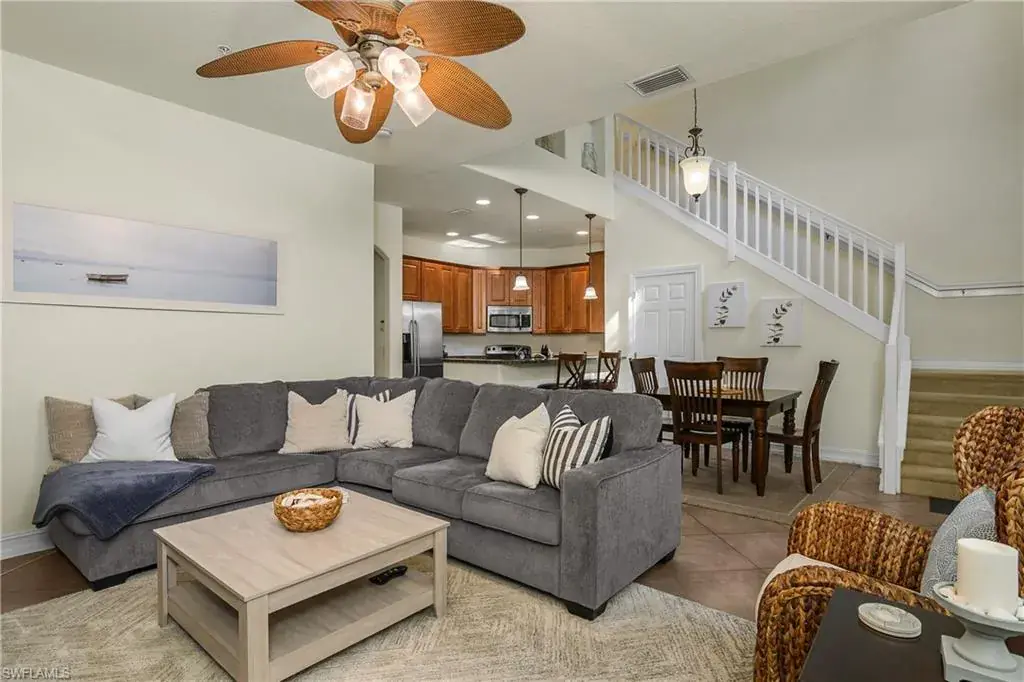 Santa Isabella townhome on a Quad at Ole’ in Lely Resort. This lovely home is being offered turnkey furnished. Front exterior patio with landscaped view. Beautifully decorated first floor has vaulted ceilings, a comfortable great room, dining area, kitchen and half bath. Kitchen has stainless appliances and granite counters. Dinning area has storage closet that can be used as a panty. Second floor has two generous bedrooms and two bathrooms. Separate laundry room. Loft area provides a built-in office space. Attached one car garage with private entry. Hurricane windows and doors for storm protection. Quad area provide a social setting with a relaxing pool, grill area and multiple seating areas. The Village Center provides a resort style pool, kiddie pool, spa, volleyball, bocce, fitness center, pickleball, basketball, tennis, movie theatre, and an onsite pub and ice cream parlor. A short drive to the stunning beaches, amazing restaurants, unique cultural activities. Multiple golf courses nearby. Ole’ offers the ultimate in Florida Lifestyle!