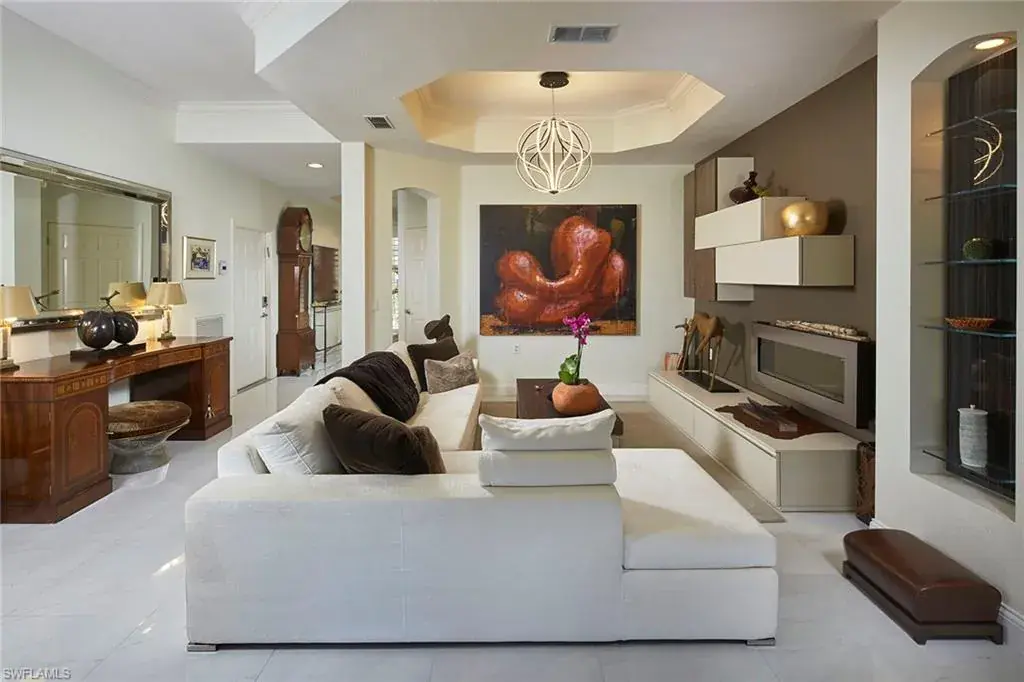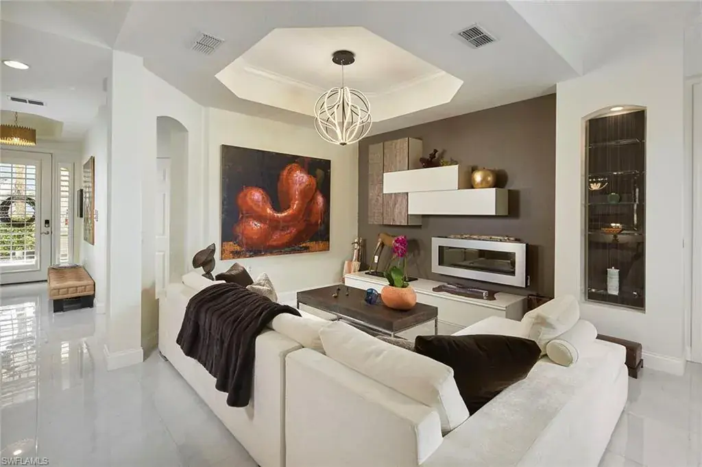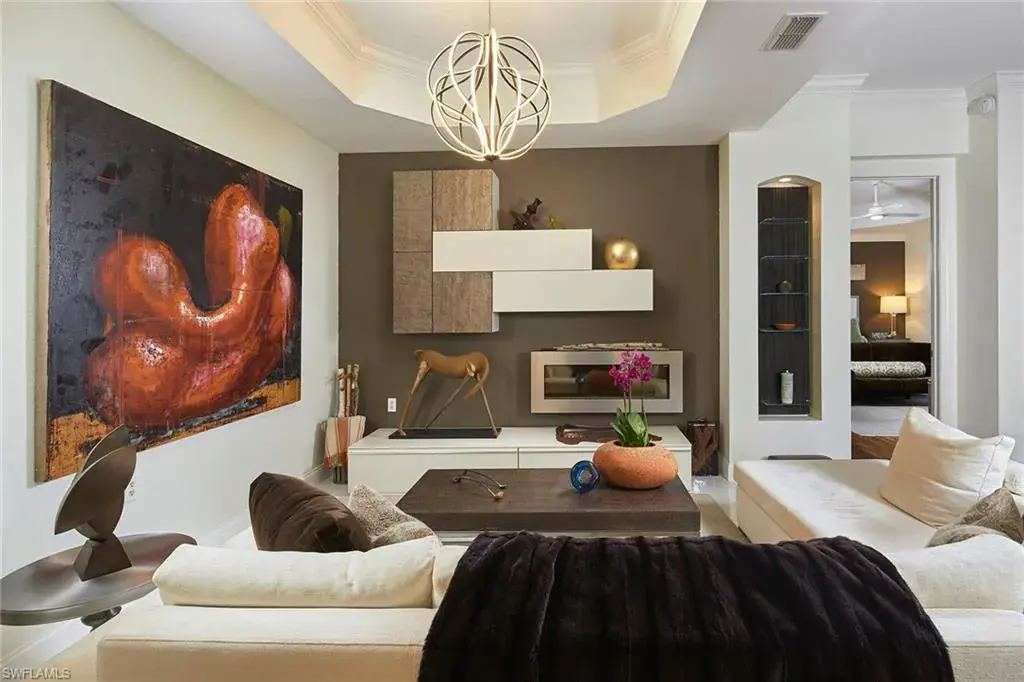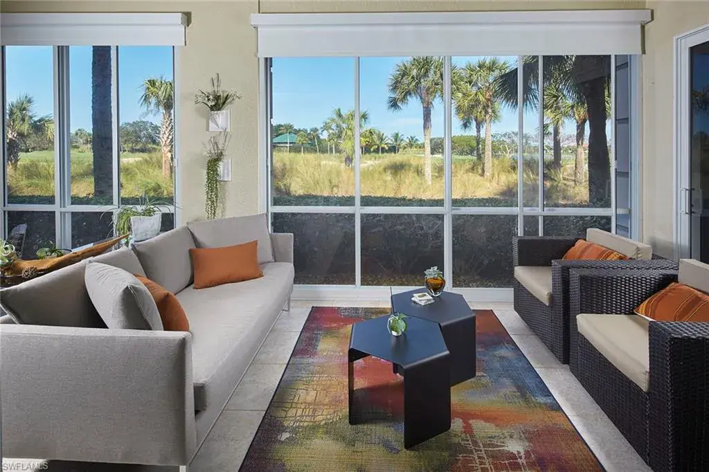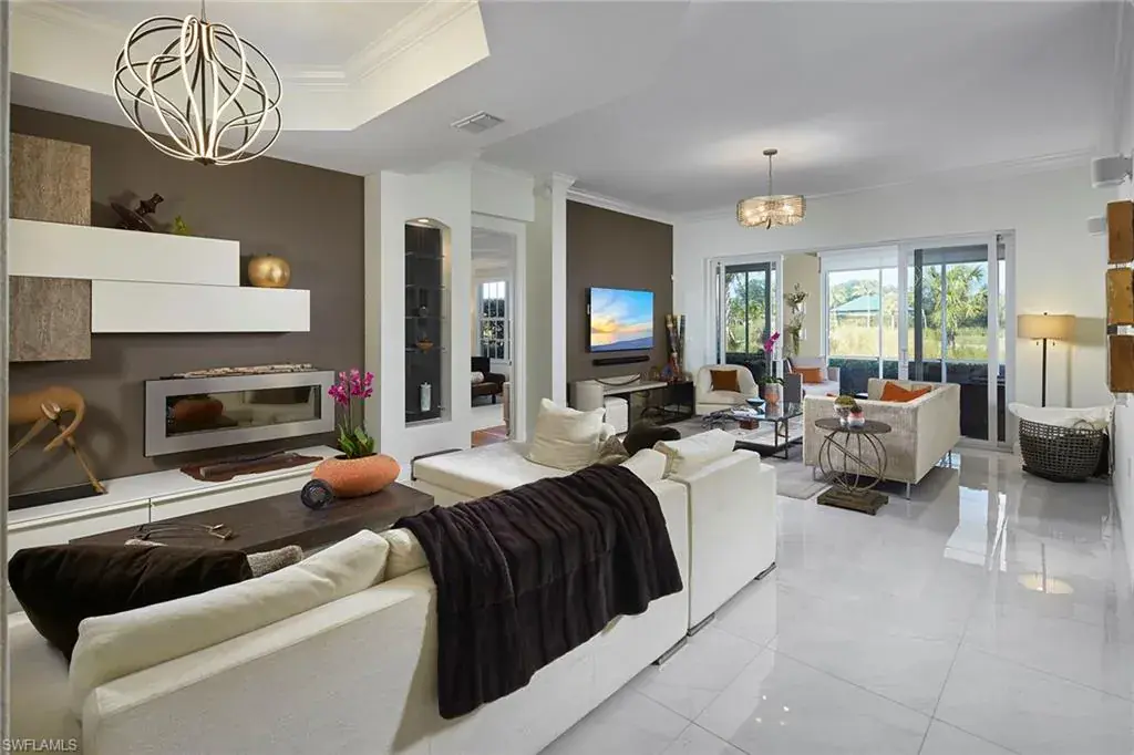 Rare opportunity, architectural designed first-floor condominium in Pelican Marsh has been meticulously maintained, extensively upgraded and updated with many top-of-the-line interior features. The moment you enter you see the expansive, landscaped golf course fairway and lake views. Beautiful oversize porcelain flooring in main areas with gorgeous wood floors in bedrooms. Many custom cabinet built-ins, shelving and storage areas, high-end electric Hunter Douglas museum window shades, new light fixtures, featuring clean, contemporary lines throughout. The kitchen has newer integrated Miele appliances, sink and faucet, with a large eating area featuring custom storage built-ins and beautiful private views. The primary bedroom has lanai access, large walk-in closet with extensive built-ins, a fabulous bath with separate shower and free-standing corner soaking tub. Two additional bedrooms