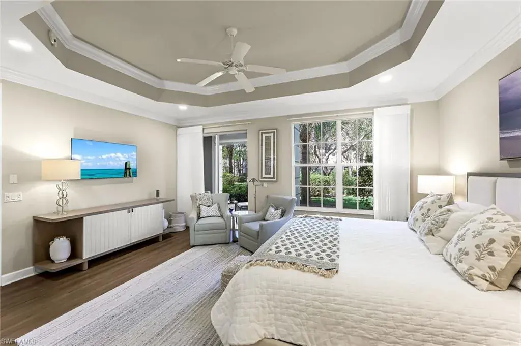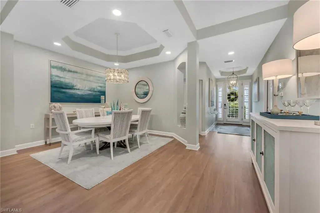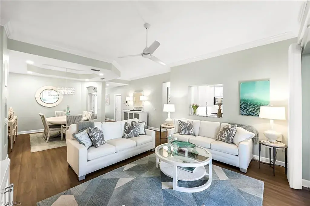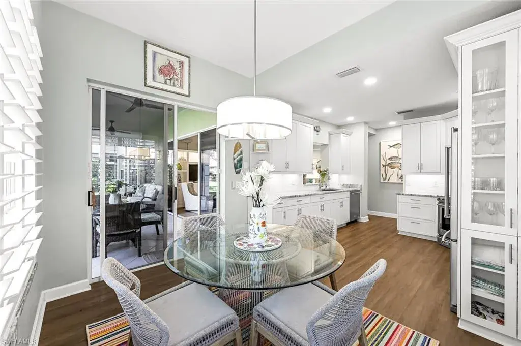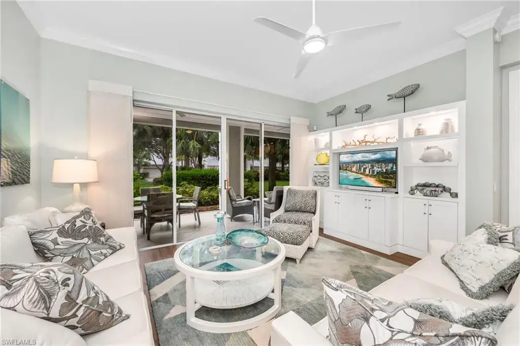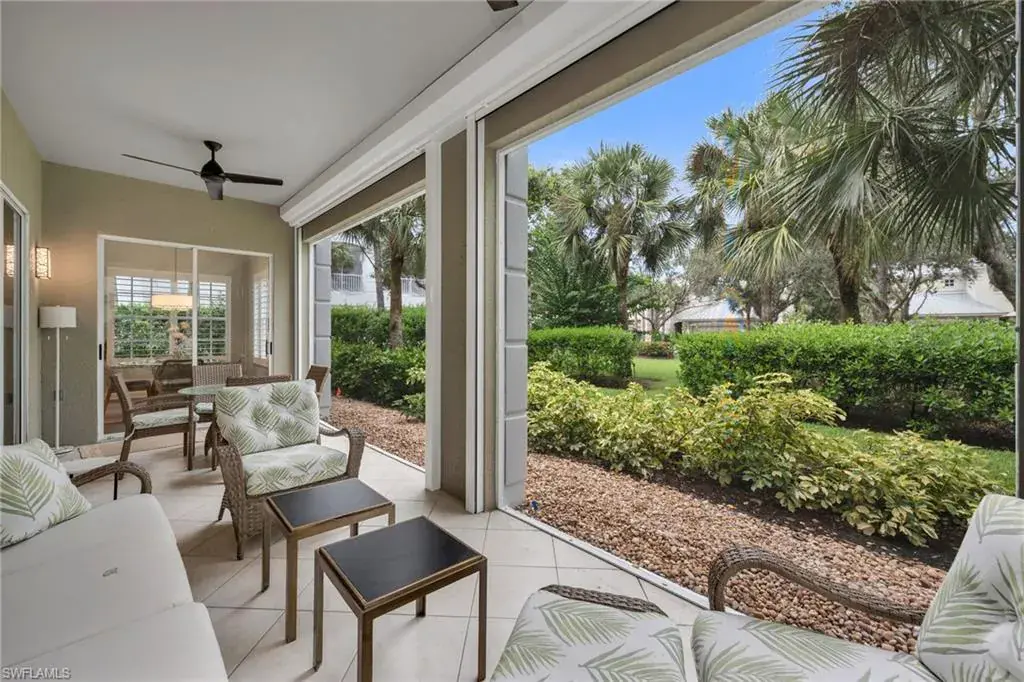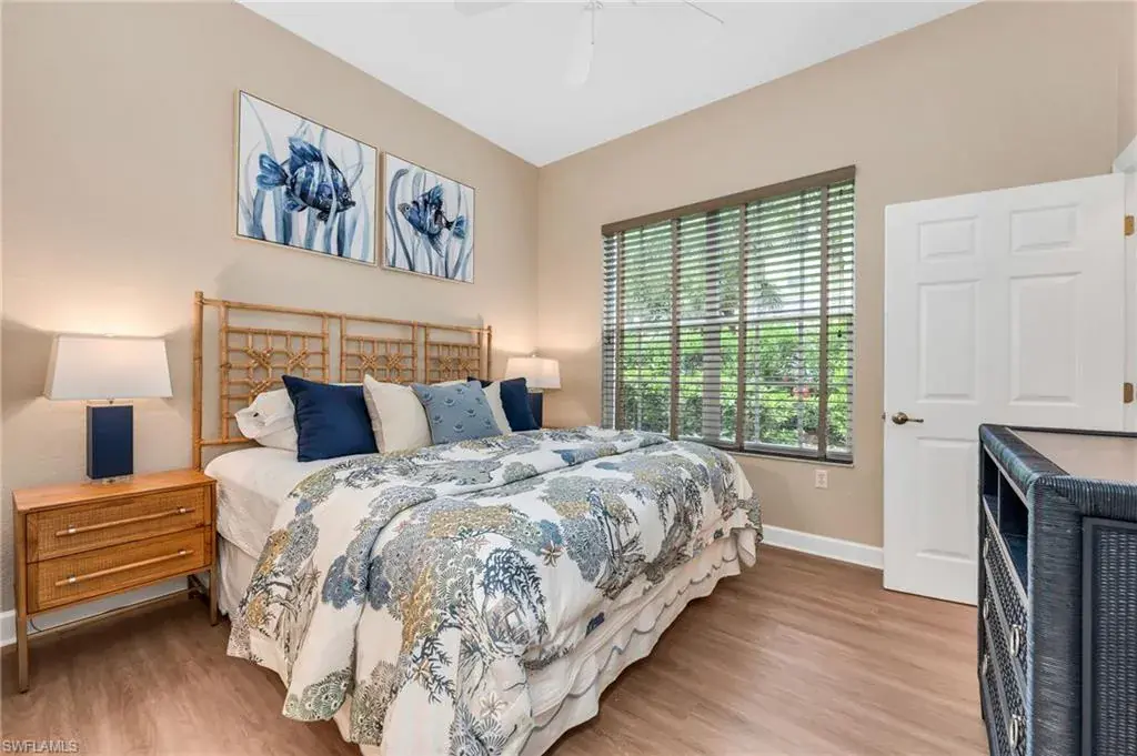 Completely updated, BEAUTIFUL, first floor coach home-no steps. 2BR plus a den (den with built-in desk, can converted back to a closet, for 3rd BR). 2 full and 1/2 bathrooms. Gorgeous LV flooring throughout. Upgraded cabinetry in kitchen/bathrooms and quartz countertops. Guest bath with newly completed shower. Hunter Douglas window treatments and updated light fixtures. Spacious Lanai/w 2 Remote controlled fans and hurricane screens ..there is screened door for easy access to grassy area, perfect for quick pet relief. NEW ROOF, newly painted exterior and updated lighting. The Pelican Marsh community has many amenities, including a restaurant, 6 very active pickleball courts, 8 tennis courts, bocce, attended fitness center with a variety of classes, and much more!!!! Make your activity or dining reservations on your app, once you are an owner, in this well located community in North Naples. Walk to the Farmers Market on most Saturday mornings. 3 Guard gated and 1 un-manned gate allows access. This is a property, not to be missed.