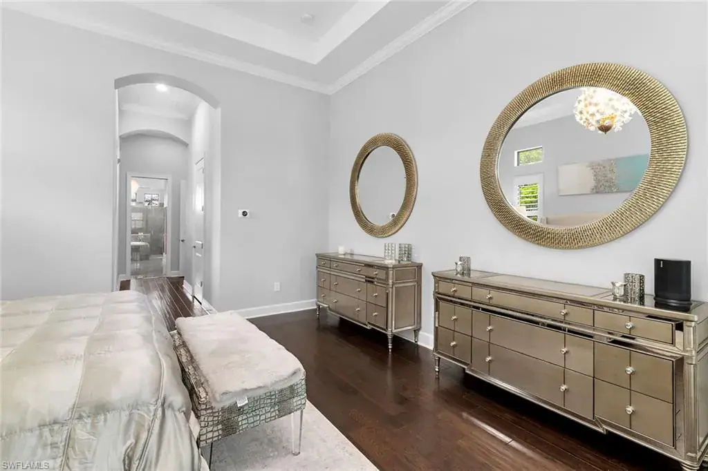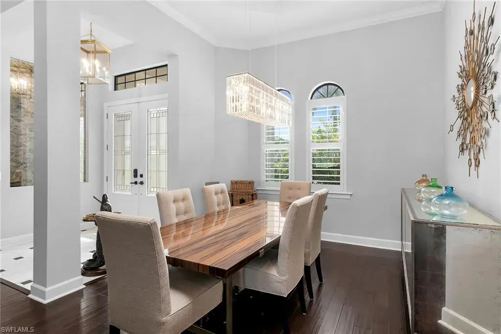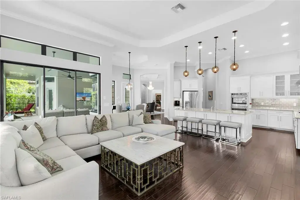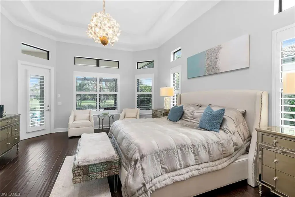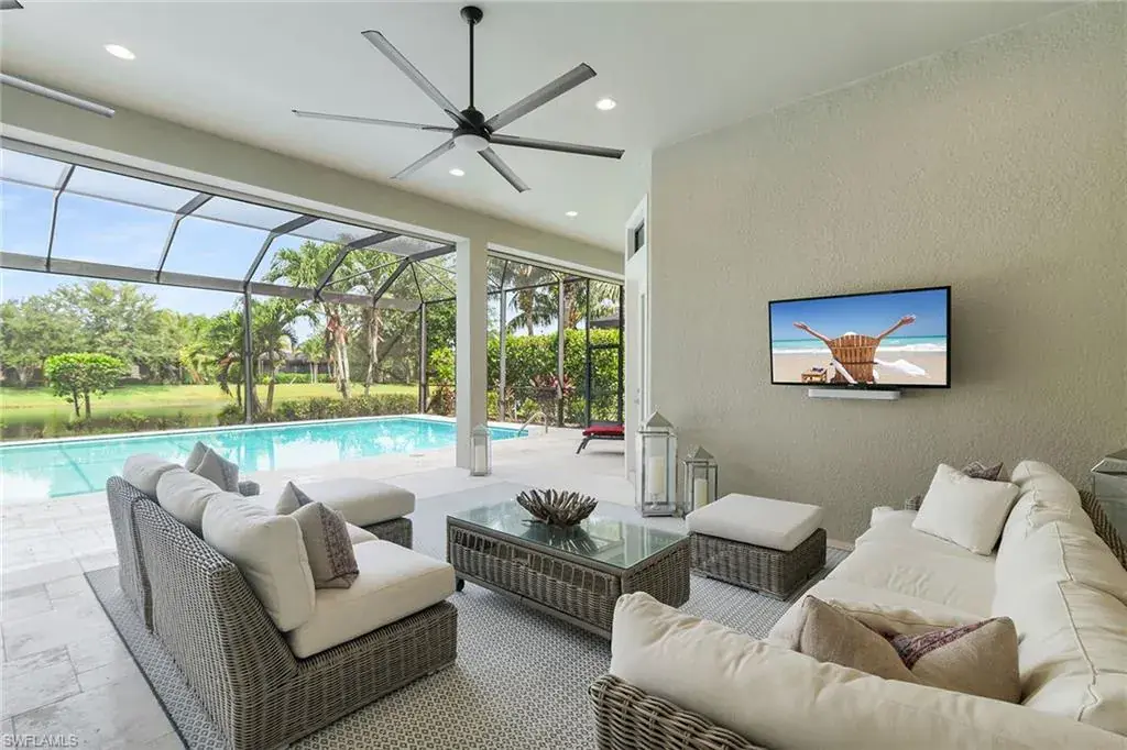 Beautiful sunsets from this home, with western exposure overlooking the large lake. More than 3,500 square feet of living space under air, including an open floor plan with a living room, dining room, family room, three bedrooms plus a den, and three-and-a-half baths. Special features include a full-house Generac generator with Wi-Fi, central vacuum, two air conditioners, plantation shutters throughout the house, and a featured glass wine room. The gourmet kitchen includes GE Cafe stainless steel appliances, a wine refrigerator, under-cabinet lighting, glass pendant light fixtures, and a glass tile backsplash. The primary suite bath has porcelain tile flooring, a walk-through shower with multiple showerheads, dual sinks, and a linen closet. Impact doors and windows throughout with Storm Smart screens on the lanai, which features about 2,500 square feet of outdoor living area, including the largest residential pool in Fiddler’s Creek, a nine-person spa, an extended lanai with natural stone pavers and a picture window screen. The outdoor kitchen includes a Fire Magic Echelon grill, Big Green Egg smoker, mini refrigerator, ice maker, and a sink and granite countertops with a full stone backsplash extending to the ceiling. The laundry room includes porcelain tile flooring, a utility sink, shelving, and a GE front-loading washer and dryer. The garage has epoxy flooring and overhead storage racks. A life of luxury is ensured in this residence, enhanced by the 54,000-square-foot club and spa, full-service spa, fitness center complete with personal trainers and fitness classes, three swimming pools, championship golf courses, bocce, and six tennis courts and pickleball courts with competitive teams. Fiddler’s Creek is close to Marco Island Executive Airport, beaches, shopping, restaurants, boating, and easy access to Naples 5th Avenue.