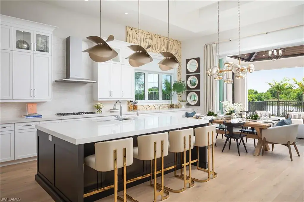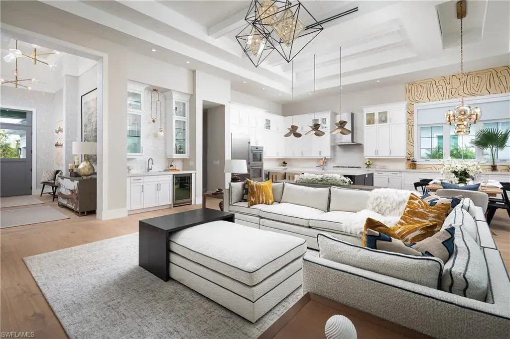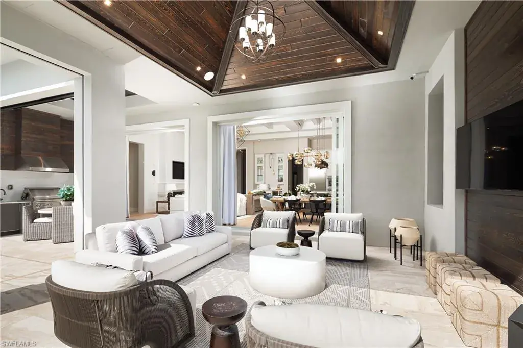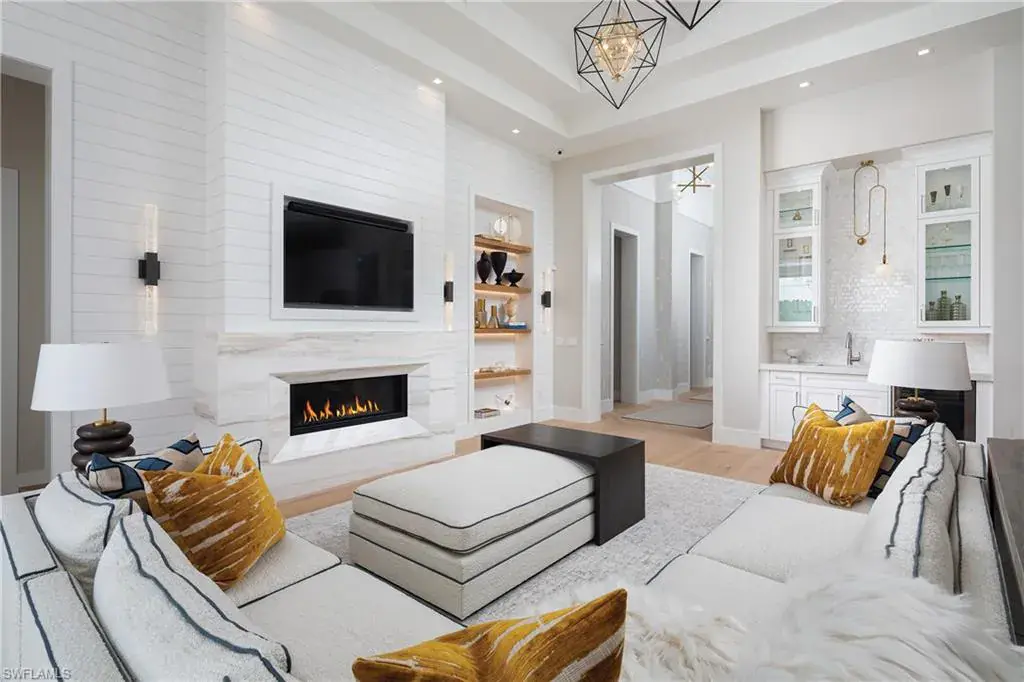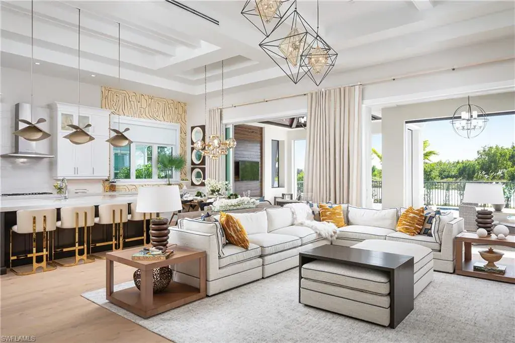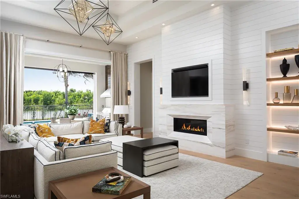 Magnificent, fully-furnished new home in the sought after Fiddler’s Creek village of Oyster Harbor. Award-winning interior design makes this home a jewel to behold with so many designer-selected finishes – custom millwork and built-ins, marble fireplaces, designer wallpaper, high-end lighting, custom art, window treatments and bespoke pillows and bedding throughout. Interior boasts soaring ceilings with shiplap, wide plank European white oak flooring, smooth drywall and an open floorplan that emphasizes a seamless transition to outdoor entertaining. The chef’s kitchen is outfitted with Thermador appliances, European style cabinets with double stacked uppers, walk-in pantry with built-ins, quartz counters and slab quartz backsplash. Multiple sliding doors open to the expansive covered outdoor living area featuring retractable screens, vaulted ceilings, TV, outdoor kitchen with built-in grill, custom pool and spa and marble pool deck. Home is finished with impact windows and doors, garage storage system and epoxy garage floor.