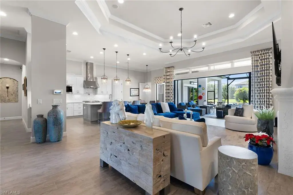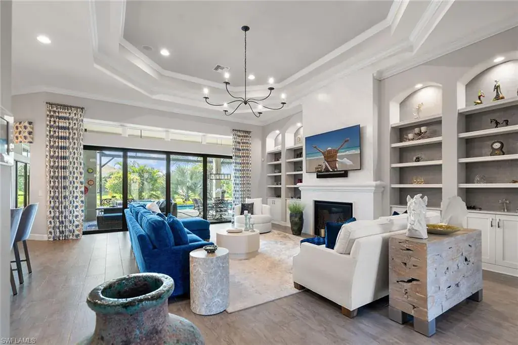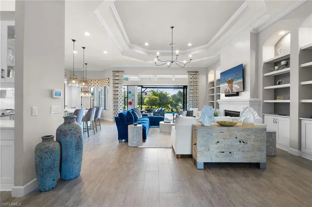 Welcome to this amazing five-bedroom plus den, five-bath, three-car garage home in quaint Oyster Harbor in award-winning Fiddler’s Creek. Light and bright open floor plan with luxury finishes in the living area, kitchen and dining room including tray ceilings, crown molding and custom fixtures. The formal dining room makes entertaining easy. The kitchen with upper-lit glass cabinets provides a gas cooktop, walk-in pantry, custom cabinets with lighting, stainless steel appliances and a large island with sink and separate beverage/wine cooler. The large primary bedroom is the place to relax with a sitting area, walk-in closets, en suite with dual sinks and a beautiful tiled walk-in shower. There are three first-floor guest rooms including a bonus room overlooking the canal that can be used as an extra den/office or a private suite for guests. This home also includes a second-floor bedroom with additional living space that could be used as a family room, game room or guest suite with en-suite bath and mini kitchen. Enjoy living on the expansive lanai featuring an outdoor kitchen with grill, sink, refrigerator and TV overlooking the custom sparkling pool, a waterfall feature, a spa with spill-over and serene lake views with the sunset. For added protection, the covered lanai is fitted with storm screen shades operated by remote control. Large laundry room with utility sink and cabinetry. New epoxy garage floor and air conditioner in the three-car garage. This home comes with Generac whole house generator which runs on natural gas. A luxury lifestyle is ensured in this residence enhanced by the 54,000-square-foot club and spa, fitness center complete with personal trainers, fitness classes, championship golf courses, six tennis courts with competitive teams, pickleball, bocce, social activities, jogging and bike paths, and casual and fine dining. Optional golf, beach and marina memberships are available. Fiddler’s Creek is close to Marco and Naples airports, beaches, shopping, restaurants, boating and quick access to Marco Island and Naples 5th Avenue.