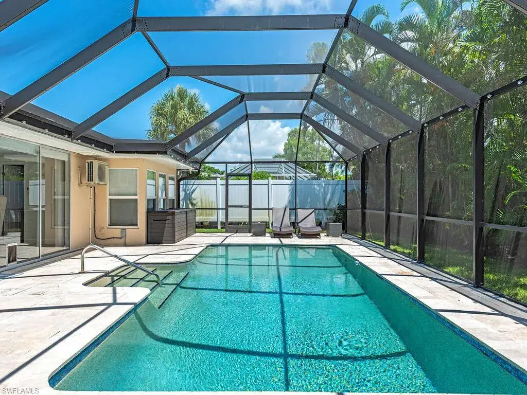 Discover this beautifully updated 3-bedroom, 2-bathroom home, ideally situated in the highly sought-after community of Palm River. Nestled on a spacious quarter-acre lot adorned with palm trees, this property features a brand-new roof, new air conditioning, a pristine pool with new equipment, and fresh landscaping—making it truly move-in ready.Step inside to find a bright, modern interior with an open floor plan and an additional room perfect for a den or study. The spacious bedrooms include a main bathroom with a double vanity, and the large galley kitchen boasts stainless steel appliances.Enjoy the atrium-covered pool area, perfect for outdoor living year-round. This home is just minutes from Naples’ stunning beaches and upscale outdoor shopping malls, offering an exceptional lifestyle for you and your family.