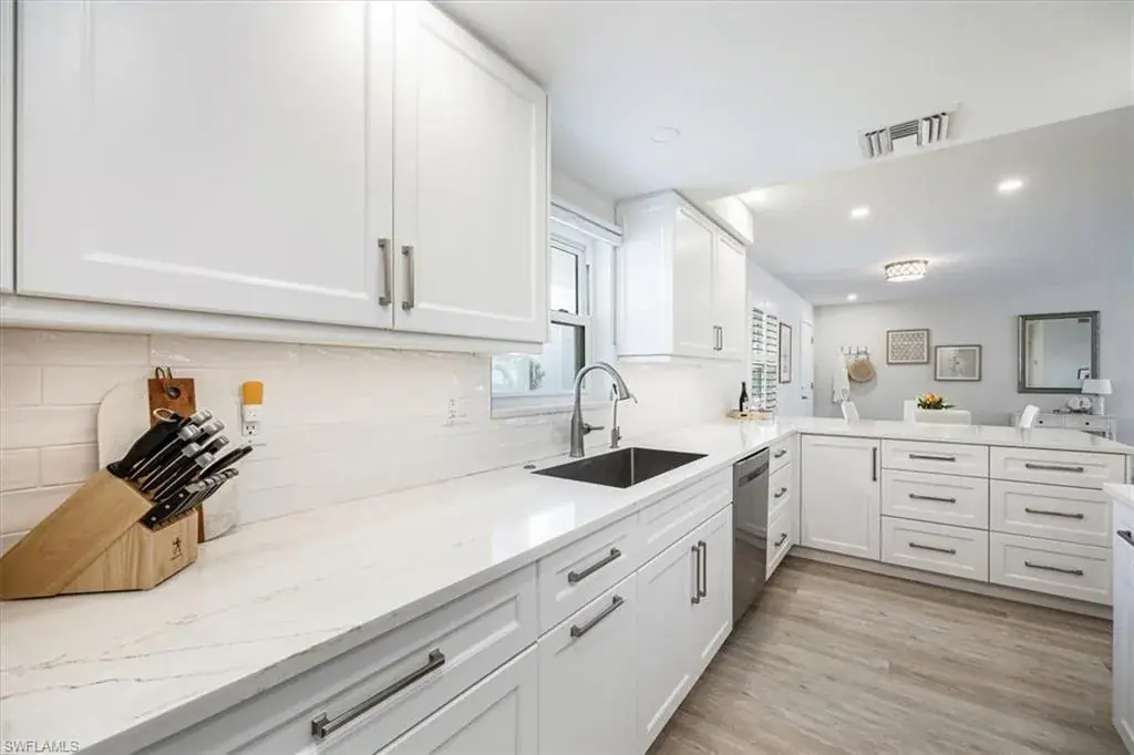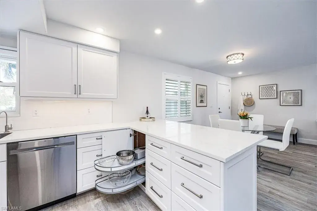 Welcome home to Park Place in Park Shore! Park Place is an intimate community of 22 residences located in the West of 41 highly coveted Park Shore community. This condo is completely renovated and conveniently located on the first floor, so there are no stairs to contend with. With approximately 1200 square feet of air conditioned living space you will enjoy large bedrooms and living space, as well as an additional 200 square feet of covered patio space AND a professionally landscaped, private fenced yard right out your back door. This is so rare as it allows for complete privacy. You are not looking out over the street or into your neighbor’s lanai. This property has two large bedrooms and two full bathrooms, both with walk-in showers. The home centers around the chef’s kitchen with light quartz countertops, white cabinetry, stainless steel appliances and an abundance of counter and storage space. If you think the ceilings feel taller than comparable properties, you are correct. They were raised up wherever it was possible to do so. Other features include solid surface flooring throughout (no carpet), new linear AC vents, updated 4 inch recessed lights, window treatments (plantation shutters, draperies and black out shades in the primary bedroom), new French doors, a new water heater (2024) and new wood-plank tile on the patio. You will enjoy one covered carport parking spot adjacent to your condo. Park Place has a community pool and a community grilling area. The community allows for 3 rentals per year with a 60 day minimum for each rental. They do not allow pets and at least one owner must be 55 or over. Residents love Park Shore for it’s central, walkable location. From Park Place you can walk to both Publix and Fresh Market, as well as to numerous shops and restaurants. Residents have the option to join the private, members-only Park Shore Beach (with a beautiful park, tons of private parking, bathrooms and outdoor showers) and they can walk or bike to Venetian Village, which is home to numerous waterfront restaurants and boutiques. The Park Shore neighborhood is an active community where residents are seen out and about on walks and bike rides to the beach or around their beautiful neighborhood. Park Shore residents are also able to purchase a resale boat slip at Venetian Bay Yacht Club.