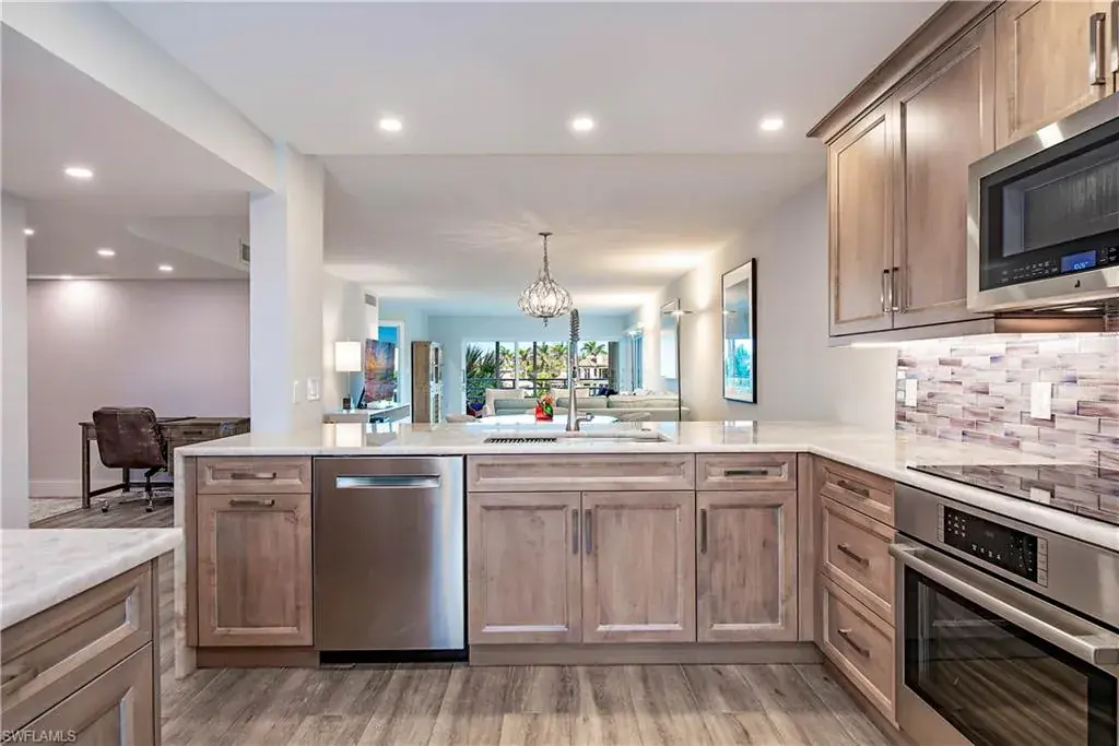 Welcome to the epitome of luxury waterfront living in this exquisitely updated third-floor residence at the prestigious Park Shore Landings. Offering sweeping, unobstructed views of Venetian Bay, this stunning condominium invites you to bask in warm coastal breezes from its open-air balcony, capturing the essence of Naples’ elite coastal lifestyle. Thoughtfully remastered with unparalleled sophistication, the property showcases the finest custom finishes, including state-of-the-art Bosch kitchen appliances, a full-size Asko washer and dryer, a U-Line commercial-grade wine refrigerator, and elegant quartzite countertops throughout. Elevated ceiling heights and impact-resistant glass provide both architectural grandeur and peace of mind. The thoughtfully designed floor plan encompasses two bedrooms, a versatile den, two bathrooms, and 1,630 square feet of impeccable living space, highlighting refined elegance and meticulous attention to detail. Enhancing the offering, this residence includes a deeded, covered parking space, an assigned boat slip, and ample storage for ultimate convenience. Park Shore Landings further elevates its appeal with exceptional amenities, such as a pool, spa, social room, library, and kayak storage & launch facilities. Recent enhancements, including the 2022 reconstruction of the boardwalk, seawall, and 36 boat docks, underscore the community’s commitment to excellence. Located just steps from Venetian Village, and a short drive from Waterside Shops, Artis-Naples, Mercato, and the celebrated dining and shopping districts of 5th Avenue South and 3rd Street South, this residence perfectly balances tranquility and vibrant urban access. Owners of Park Shore Landings also have the exclusive opportunity to join the private Park Shore Beach, offering an unmatched coastal lifestyle. This extraordinary residence is a testament to opulence, sophistication, and the seamless blend of luxury and coastal charm that defines Naples’ premier living.