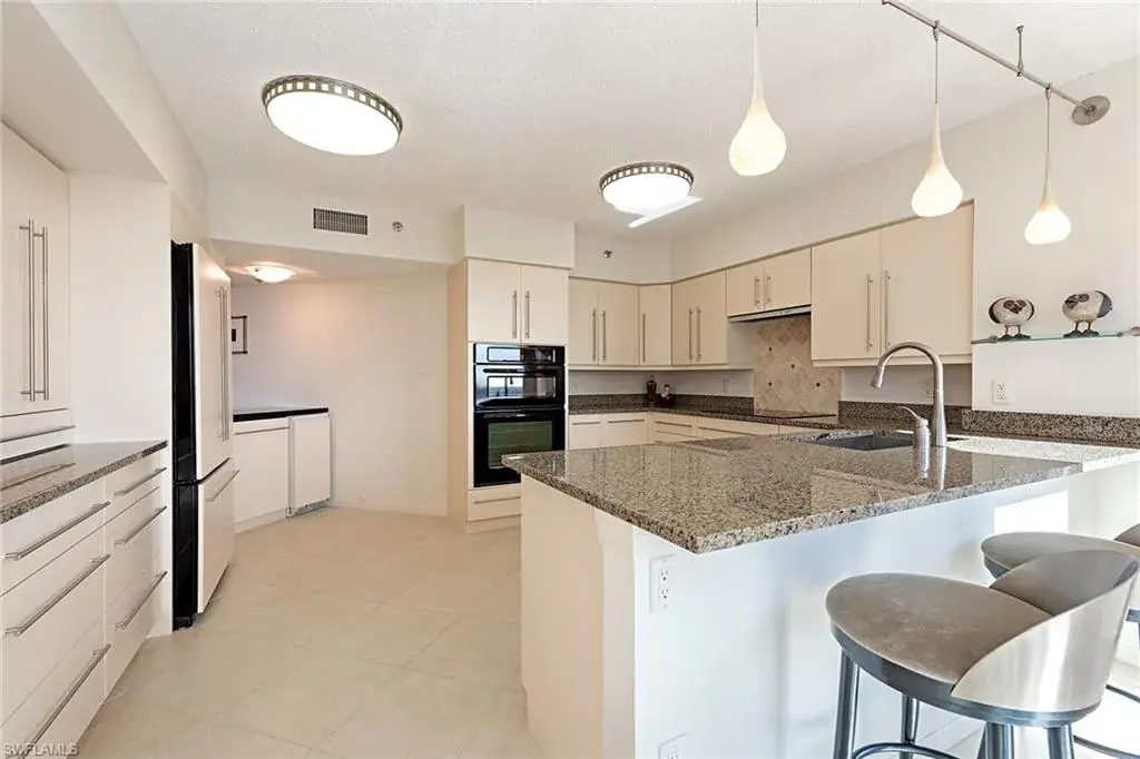 Light, bright and spacious, this two-bedroom plus den, three-bath Gulf front condominium encompasses 2,405 square feet of interior space. The gourmet kitchen has ample storage and a cozy nook capturing stunning Venetian Bay views. The large primary suite features a generous-sized bath with separate tub and shower, walk-in closet and a private northeast-facing lanai, the ideal setting for morning coffee. The large guest suite has a full bath and walk-in closet plus a window nook ideal for a built-in desk. The den, with a custom built-in, could easily be converted to a third bedroom. Additional features include a laundry room, crown molding, double-door entry and more. The expansive, southwest-facing, screen-free lanai is wonderful for enjoying the Gulf views, Venetian Bay and sunsets. Park Shore Tower has a 24-hour attendant, welcoming lobby, large fitness club, two-bedroom guest apartment, bicycle storage, and a recently upgraded and stunning pool area with a beachside clubhouse. Go to the charming Venetian Bay Village across the street for dining, shopping and entertainment. Venetian Bay Yacht Club offers boat slips for sale or lease for Park Shore residents.